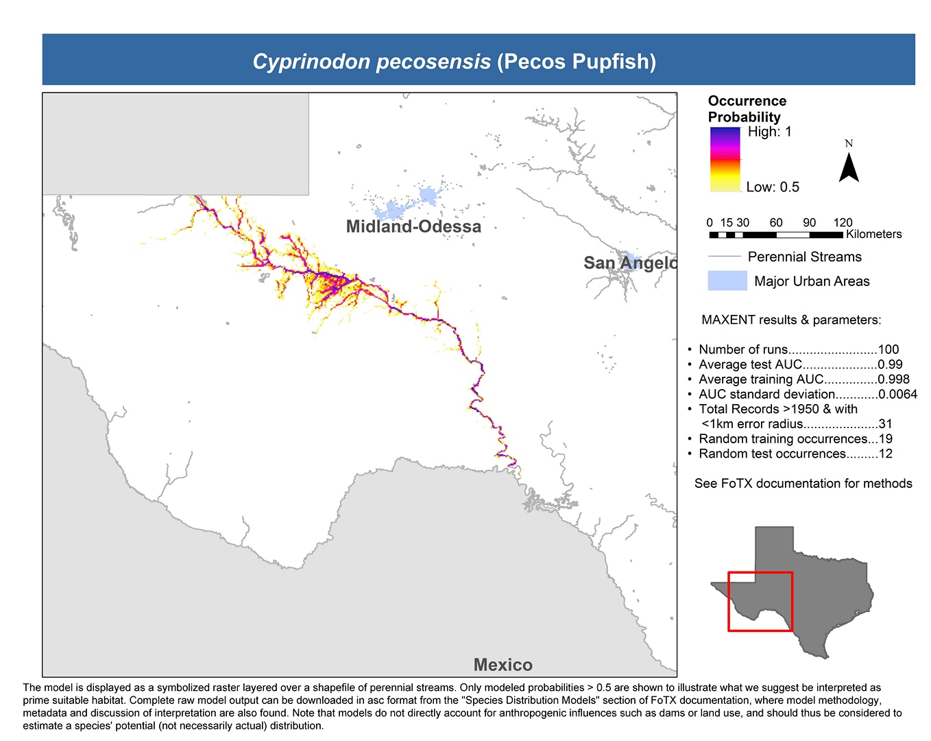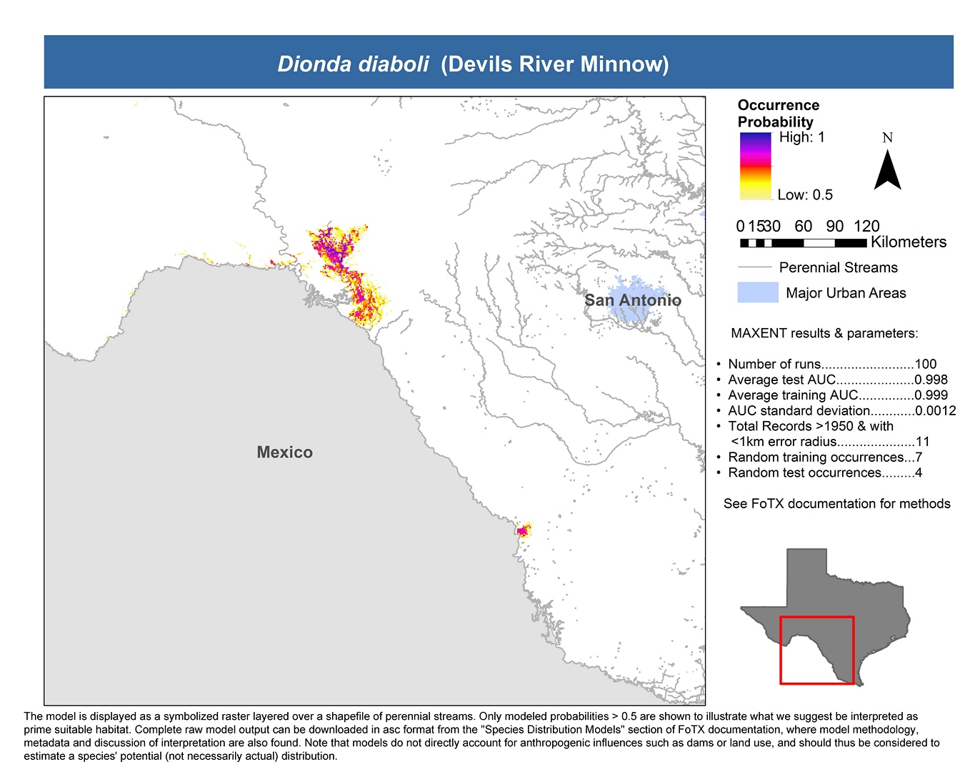 | Cyprinidae | Dionda | diaboli | 01 | zip | jpg | txt | This taxon has been revised in more recent versions of the project data and model results depicted in class 01 models should be considered with that in mind. |