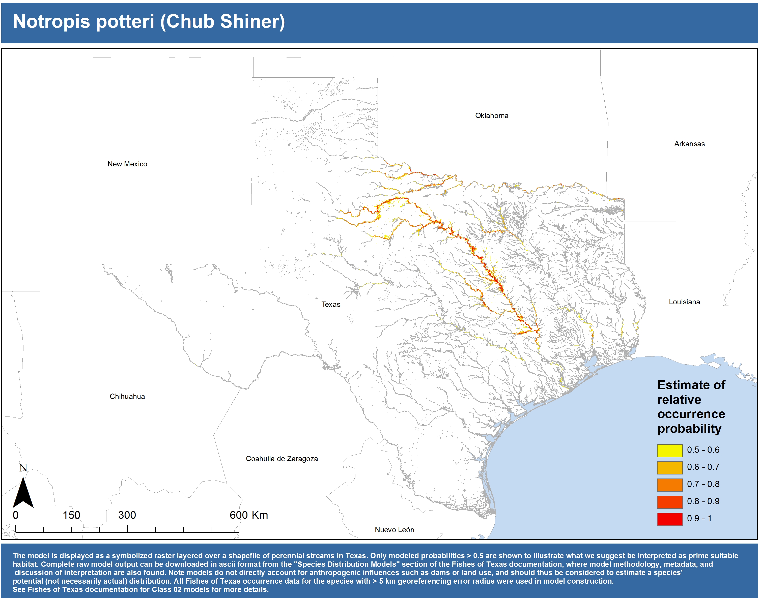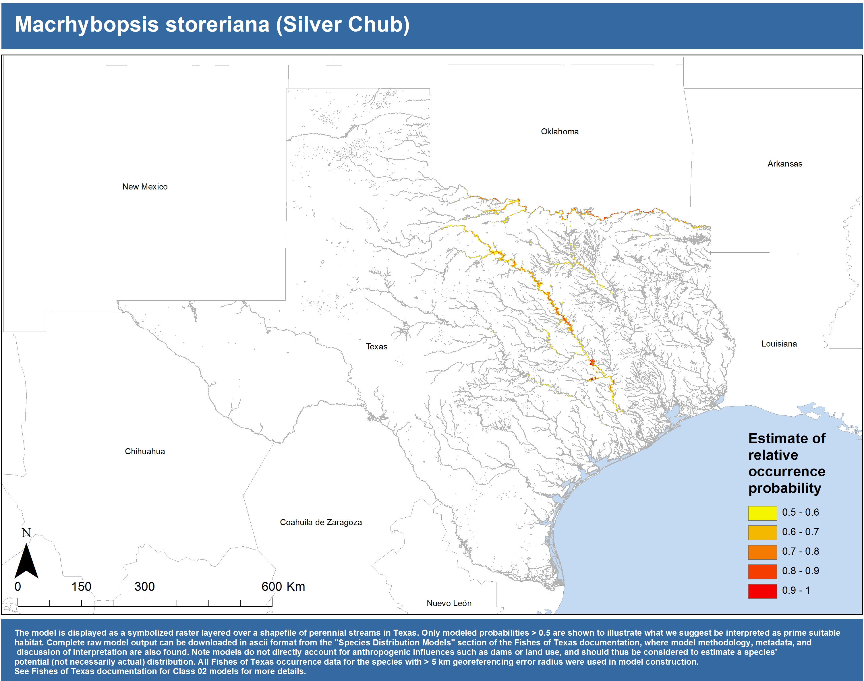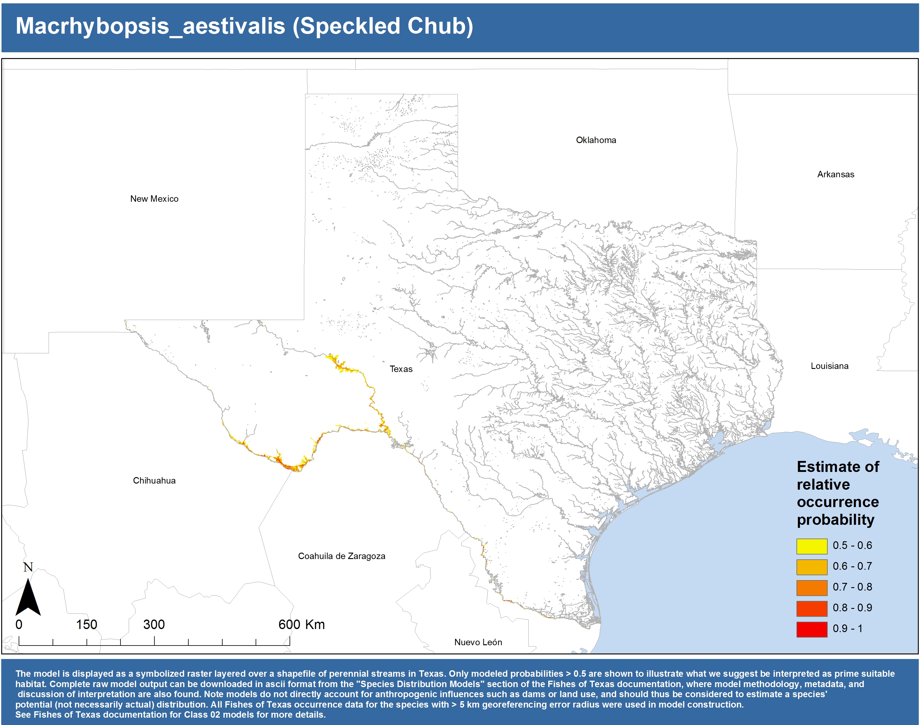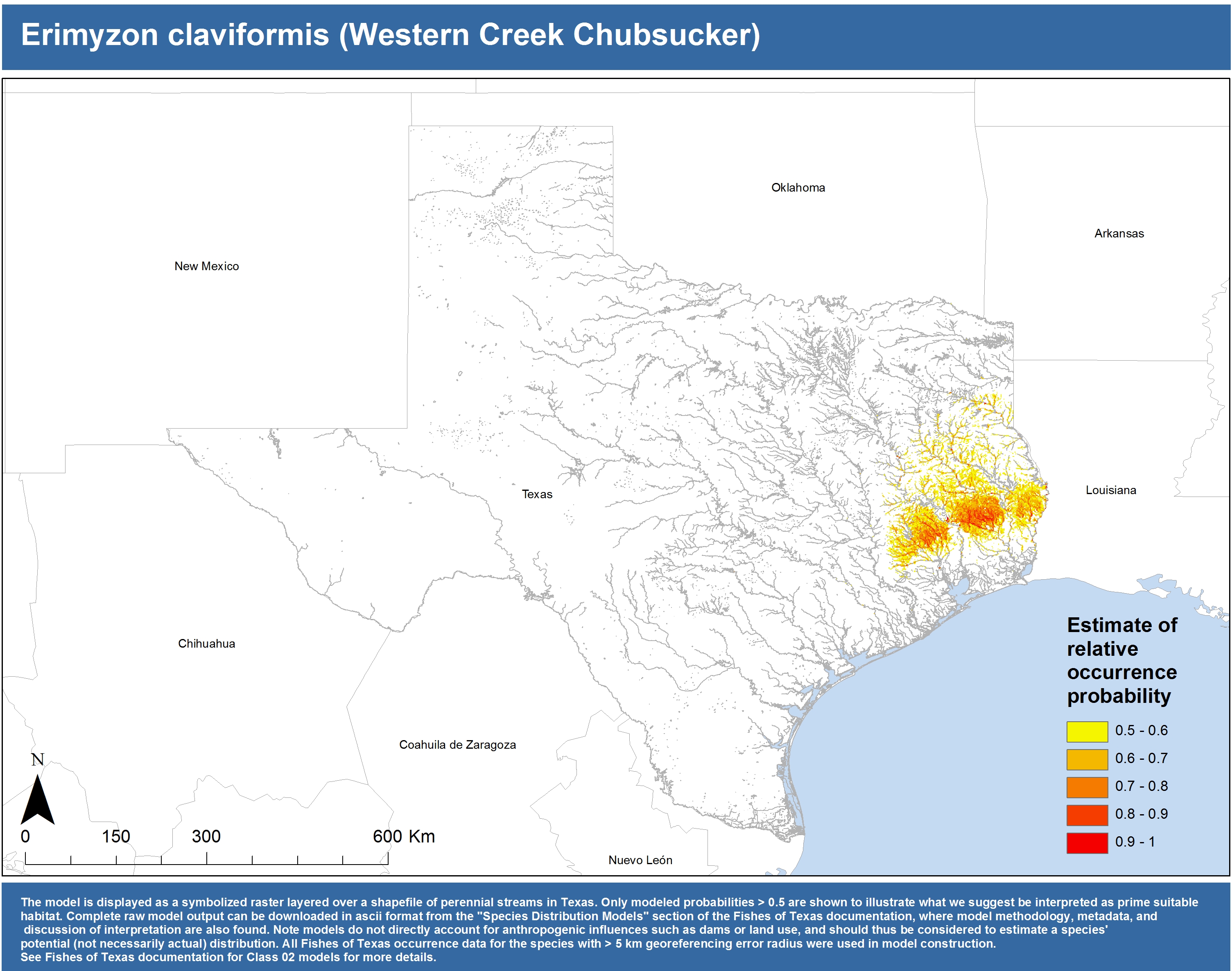 | Catostomidae | Cycleptus | elongatus | 02 | zip | jpg | This model combined records from C. elongatus with C. sp. within the Rio Grande basin. Note the lack of Colorado Records within the FoTX database cause low probabilities within that basin. | Blue Sucker |