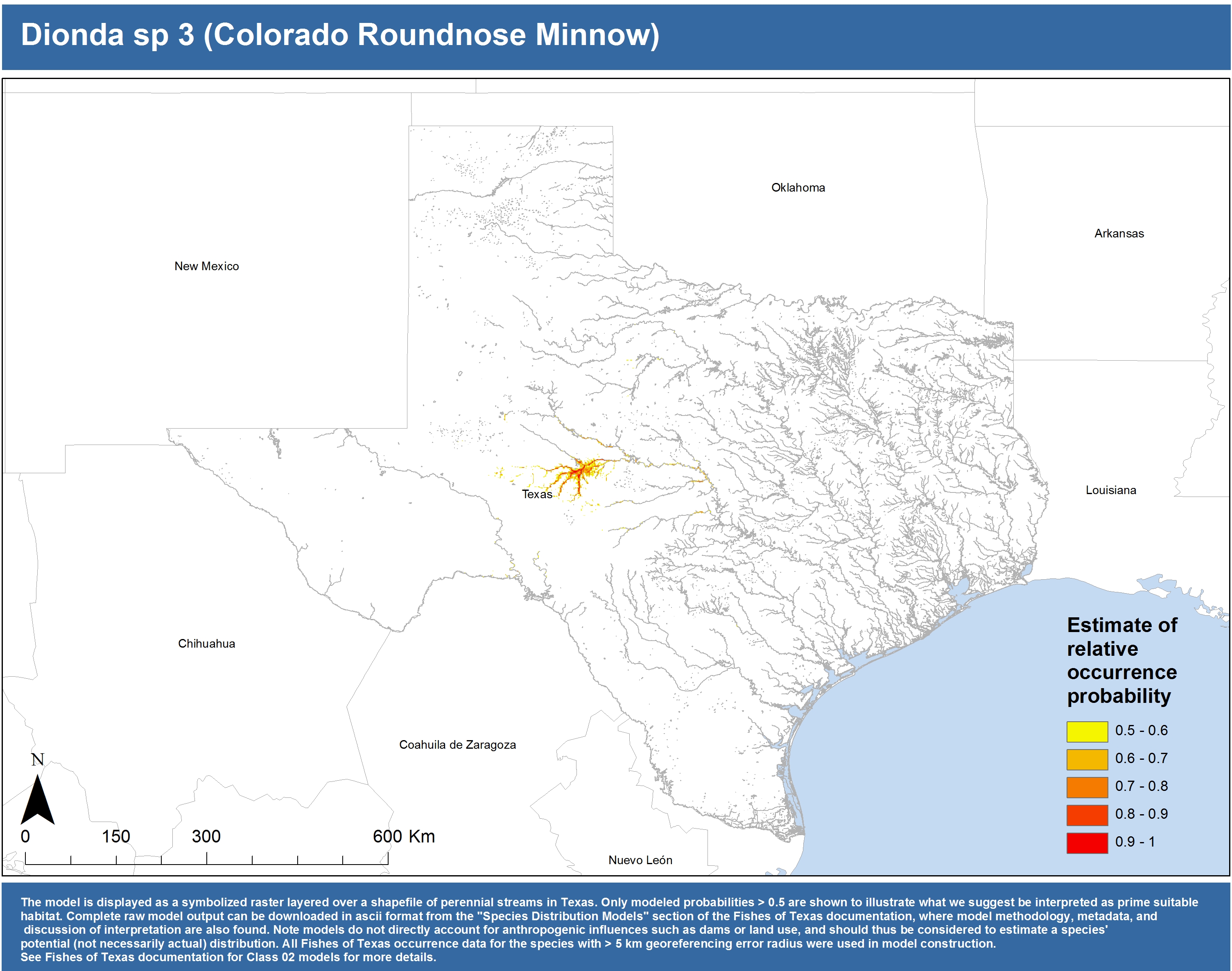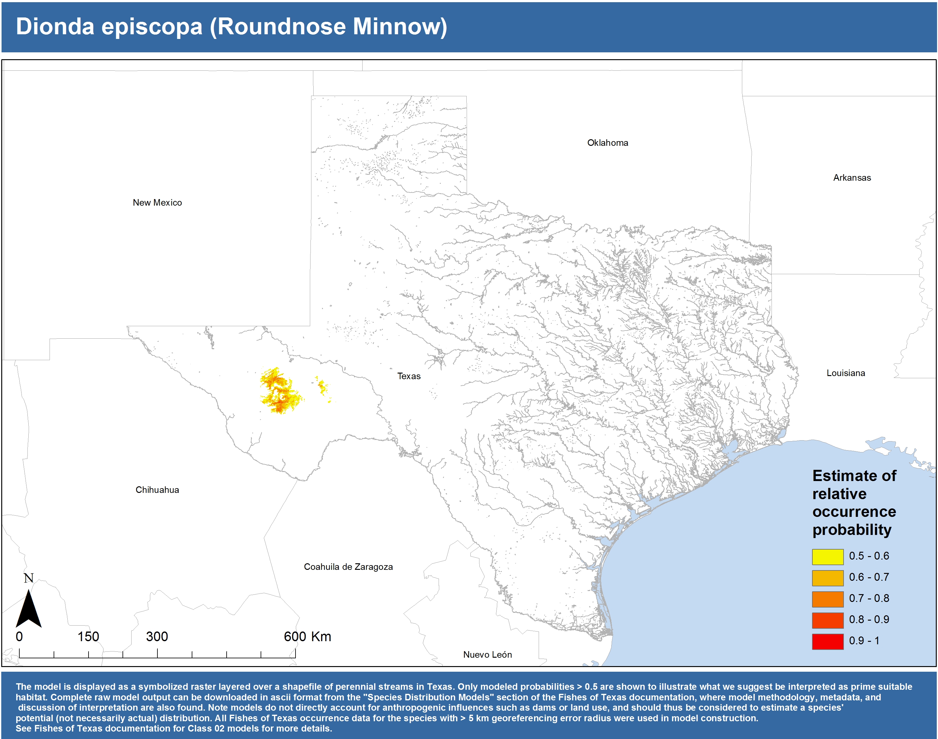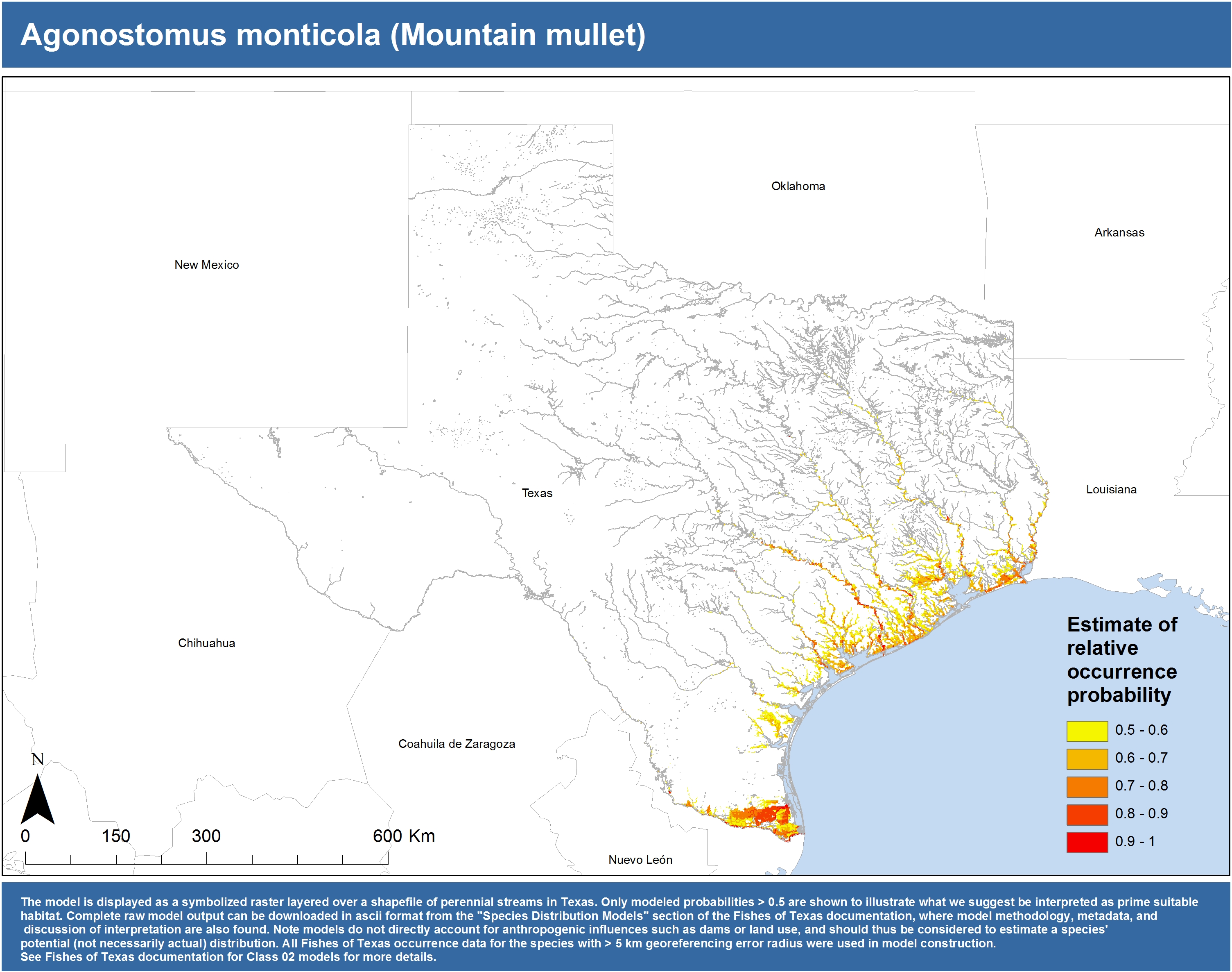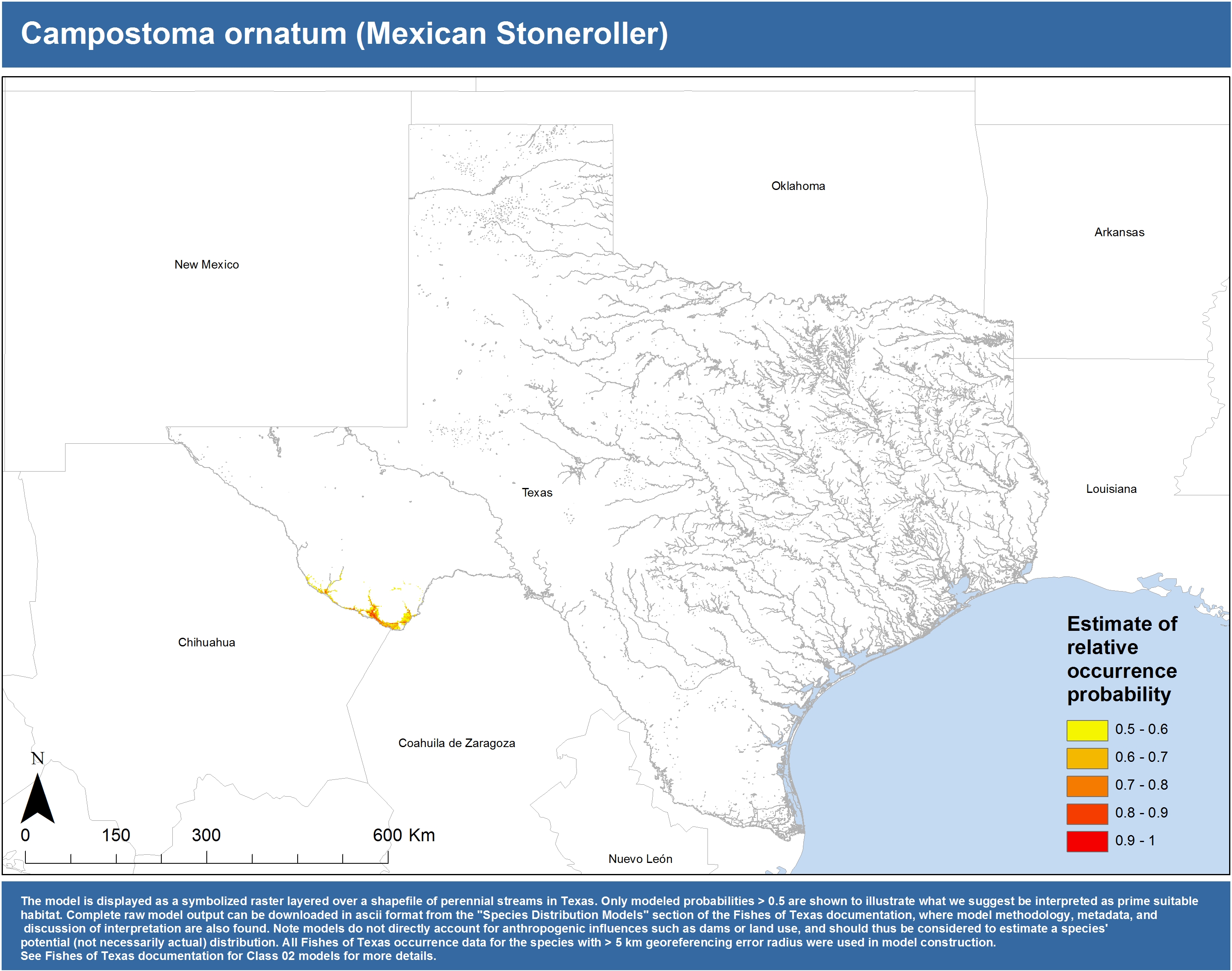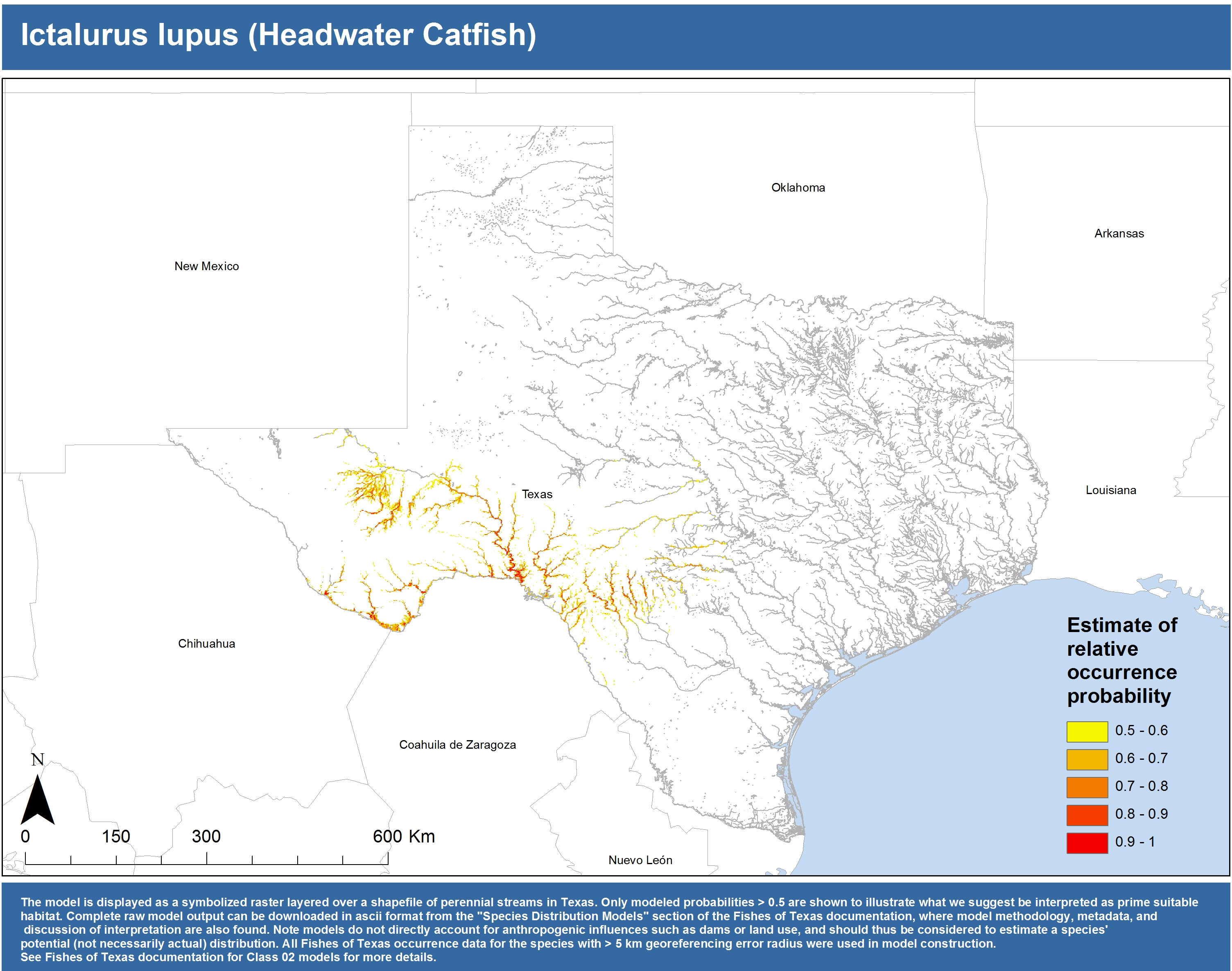 | Catostomidae | Cycleptus | elongatus | 02 | zip | jpg | This model combined records from C. elongatus with C. sp. within the Rio Grande basin. Note the lack of Colorado Records within the FoTX database cause low probabilities within that basin. | Blue Sucker |