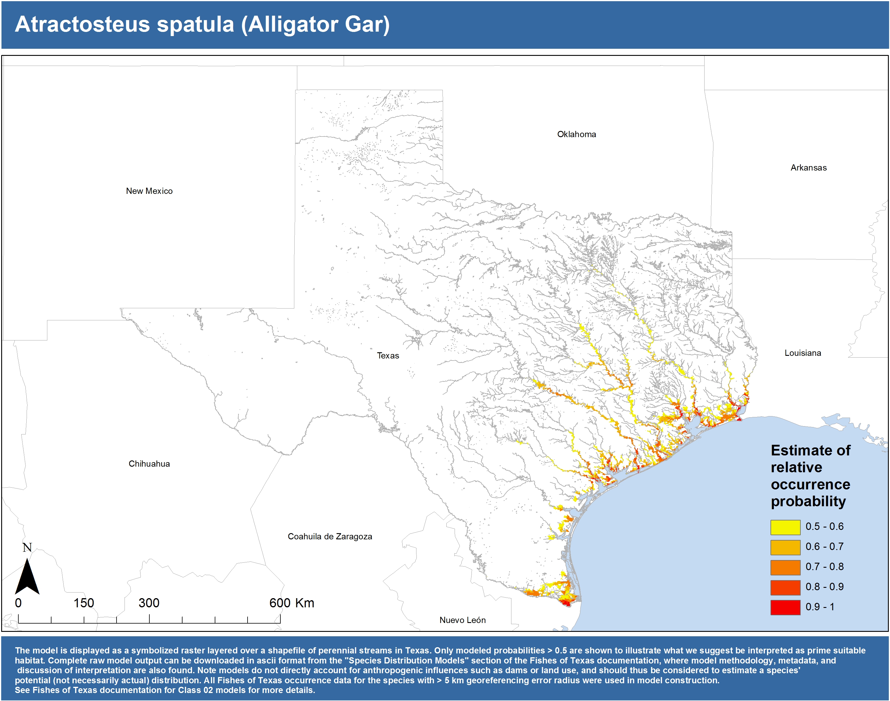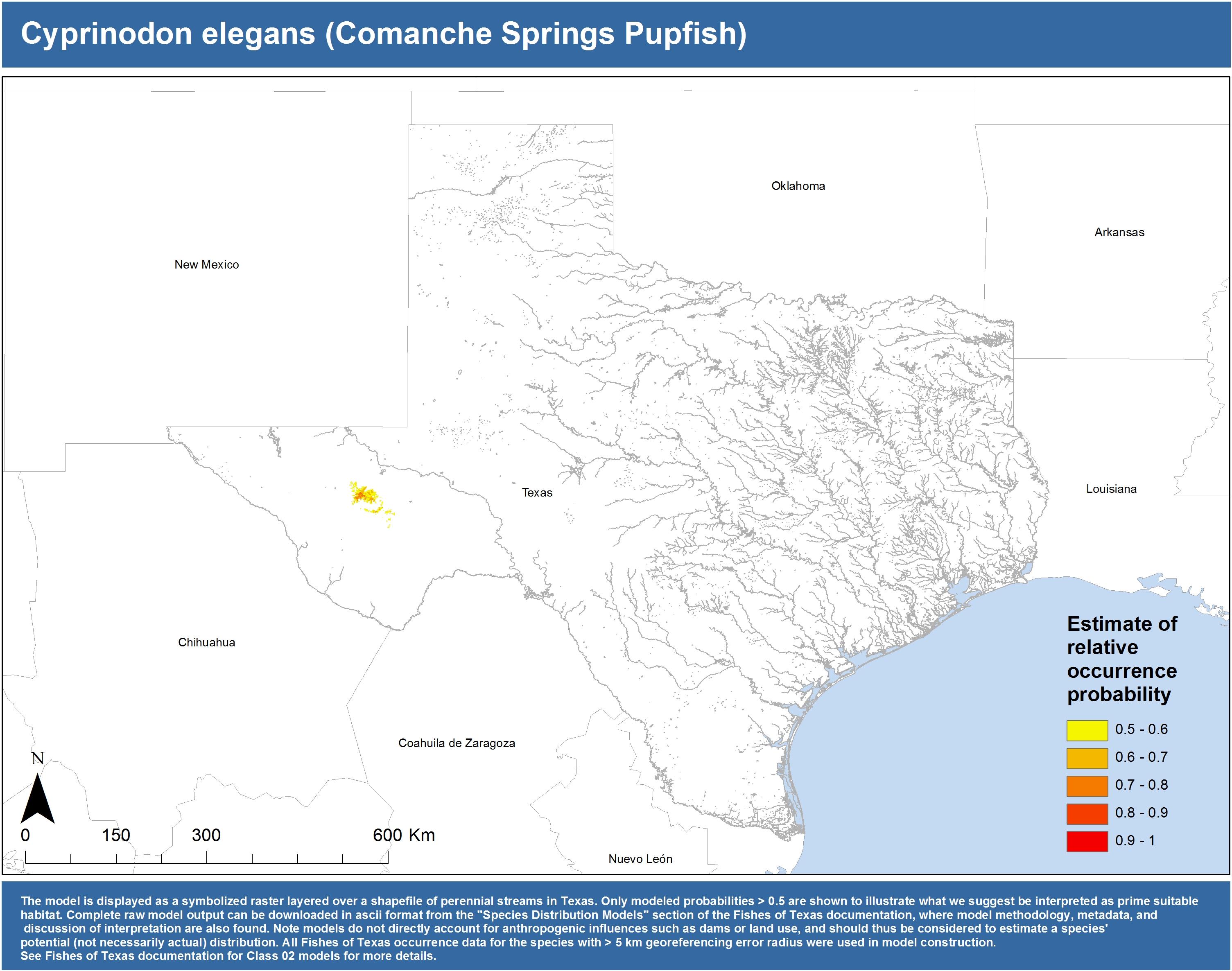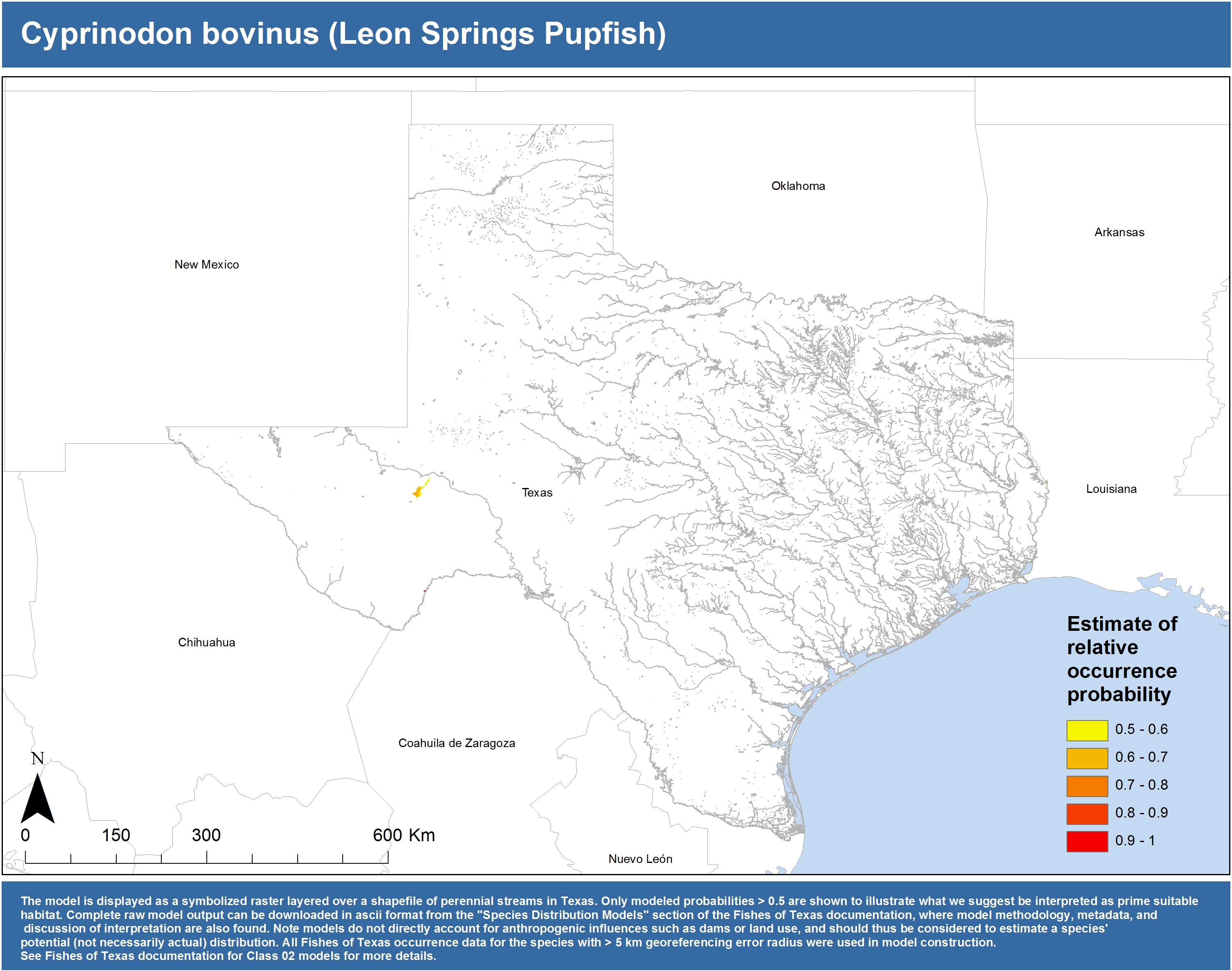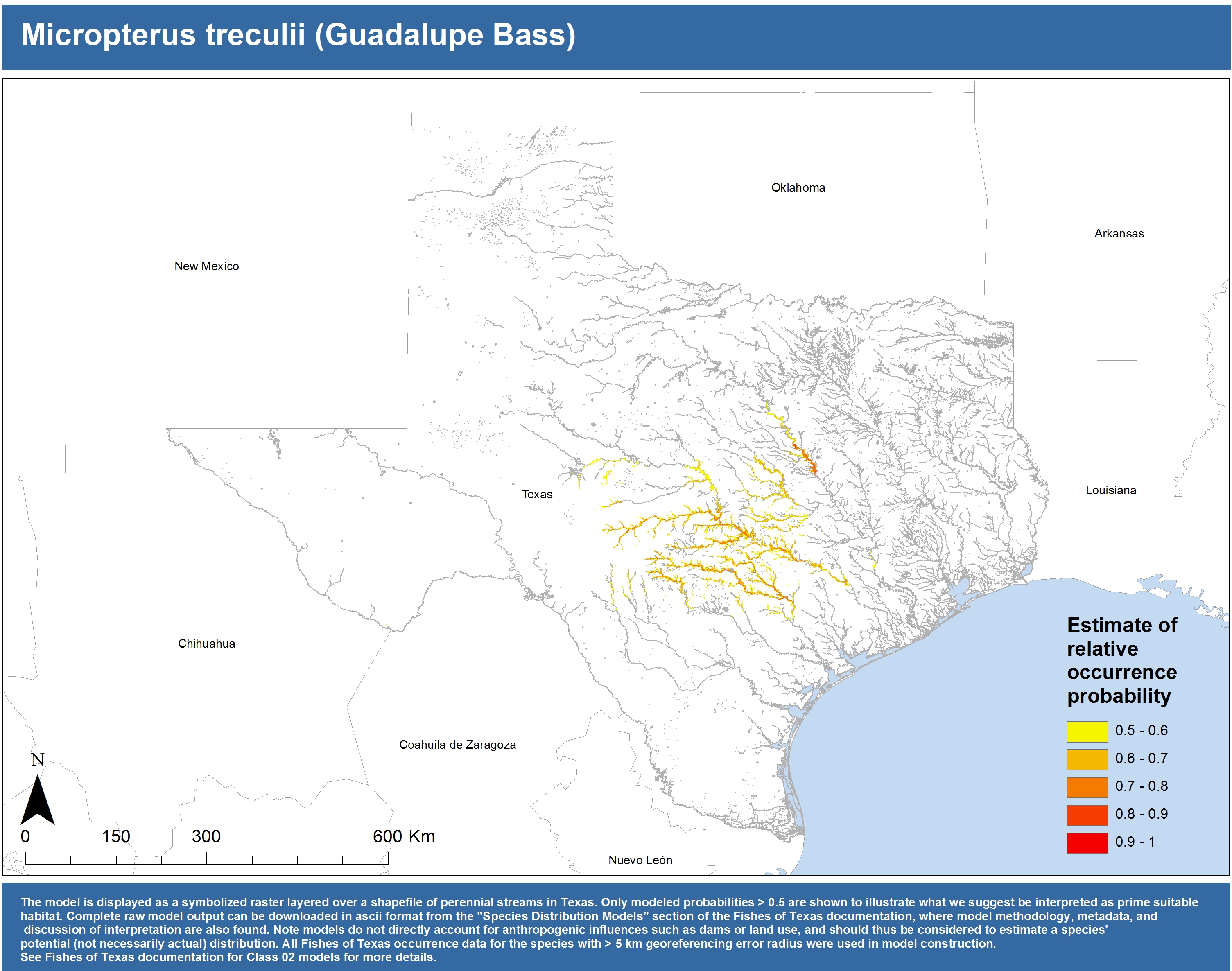 | Catostomidae | Cycleptus | elongatus | 02 | zip | jpg | This model combined records from C. elongatus with C. sp. within the Rio Grande basin. Note the lack of Colorado Records within the FoTX database cause low probabilities within that basin. | Blue Sucker |