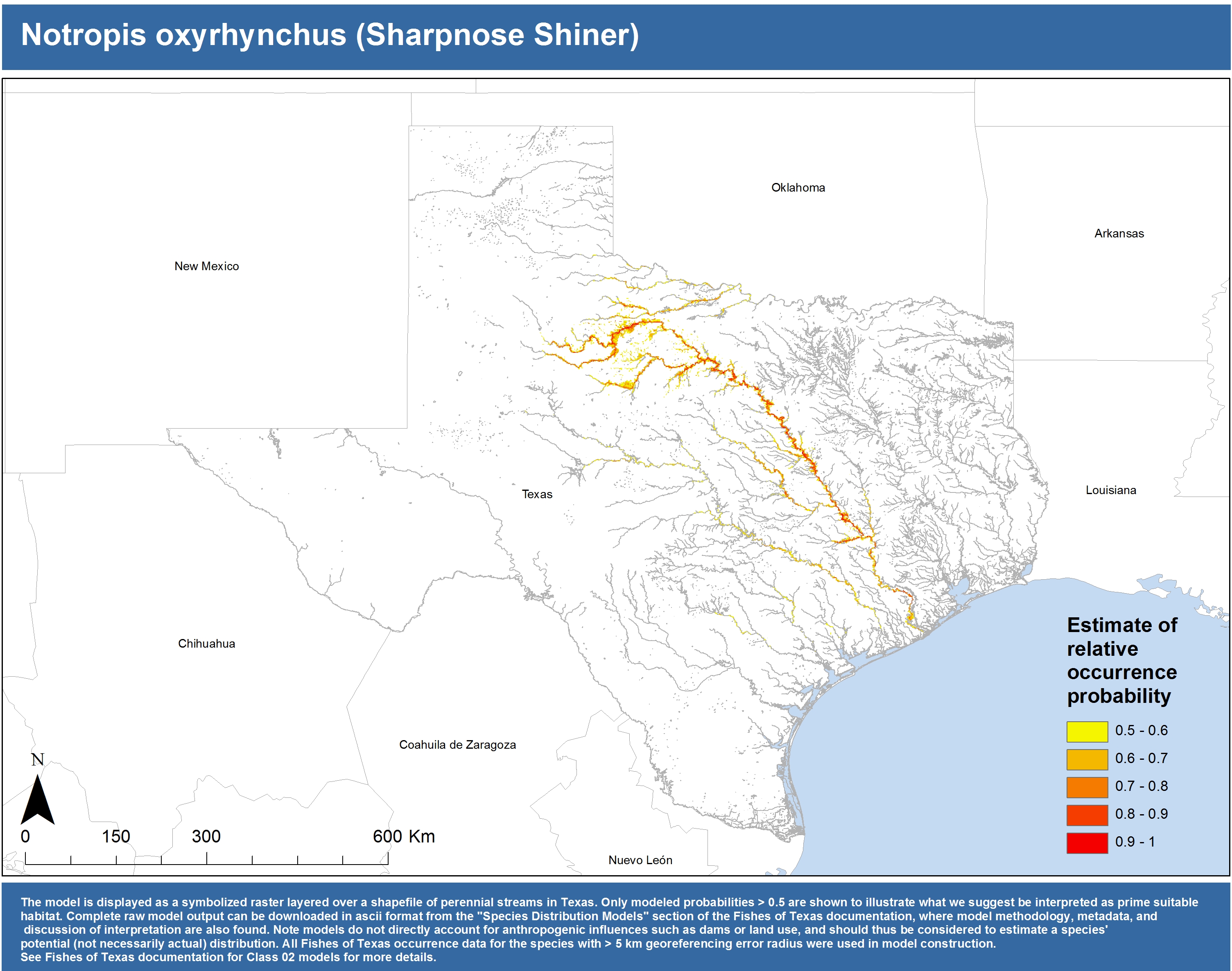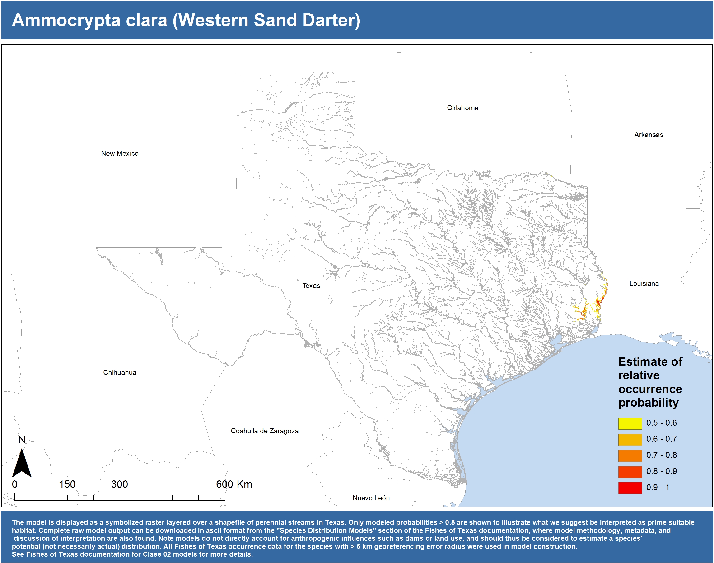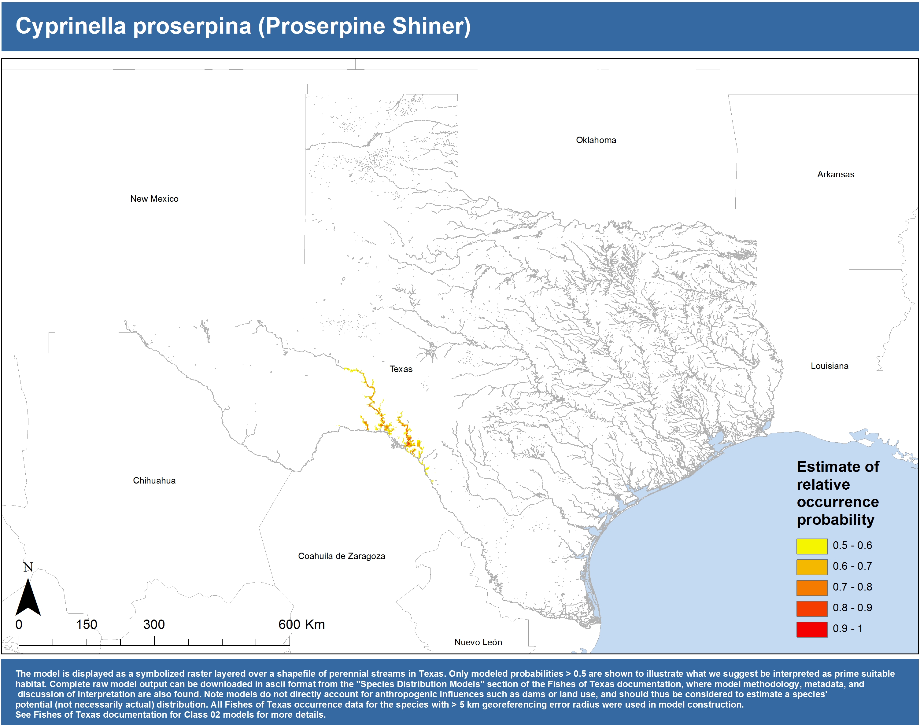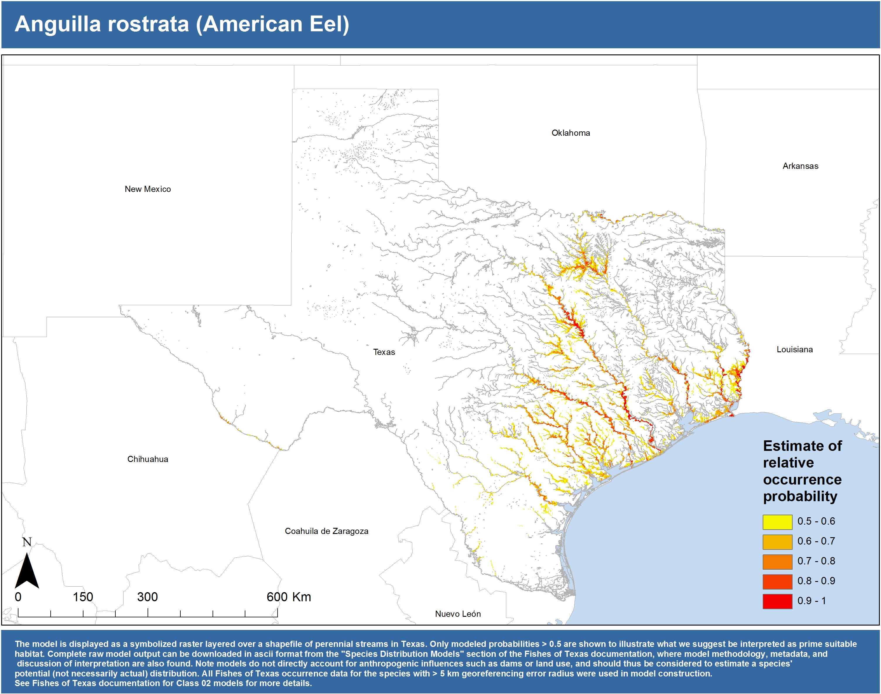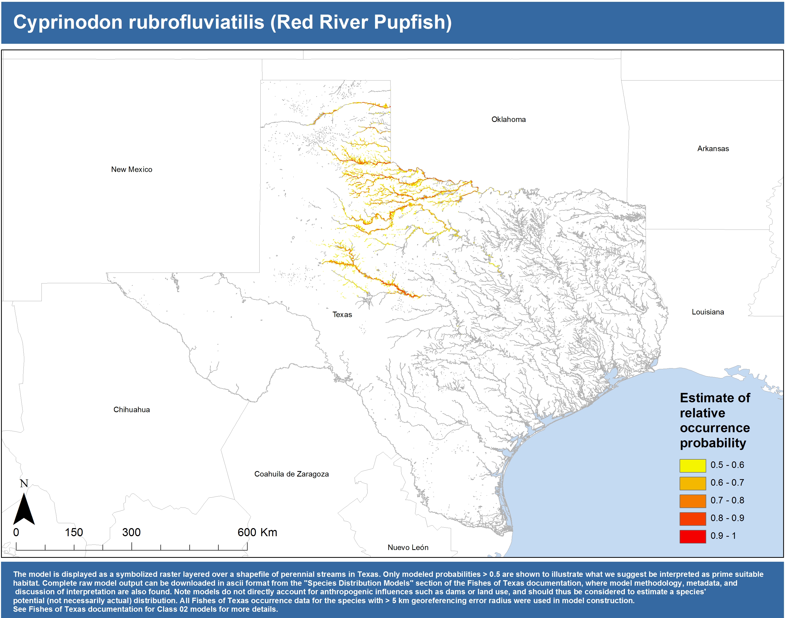 | Catostomidae | Cycleptus | elongatus | 02 | zip | jpg | This model combined records from C. elongatus with C. sp. within the Rio Grande basin. Note the lack of Colorado Records within the FoTX database cause low probabilities within that basin. | Blue Sucker |