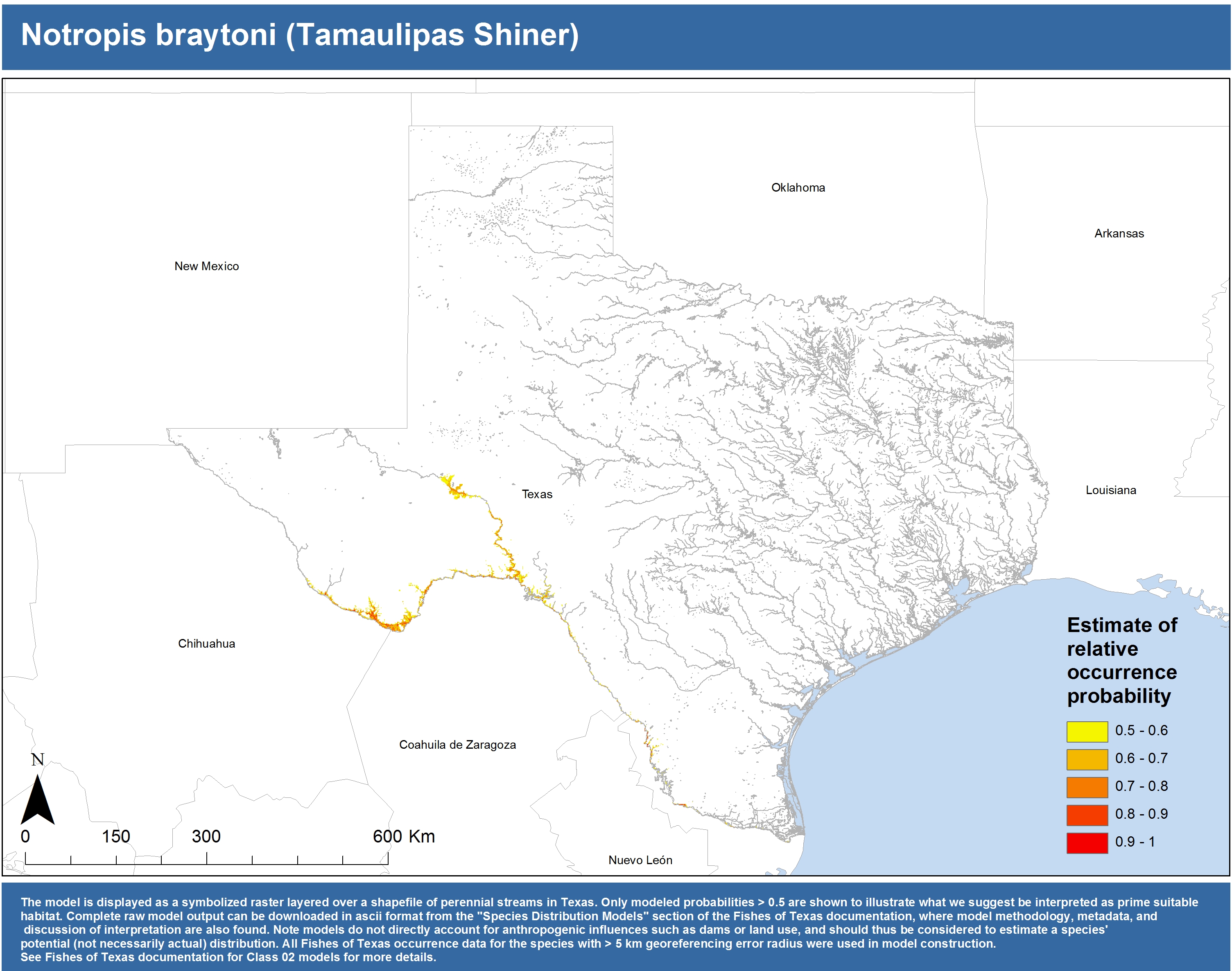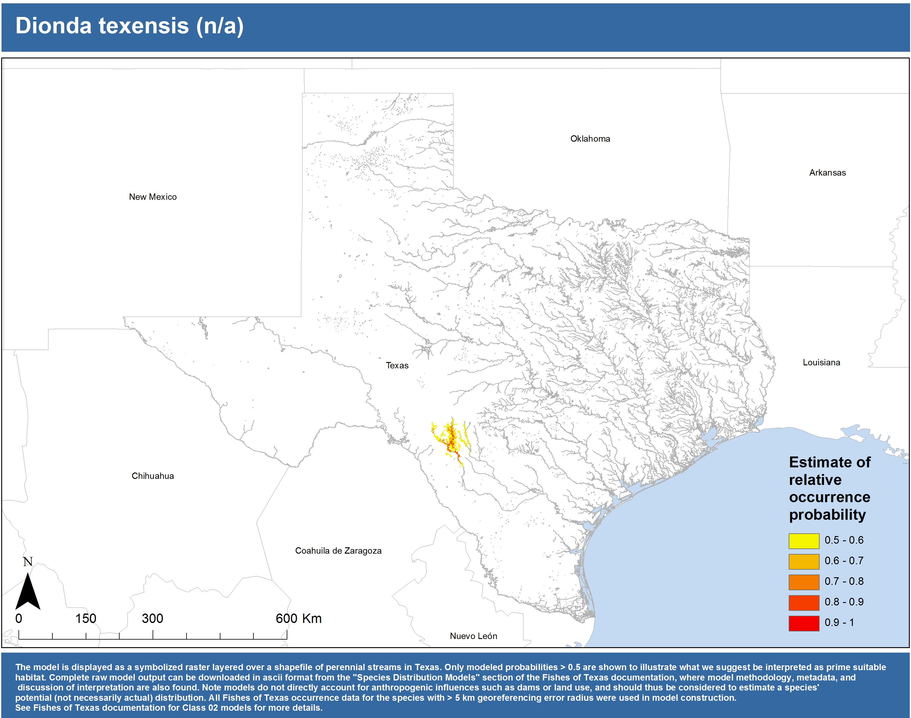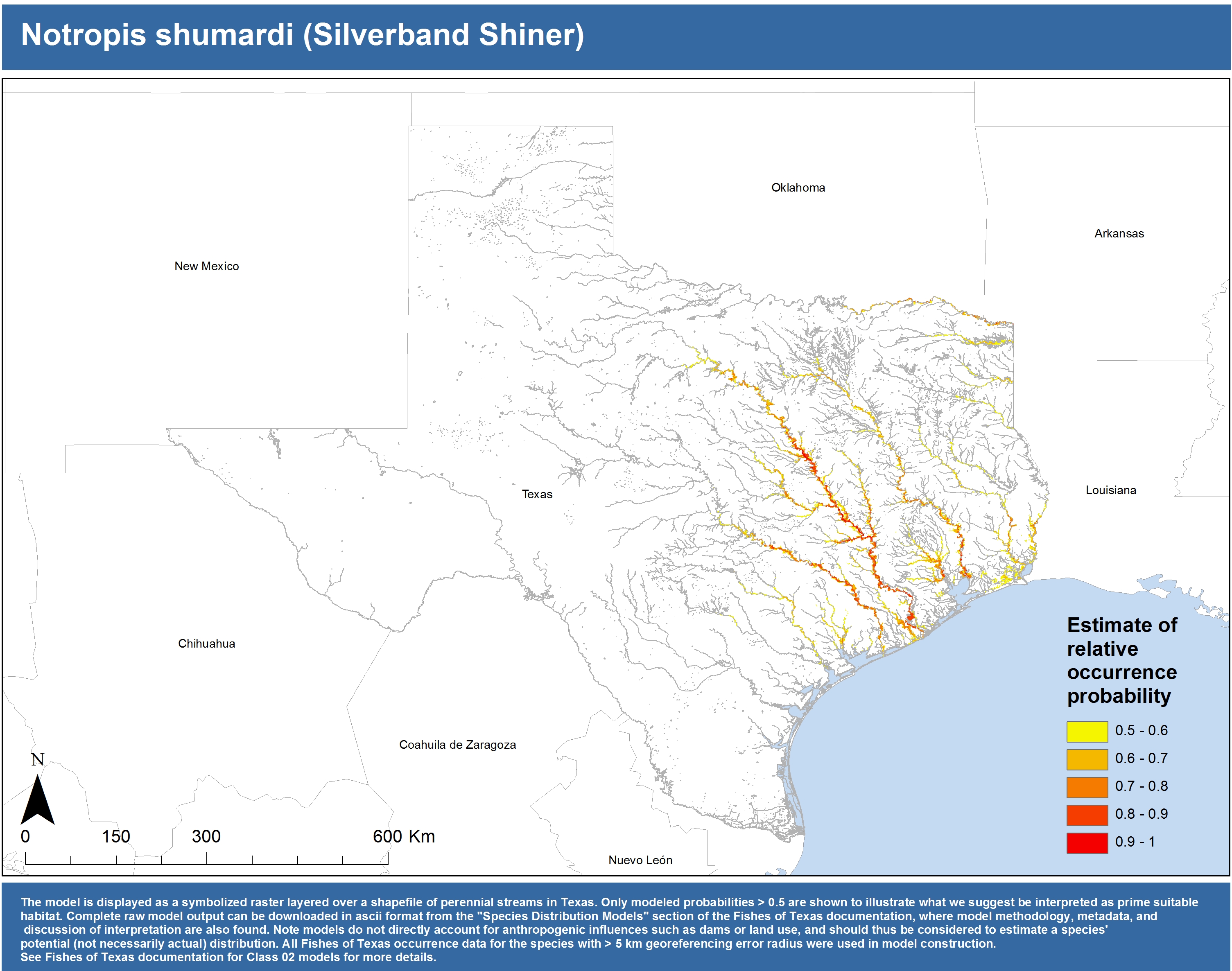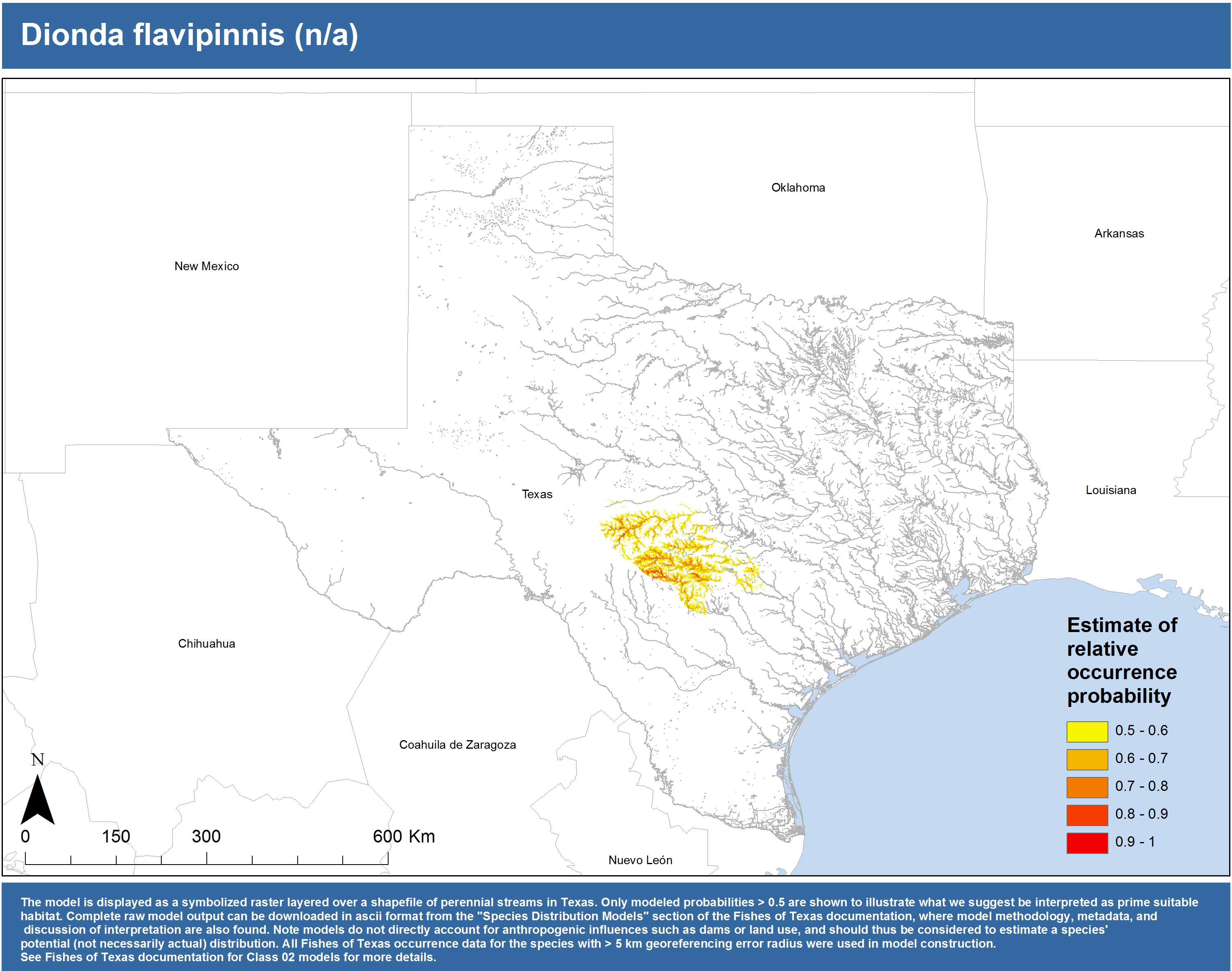 | Catostomidae | Cycleptus | elongatus | 02 | zip | jpg | This model combined records from C. elongatus with C. sp. within the Rio Grande basin. Note the lack of Colorado Records within the FoTX database cause low probabilities within that basin. | Blue Sucker |