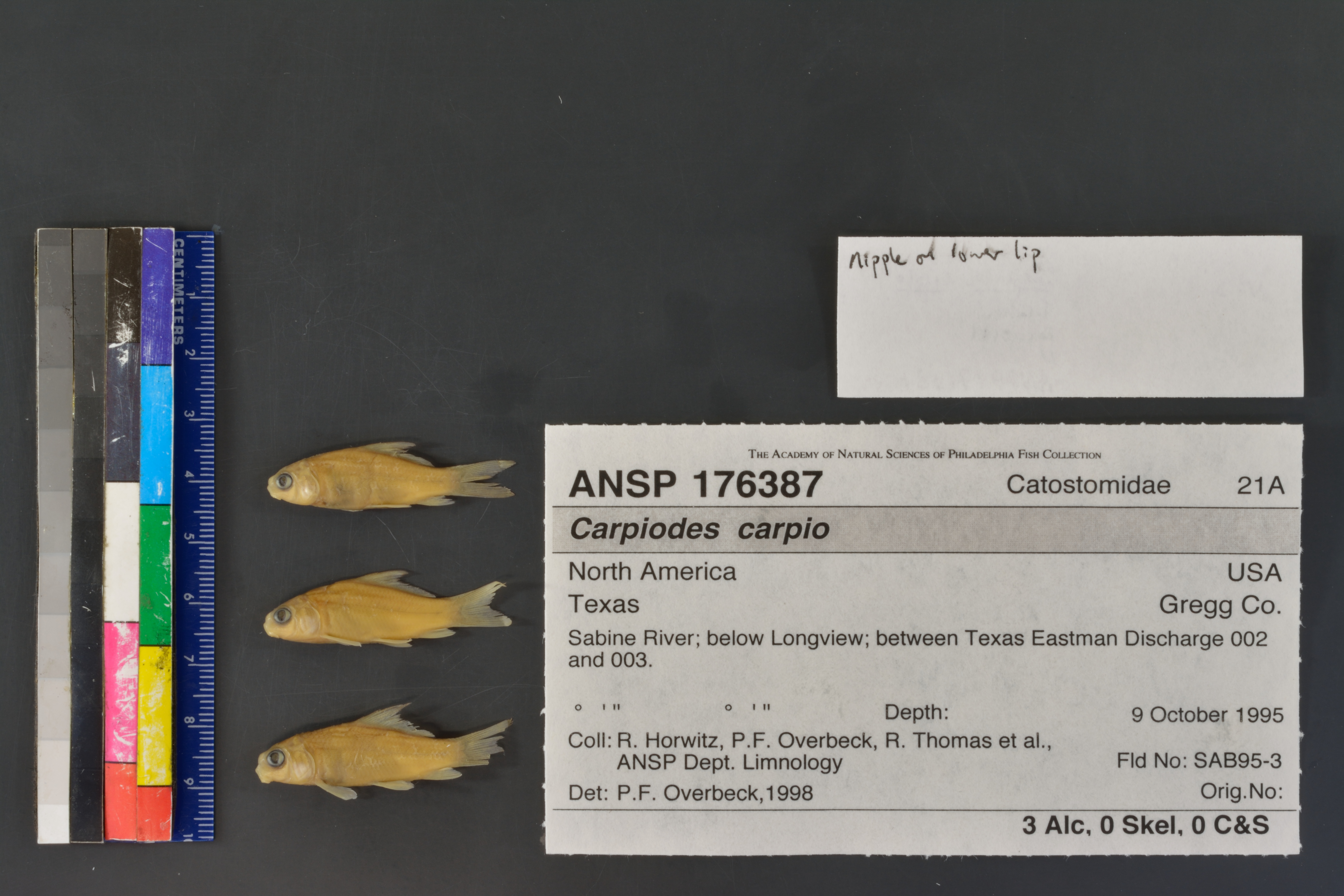 Specimen examined and Id'ed for FoTX project. | specimens small, but nipple on lower lip is apparent and subopercle is triangular