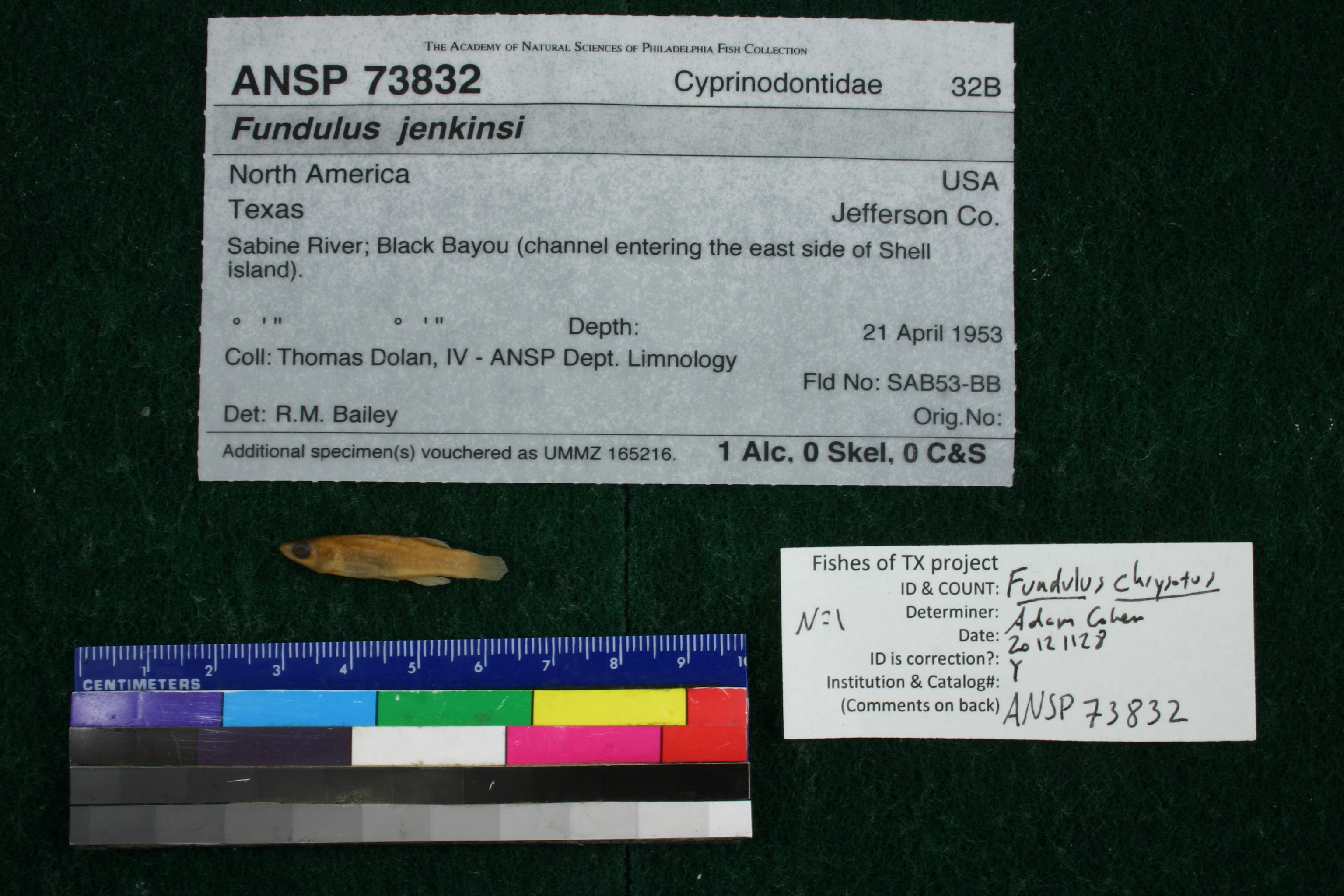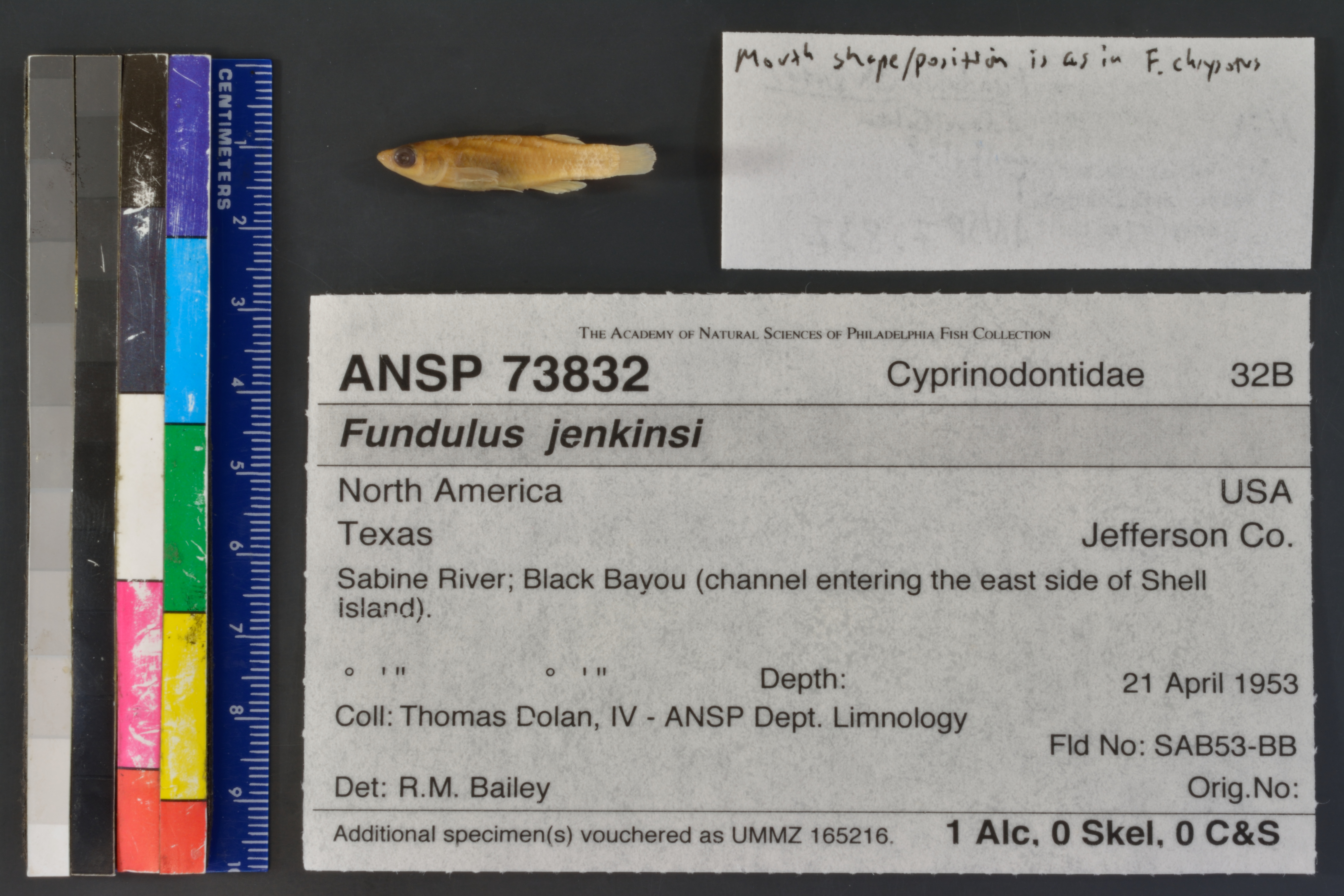Specimen examined and Id'ed for FoTX project. | mouth shape and position is as in F. chrysotus, not as in F.jenkinsi as previously identified