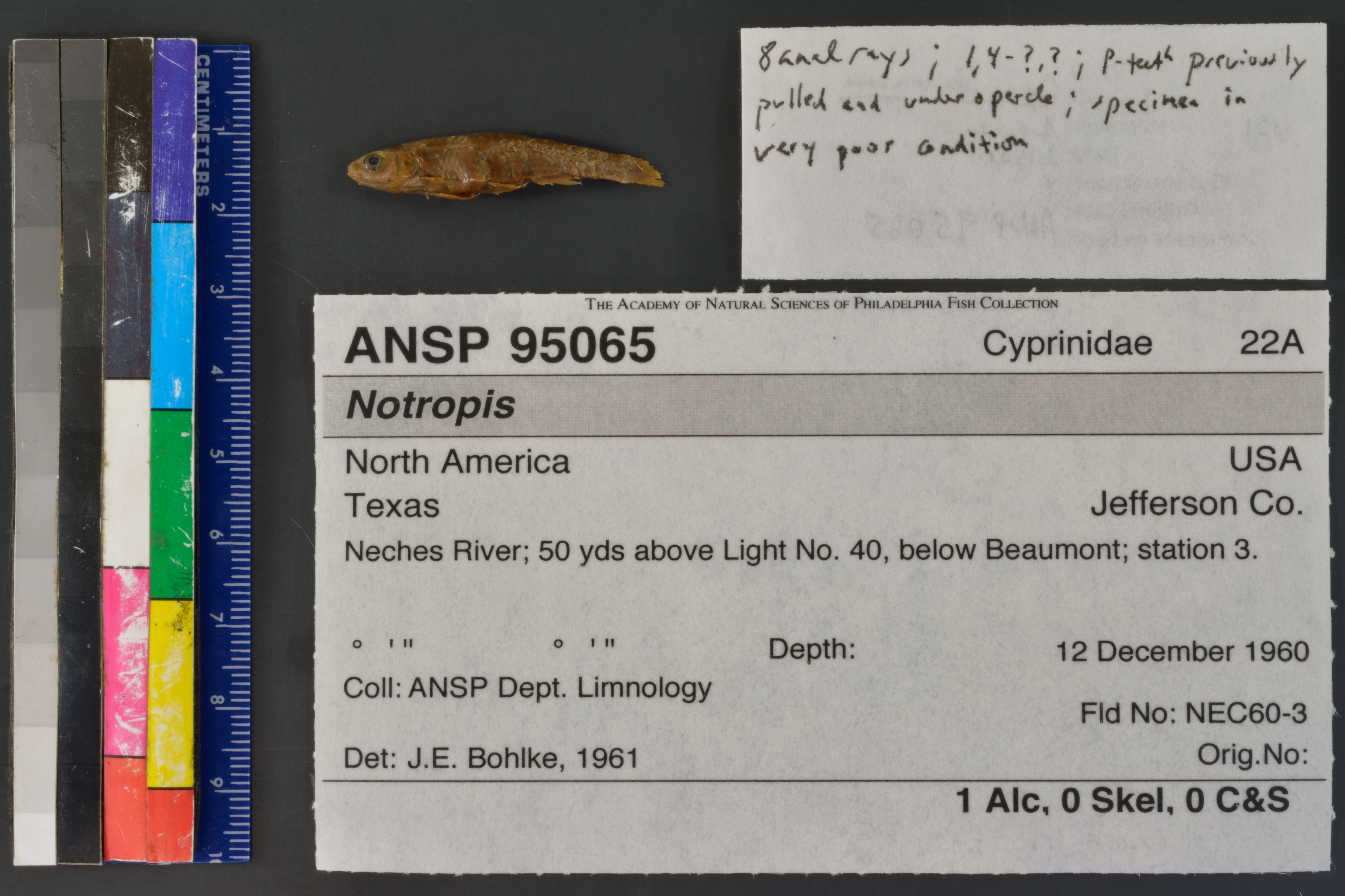 Specimen examined and Id'ed for FoTX project. | 8 anal rays; 1,4-?,?; p-teeth previously pulled and found under opercle; specimen in very poor condition