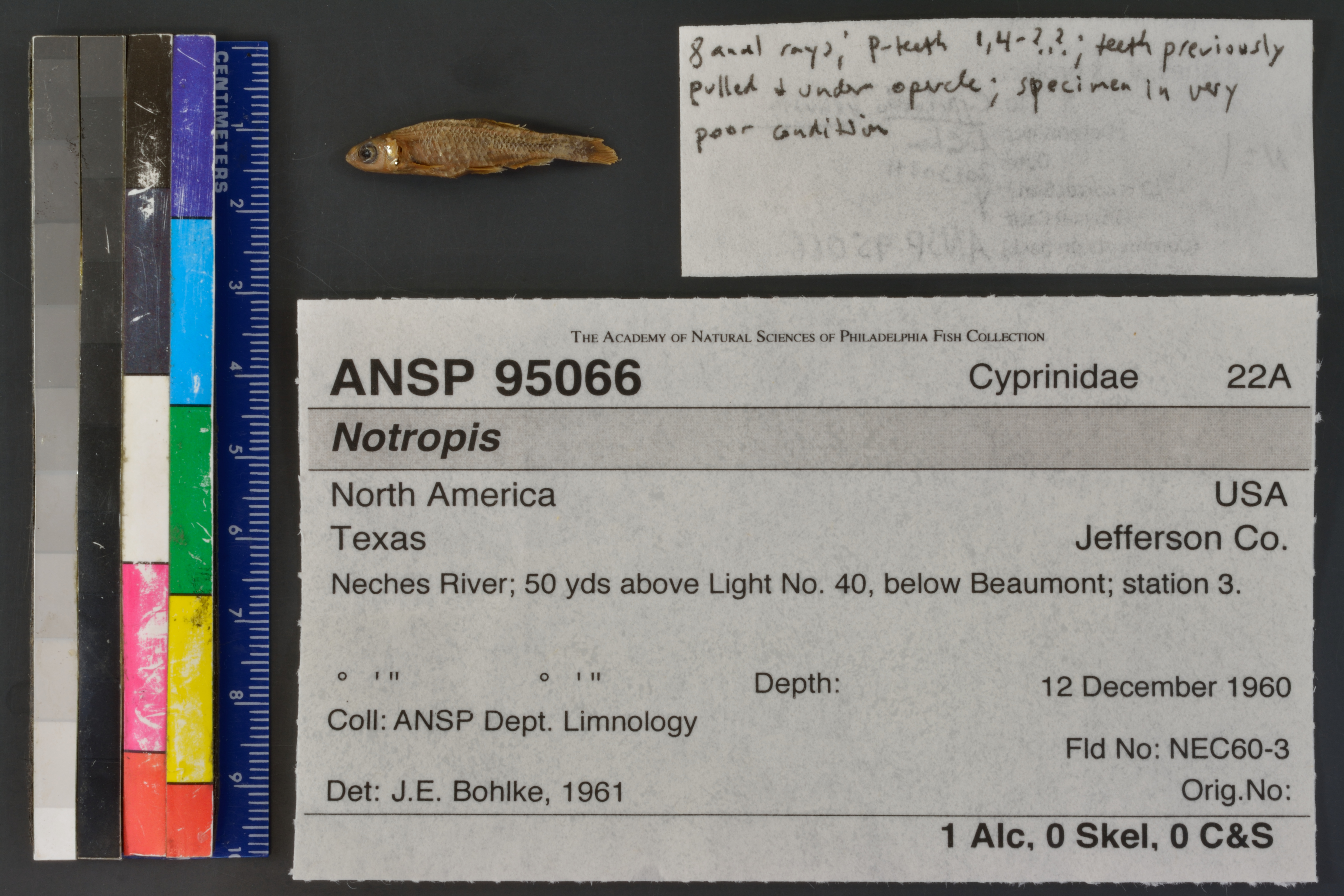 Specimen examined and Id'ed for FoTX project. | 8 anal rays; p-teeth = 1,4-?,?; teeth previously pulled and under opercle; specimen in very poor condition