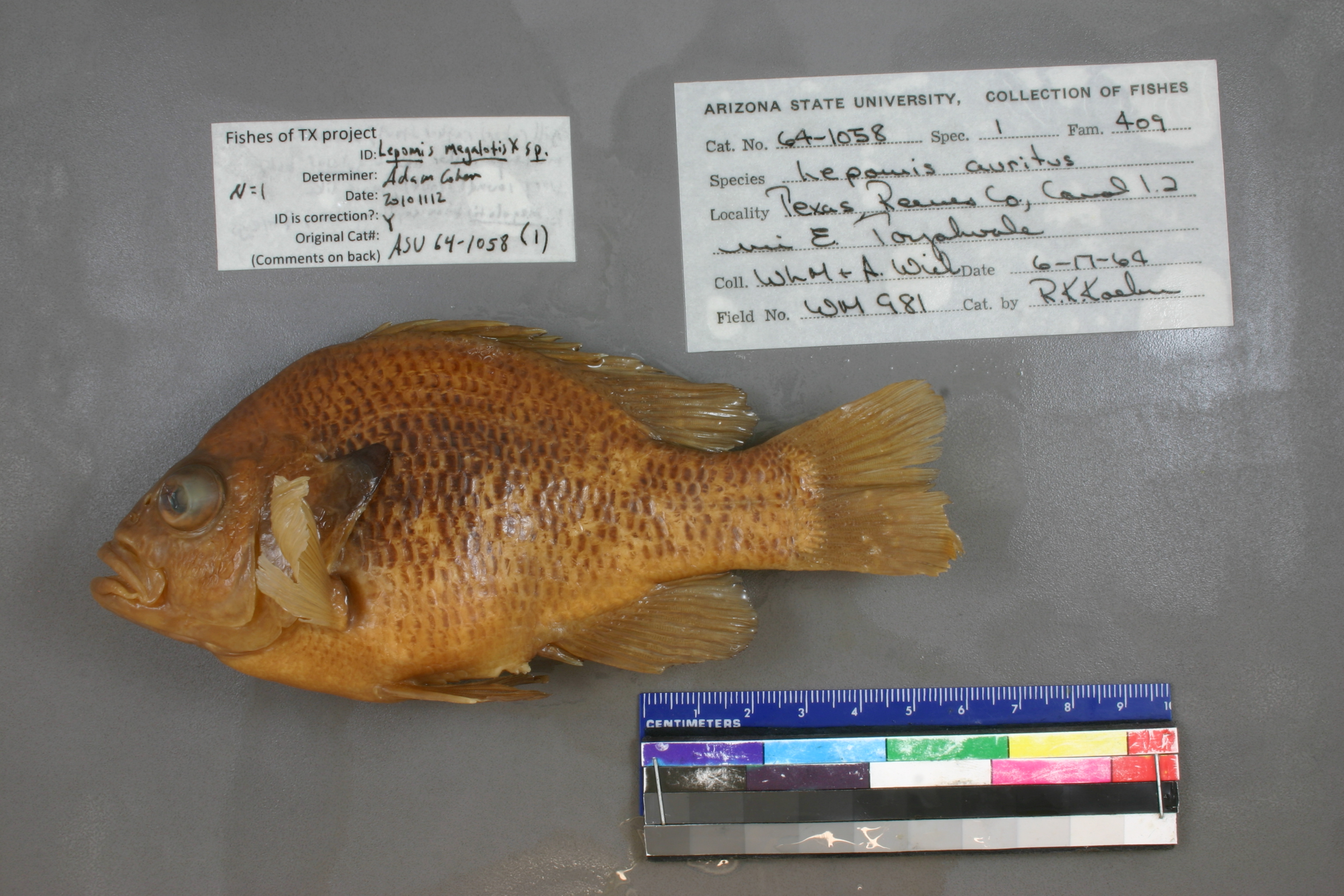ID Comments: specimen pulled from ASU1058 (originally called Lepomis auritus); specimen was hidden in mouth of larger specimen; This specimen is torso and head only.