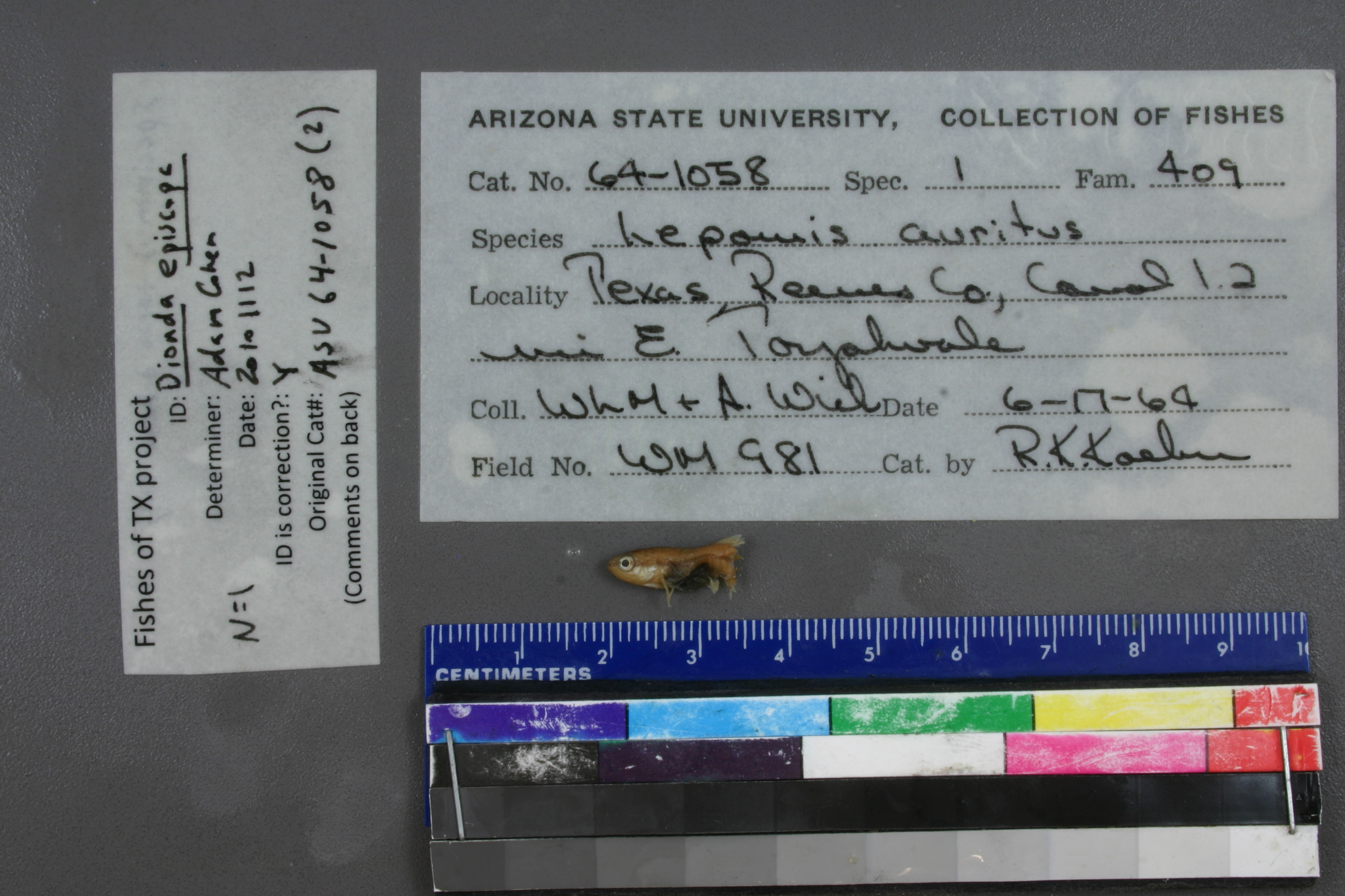 ID complete | gill rakers rather stout; body markings unusual for Lepomis (rather like that of L. gulosus, but not quite); body very round and stout; more like L. megalotis than any other Lepomis; specimen is female with orange eggs