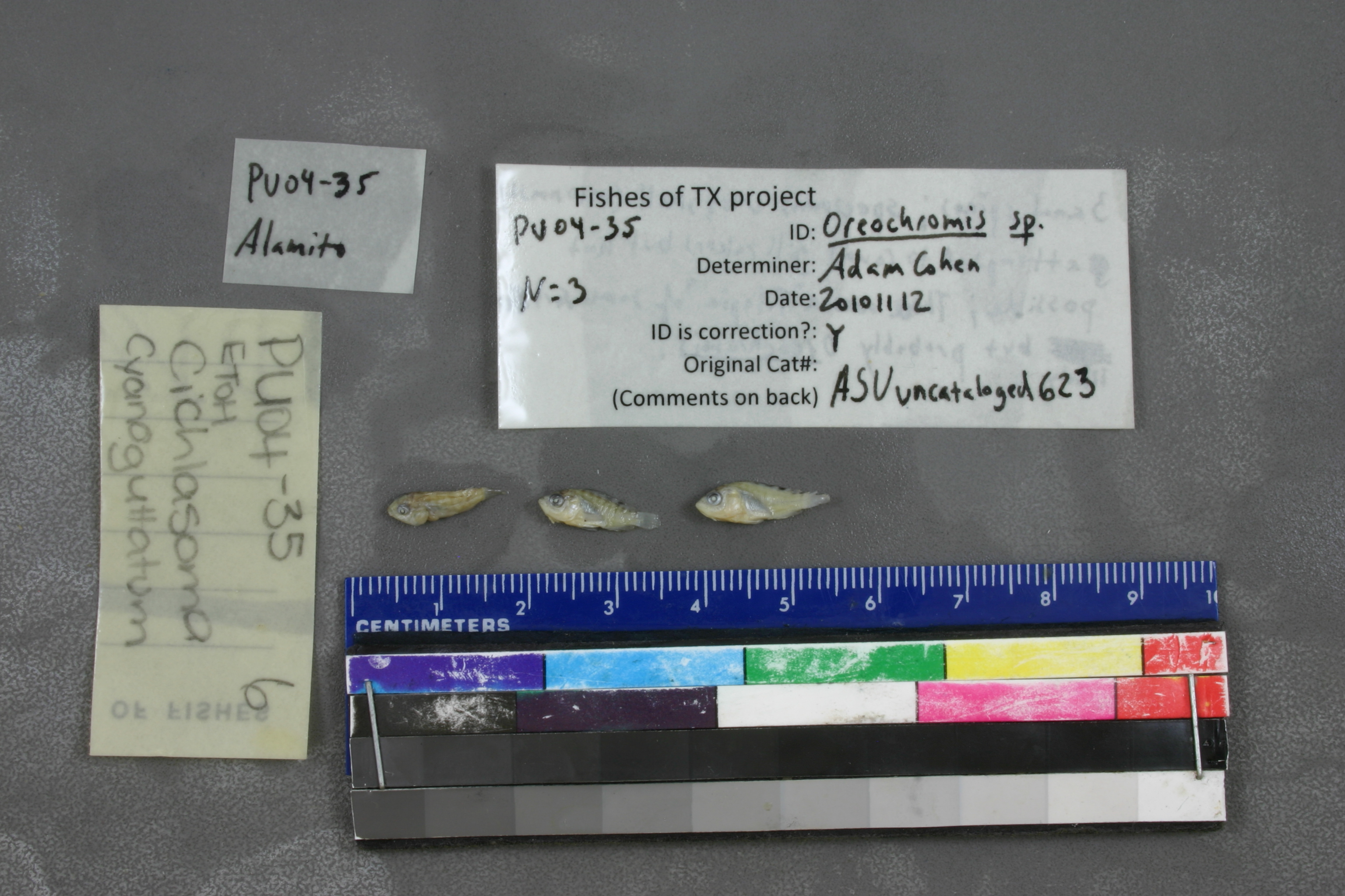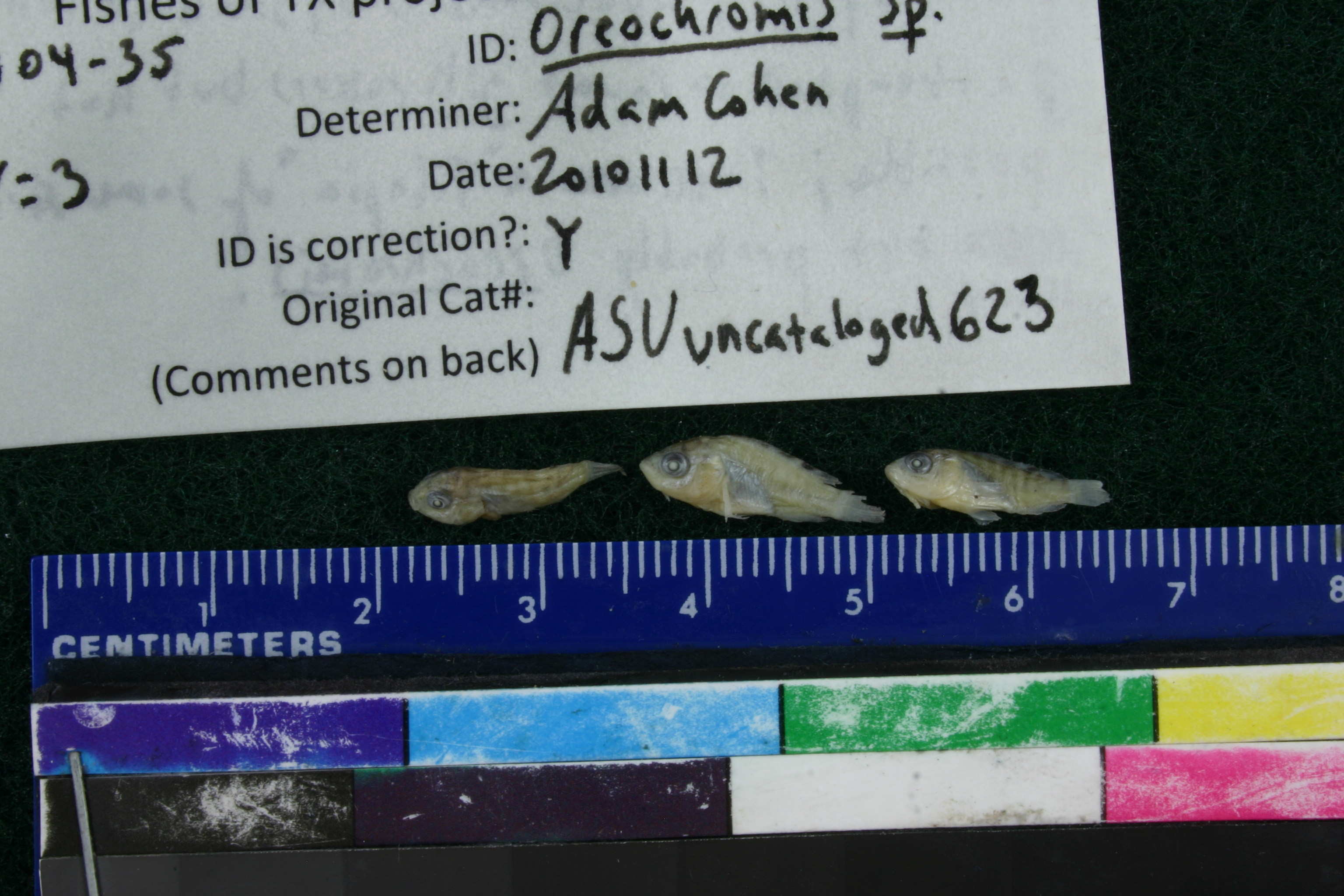 ID Comments: 3 anal spines; specimens ver small (~10mmSL), attempted to count gill rakers, but not possible; these are 'tilapia' of some sort and probably Oreochromis sp.