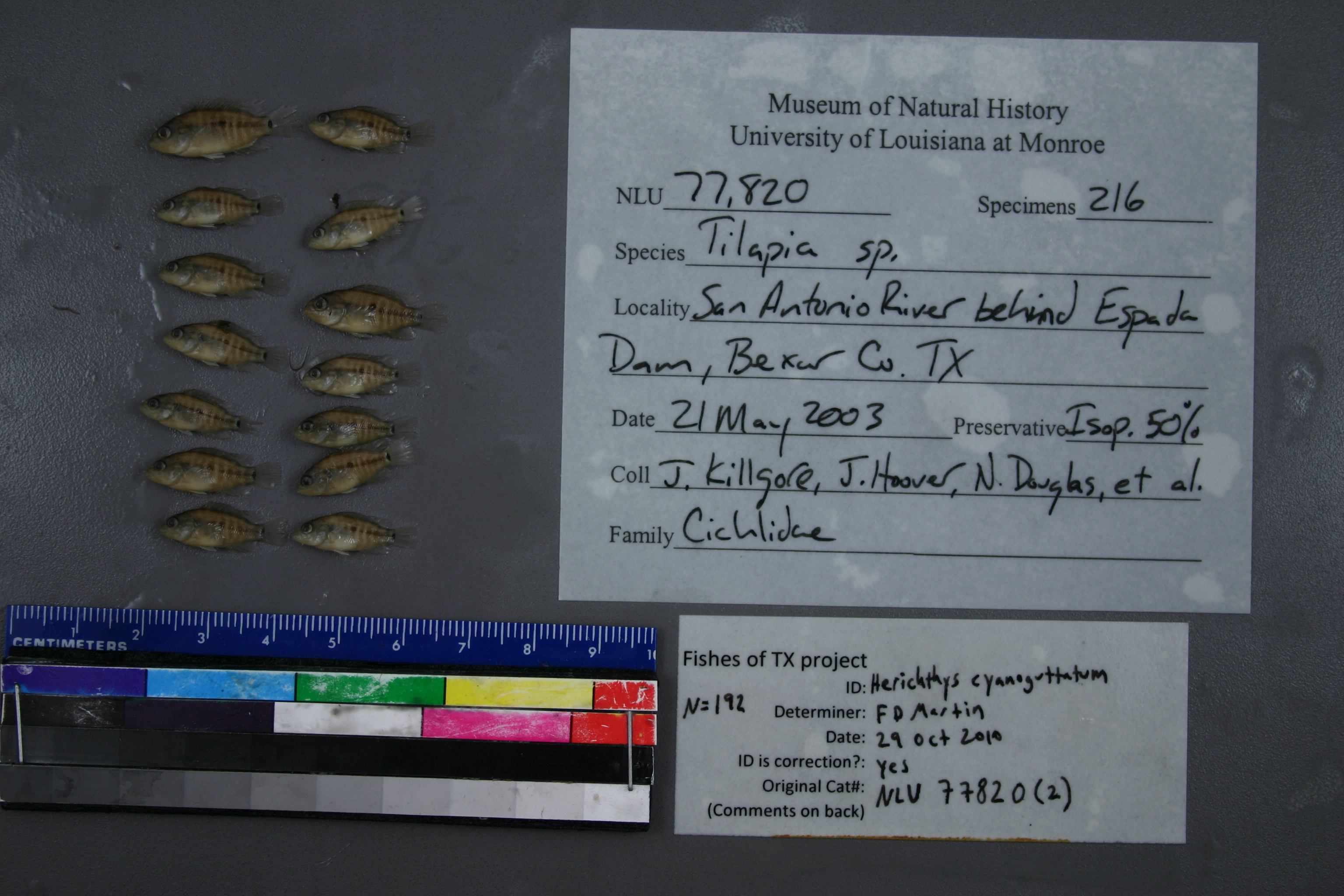 ID Status: Specimen examined and ID'ed for FoTX projectID Comments: 16 rakers on lower limb of 1st gill arch-removed 192 Herichthys cyanoguttatumID Confidence: high