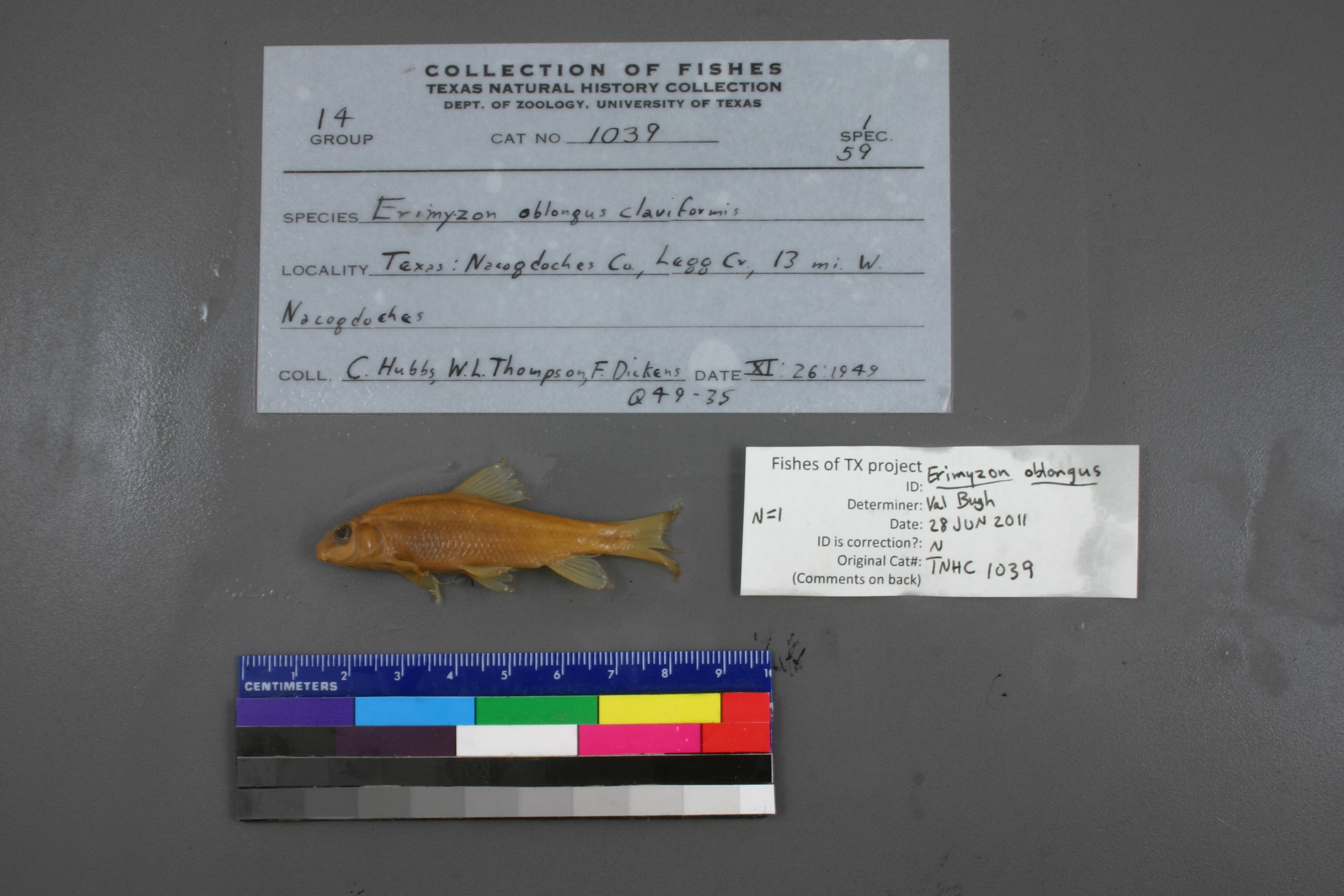 Specimen examined and Id'ed for FoTX project. | ID notes: lateral scales: 44; MinSL(mm): 55.22; MaxSL(mm): ; Jar: 8 oz; Specimen condition: good; Mutations: none; Count Male: ; Count female: ; Extern parasites: n