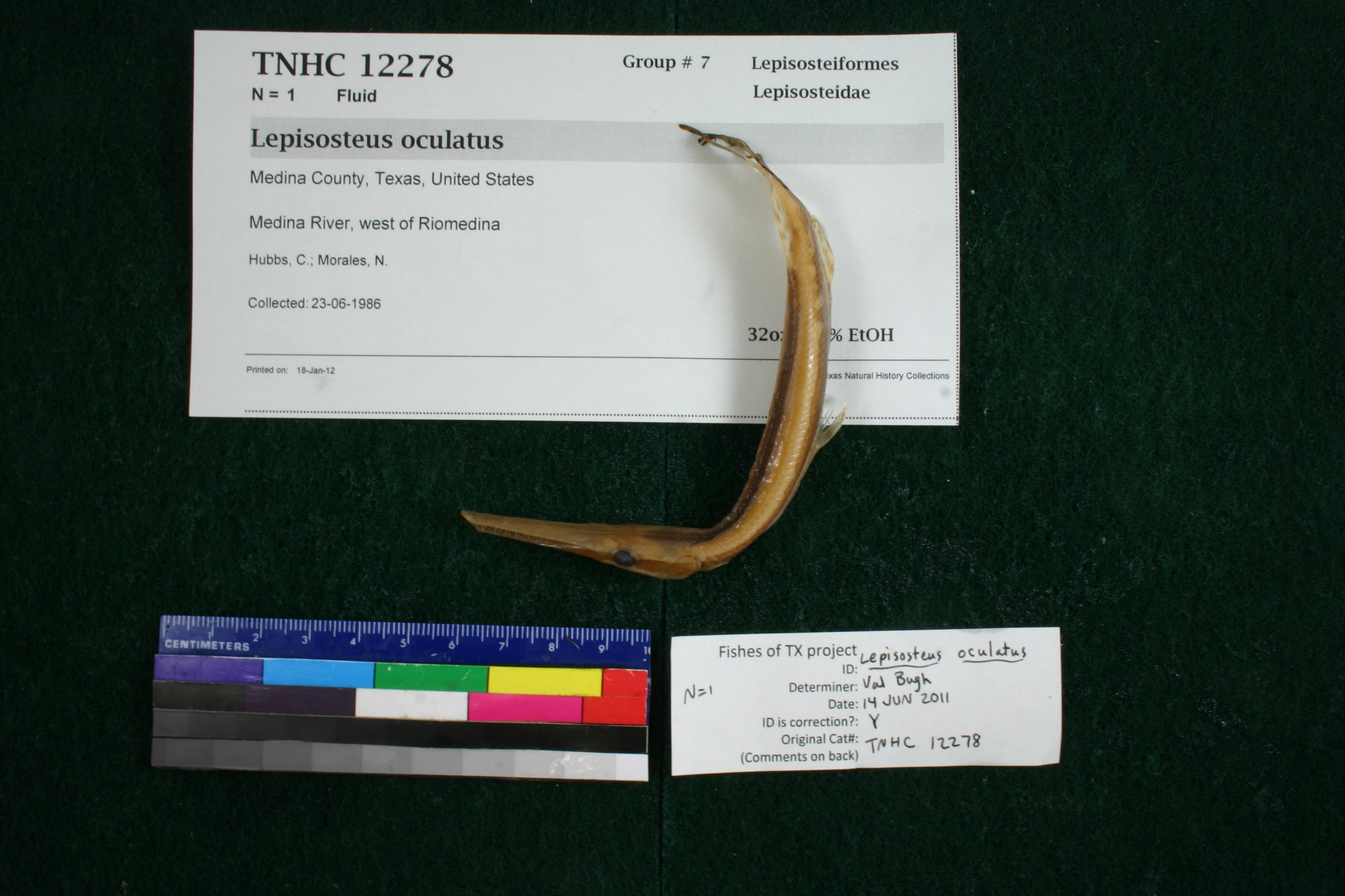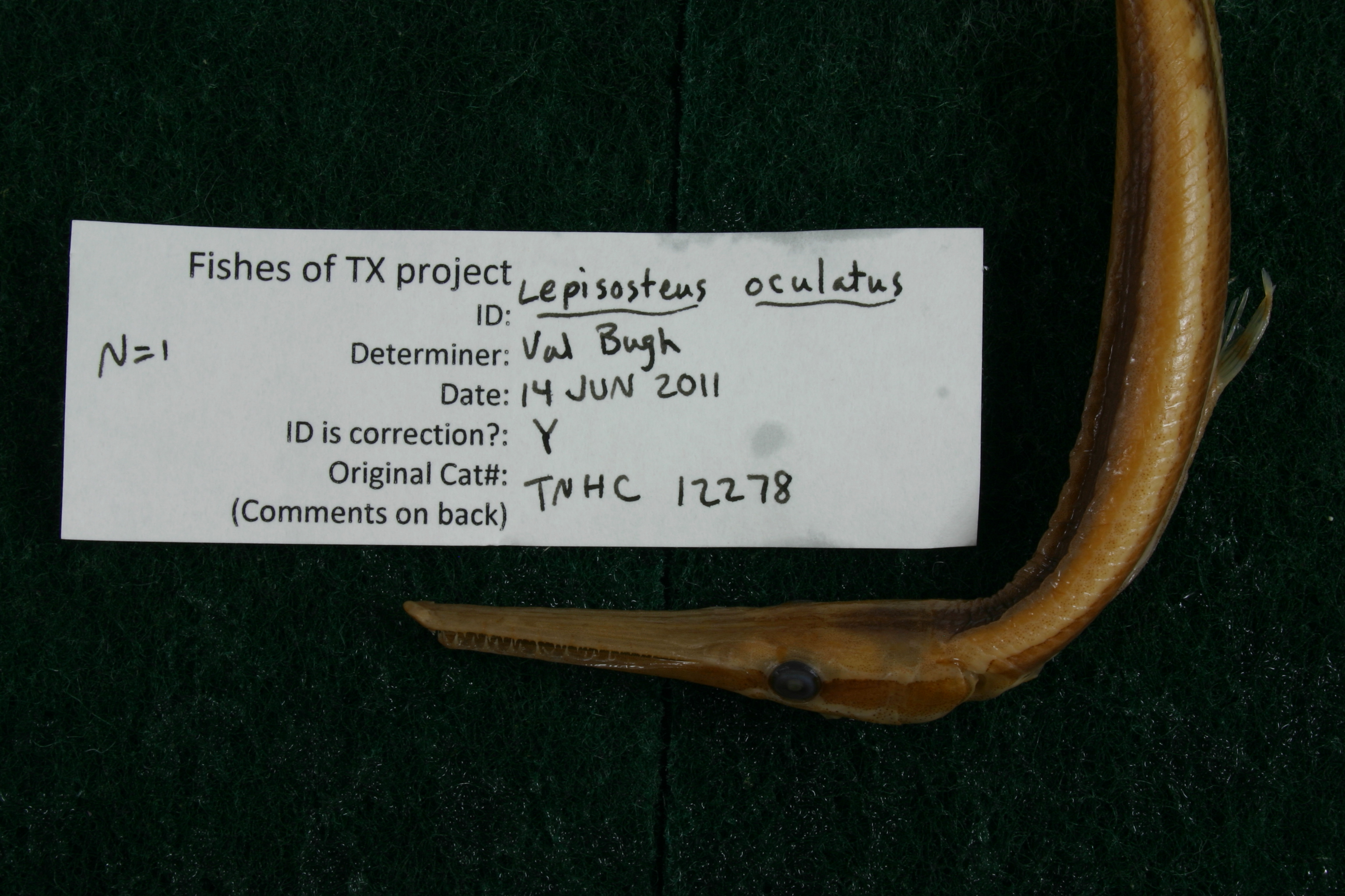 Specimen examined and Id'ed for FoTX project. | ID notes: lateral line scales: 55; ; *note for SL measurements that gar have heterocercal tails - all length measurements are based on SL and are approximate; MinSL(mm): 126.46; MaxSL(mm): ; Jar: 32 oz; Specimen condition: good; Mutations: none; Count Male: ; Count female: ; Extern parasites: n