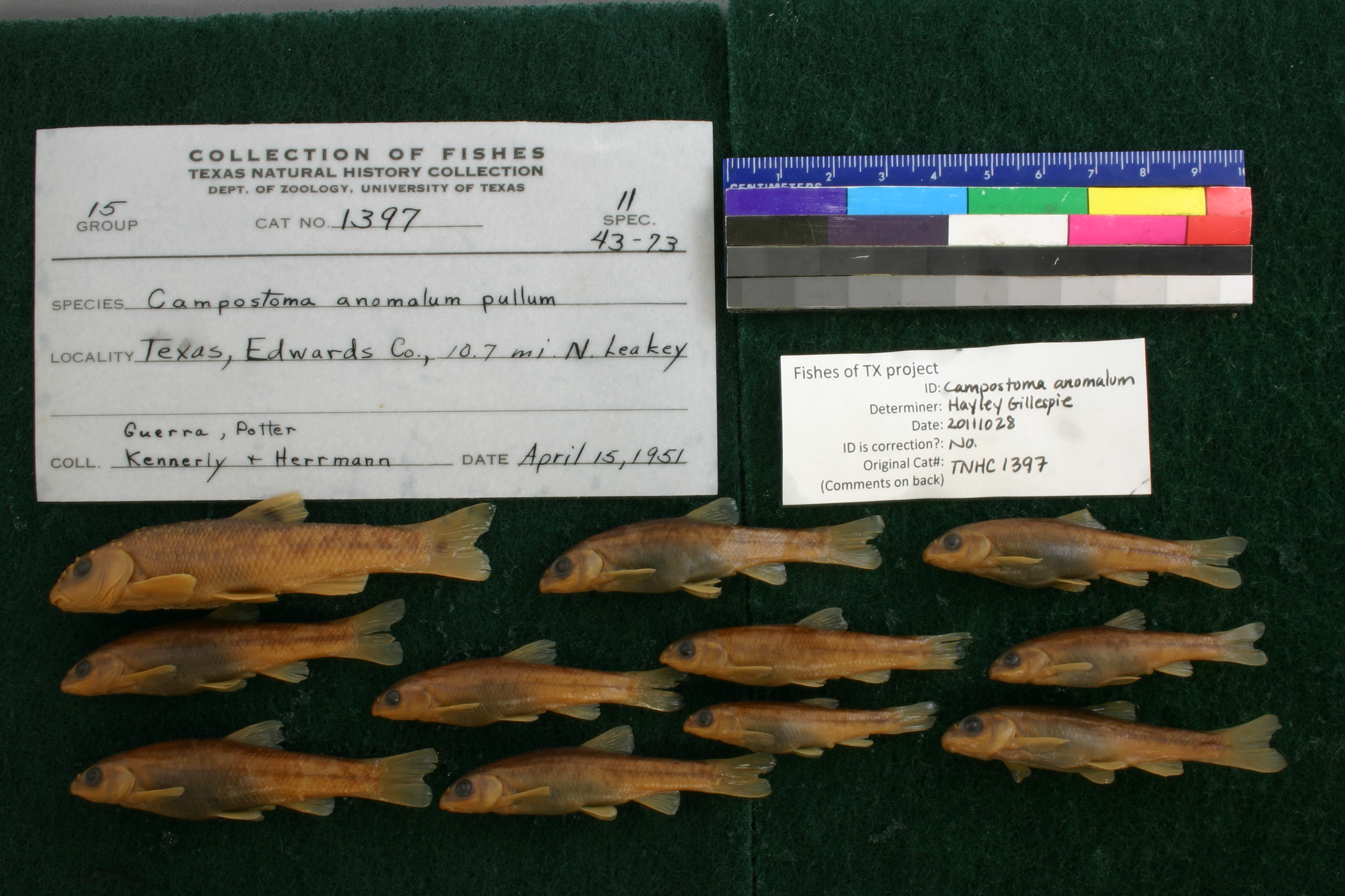 Specimen examined and Id'ed for FoTX project. | ID notes: 3 specimens with breeding tubercles; MinSL(mm): 40.19; MaxSL(mm): 69.78; Jar: 8 oz; Specimen condition: good; Mutations: none; Count Male: 3 specimens with breeding tubercles; Count female: ; Extern parasites: n