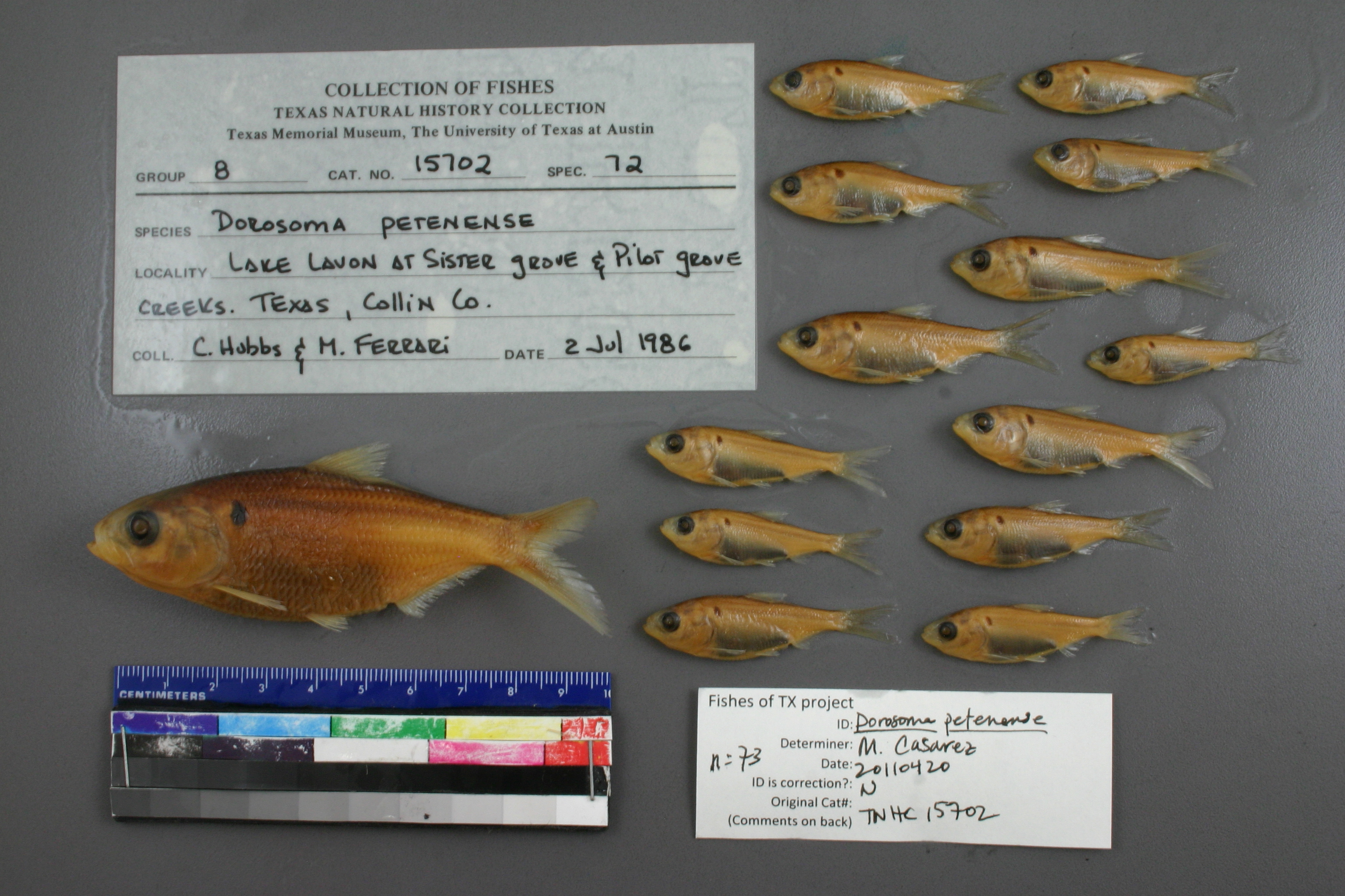 Specimen examined and Id'ed for FoTX project. | ID notes: anal rays: 22,22,23; MinSL(mm): 19.58; MaxSL(mm): 82.77; Jar: 32 oz; Specimen condition: good; Mutations: none; Count Male: ; Count female: ; Extern parasites: n