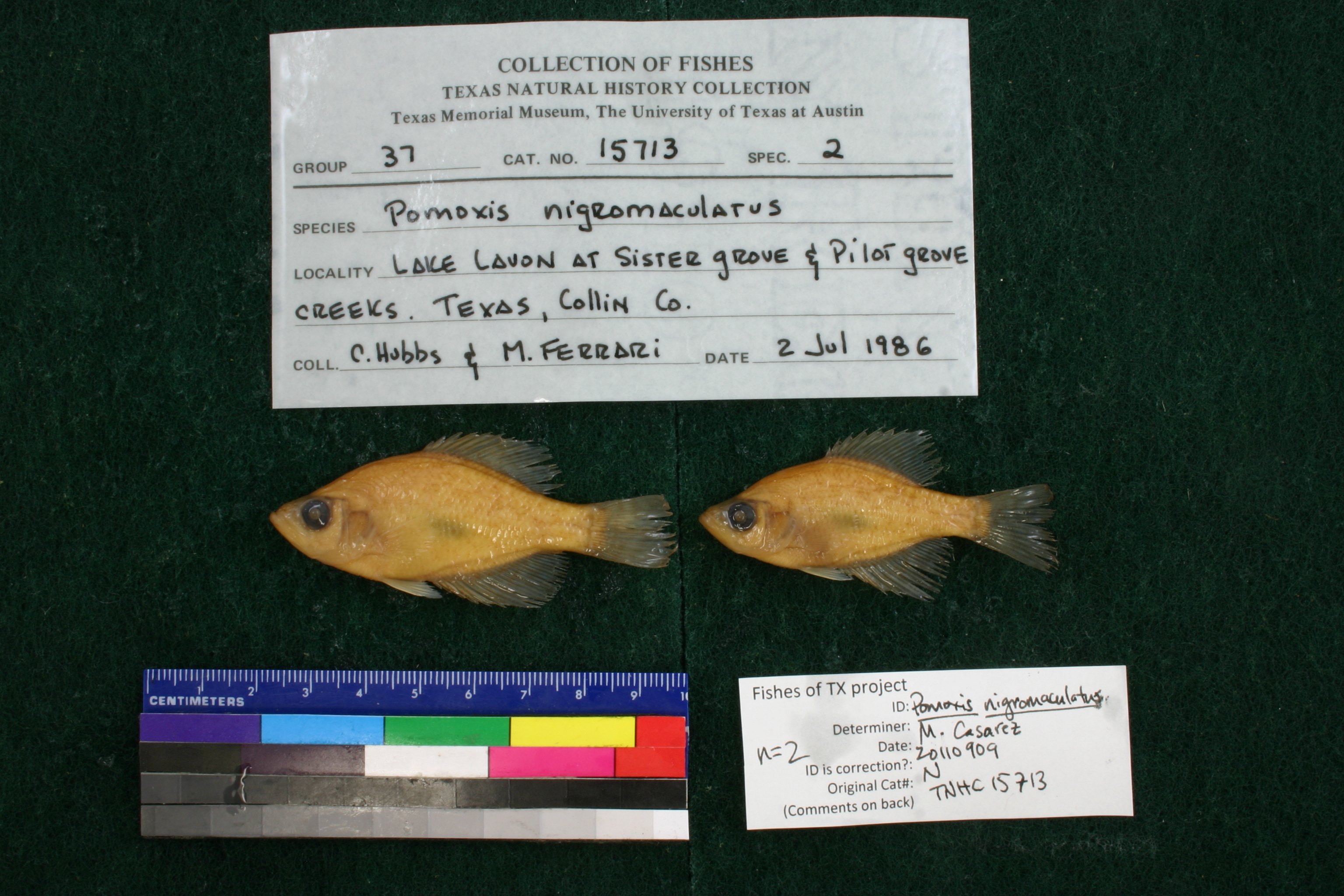 Specimen examined and Id'ed for FoTX project. | ID notes: dorsal spines: 7; MinSL(mm): 48.98; MaxSL(mm): 57.67; Jar: 8 oz; Specimen condition: good; Mutations: none; Count Male: ; Count female: ; Extern parasites: n