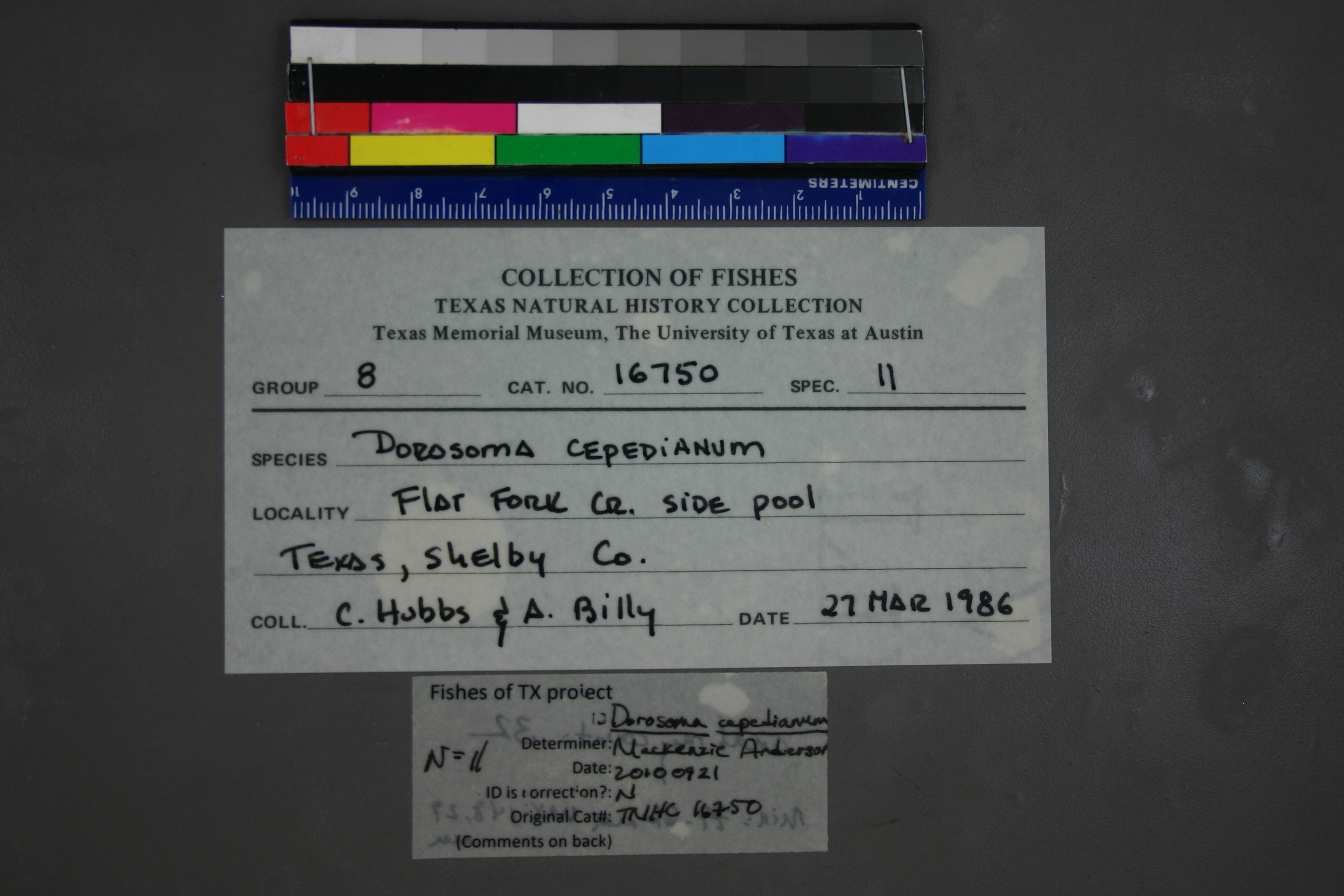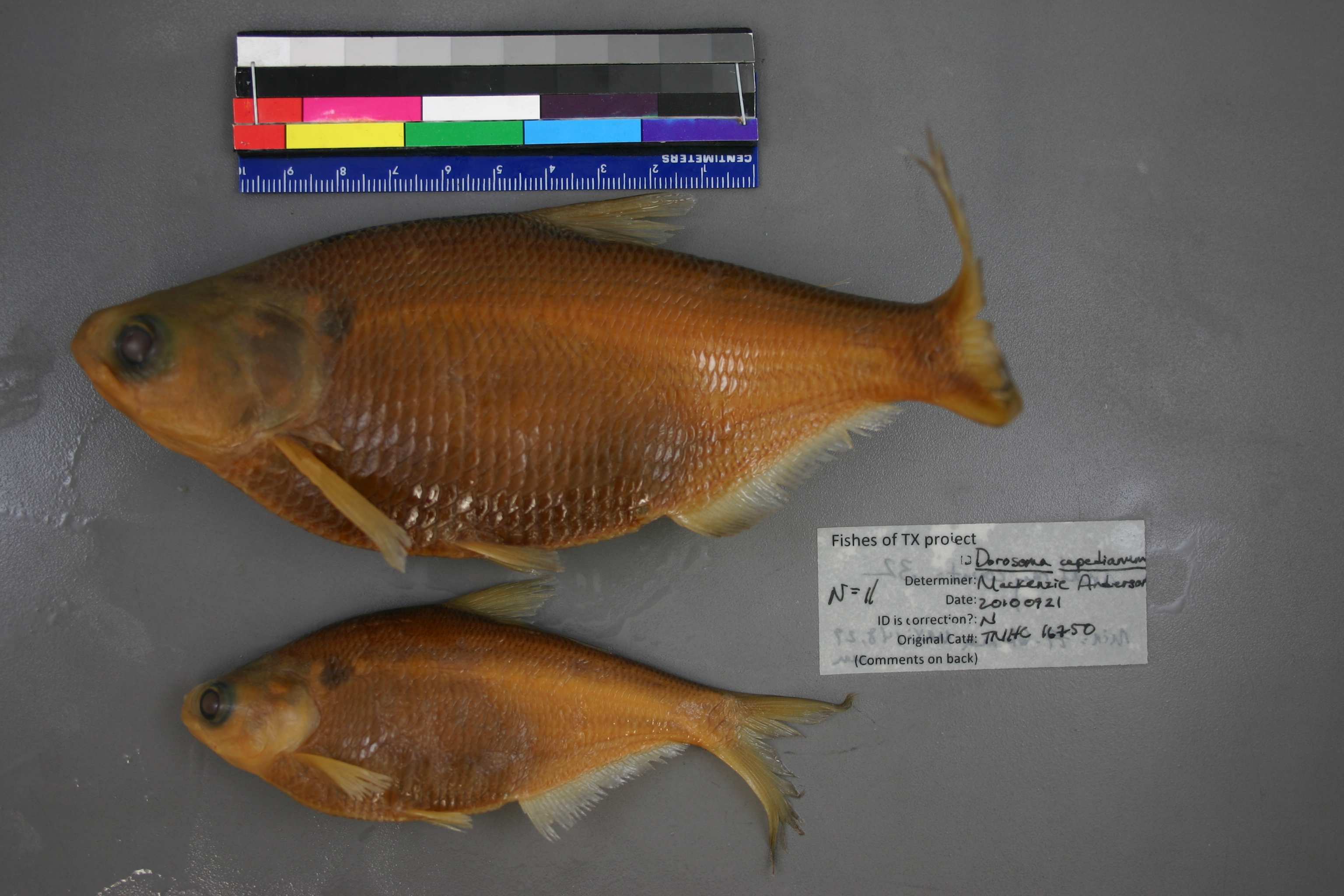 Specimen examined and Id'ed for FoTX project. | ID notes: anal rays (smallest specimen): 32; MinSL(mm): 77.66; MaxSL(mm): 148.29; Jar: quart; Specimen condition: good; Mutations: none; Count Male: ; Count female: ; Extern parasites: