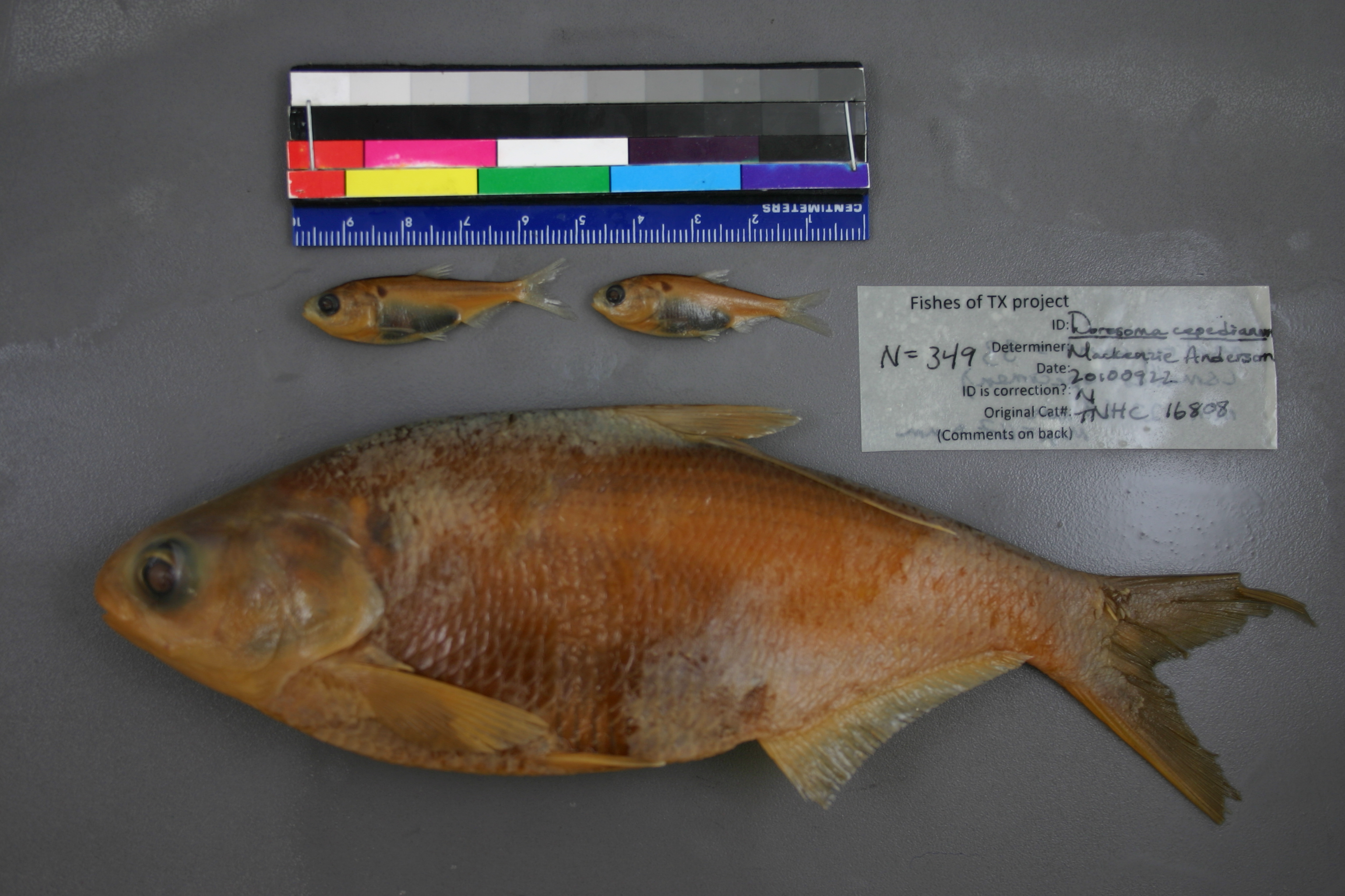 Specimen examined and Id'ed for FoTX project. | ID notes: anal rays (smallest specimen): 33; MinSL(mm): 27.68; MaxSL(mm): 167; Jar: gallon; Specimen condition: good; Mutations: none; Count Male: ; Count female: ; Extern parasites: