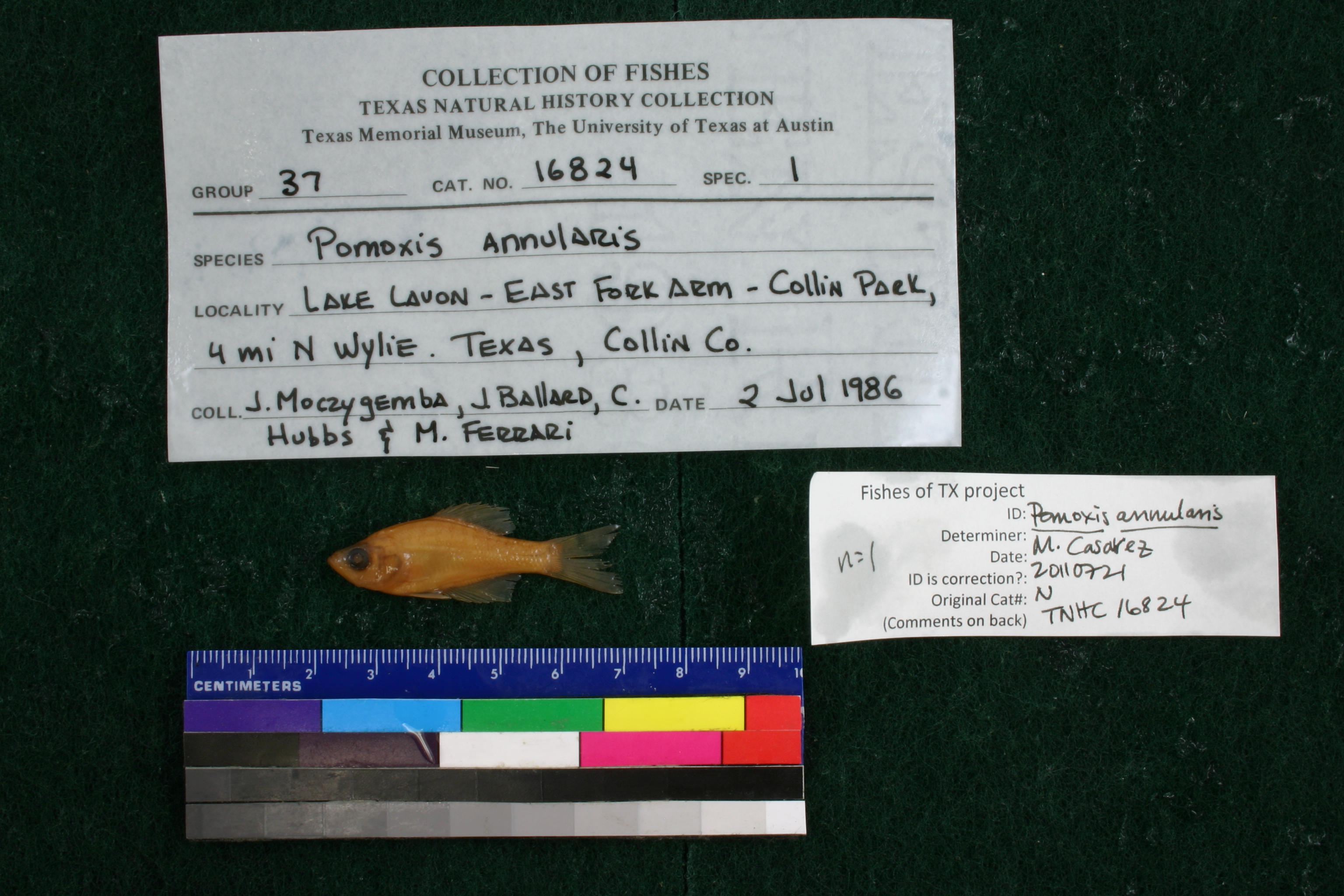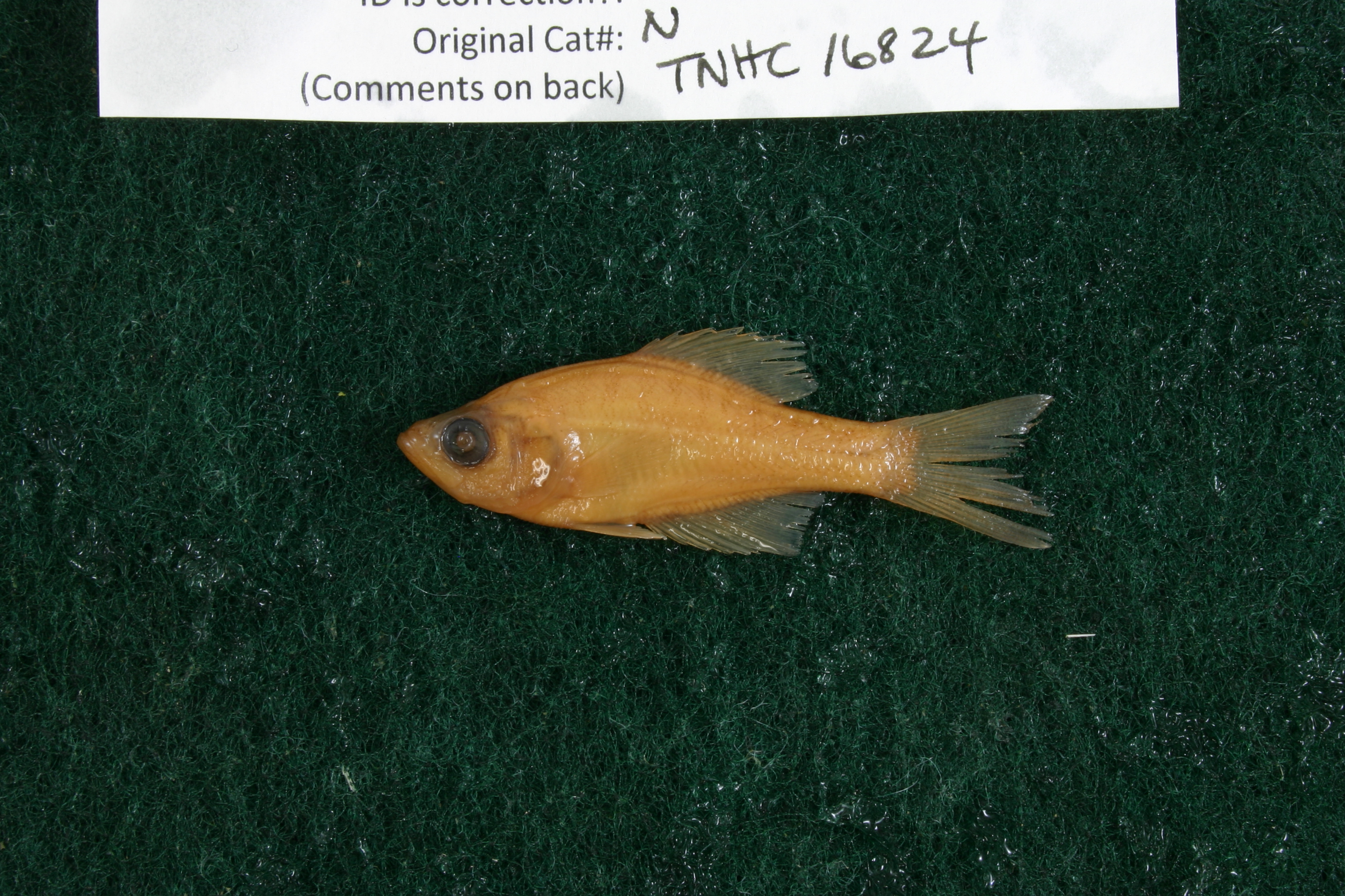 Specimen examined and Id'ed for FoTX project. | ID notes: dorsal spines: 6; MinSL(mm): 35.63; MaxSL(mm): ; Jar: 8 oz; Specimen condition: good; Mutations: none; Count Male: ; Count female: ; Extern parasites: n