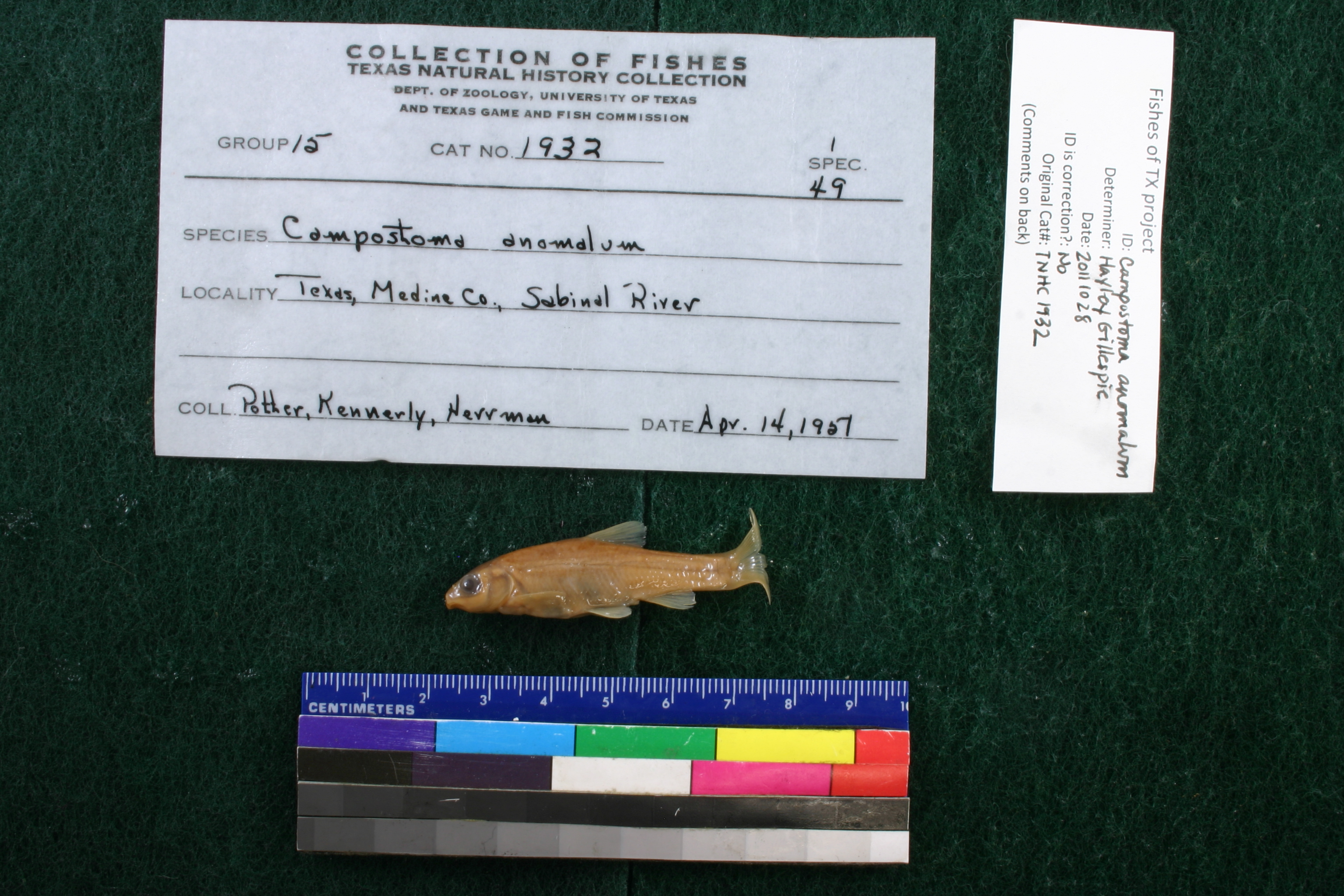 Specimen examined and Id'ed for FoTX project. | ID notes: ; MinSL(mm): 46.68; MaxSL(mm): ; Jar: 8 oz; Specimen condition: good; Mutations: none; Count Male: ; Count female: ; Extern parasites: n