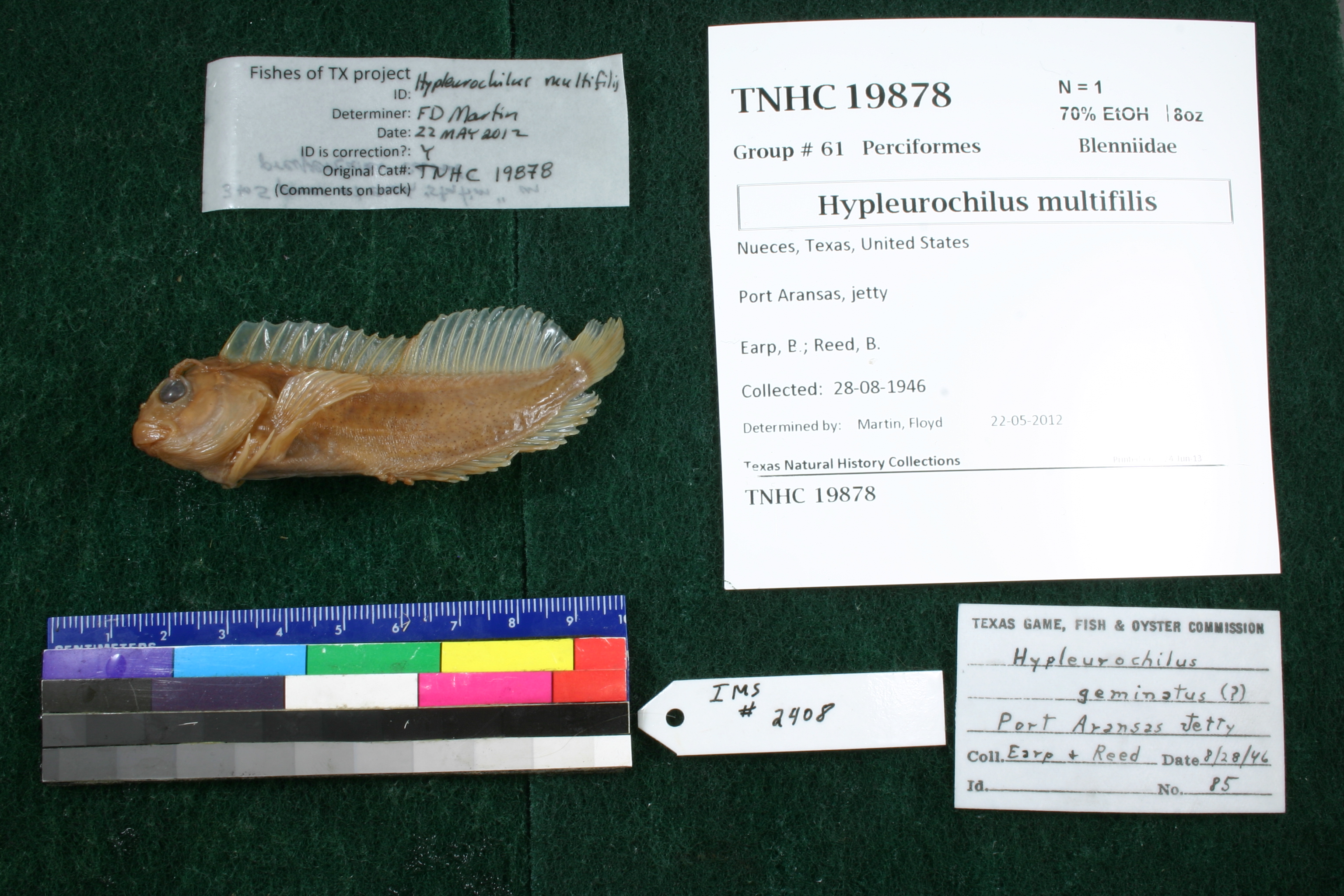Specimen examined and Id'ed for FoTX project. | ID notes: preopercular canal canal with 3 to 5 pores per "station"; MinSL(mm): 73.91; MaxSL(mm): ; Jar: 8 oz; Specimen condition: good but faded; Mutations: none; Count Male: ; Count female: ; Extern parasites: n