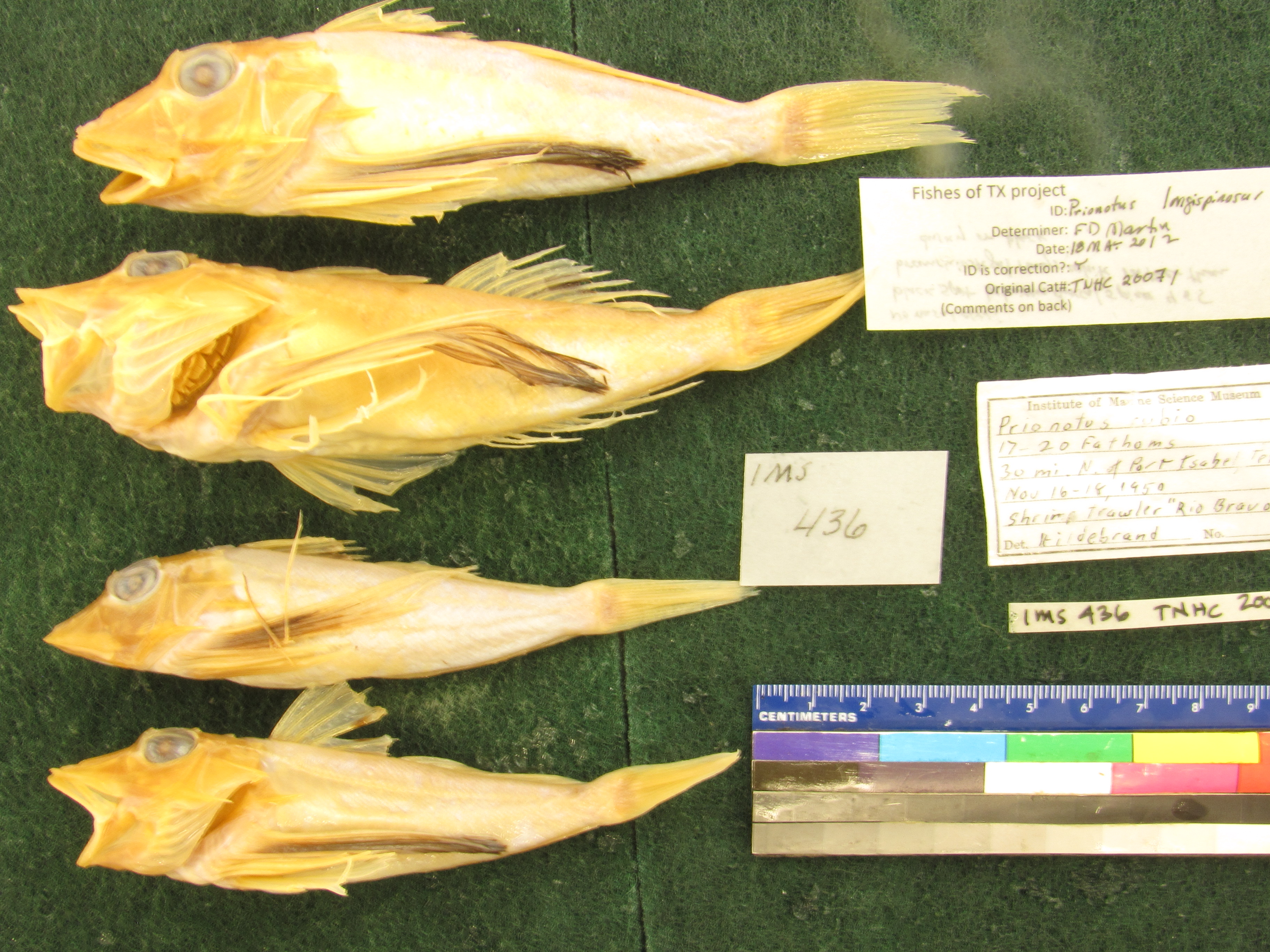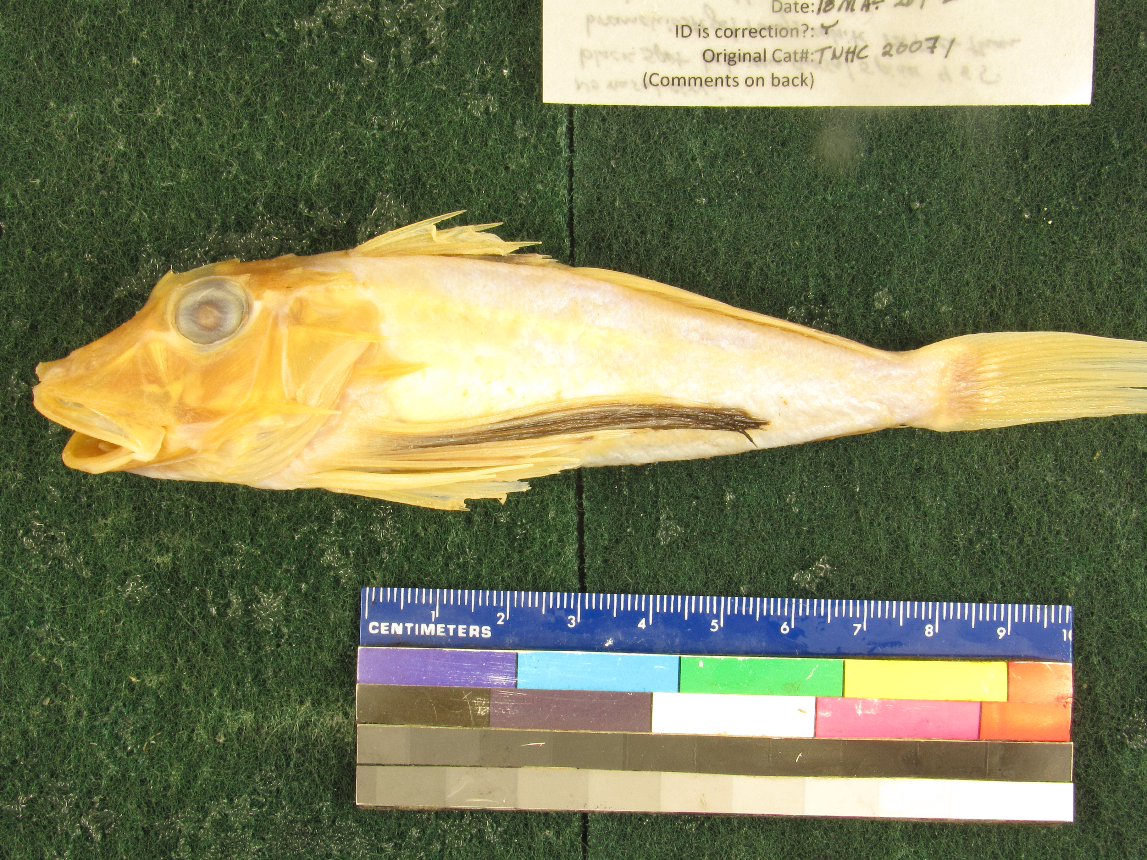Specimen examined and Id'ed for FoTX project. | ID notes: no nasal cirri; black spot between dorsal spines 4 & 5; branchiostegals white rather than dusky or black; MinSL(mm): 96.9; MaxSL(mm): 125.07; Jar: 32 oz; Specimen condition: good; Mutations: none; Count Male: ; Count female: ; Extern parasites: n