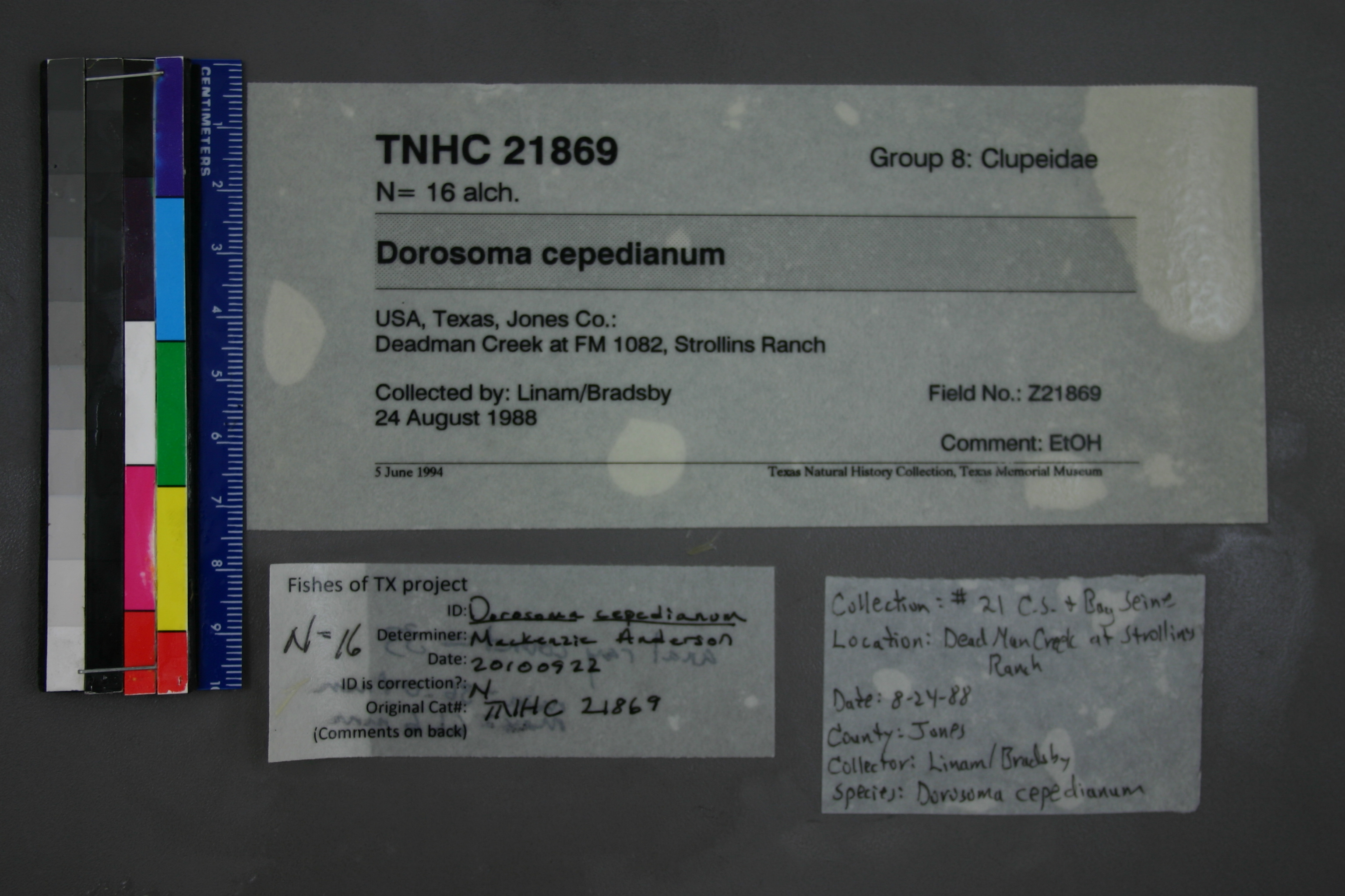 Specimen examined and Id'ed for FoTX project. | ID notes: anal rays (smallest specimen): 33; MinSL(mm): 36.04; MaxSL(mm): 61.6; Jar: 8 oz; Specimen condition: good; Mutations: none; Count Male: ; Count female: ; Extern parasites: