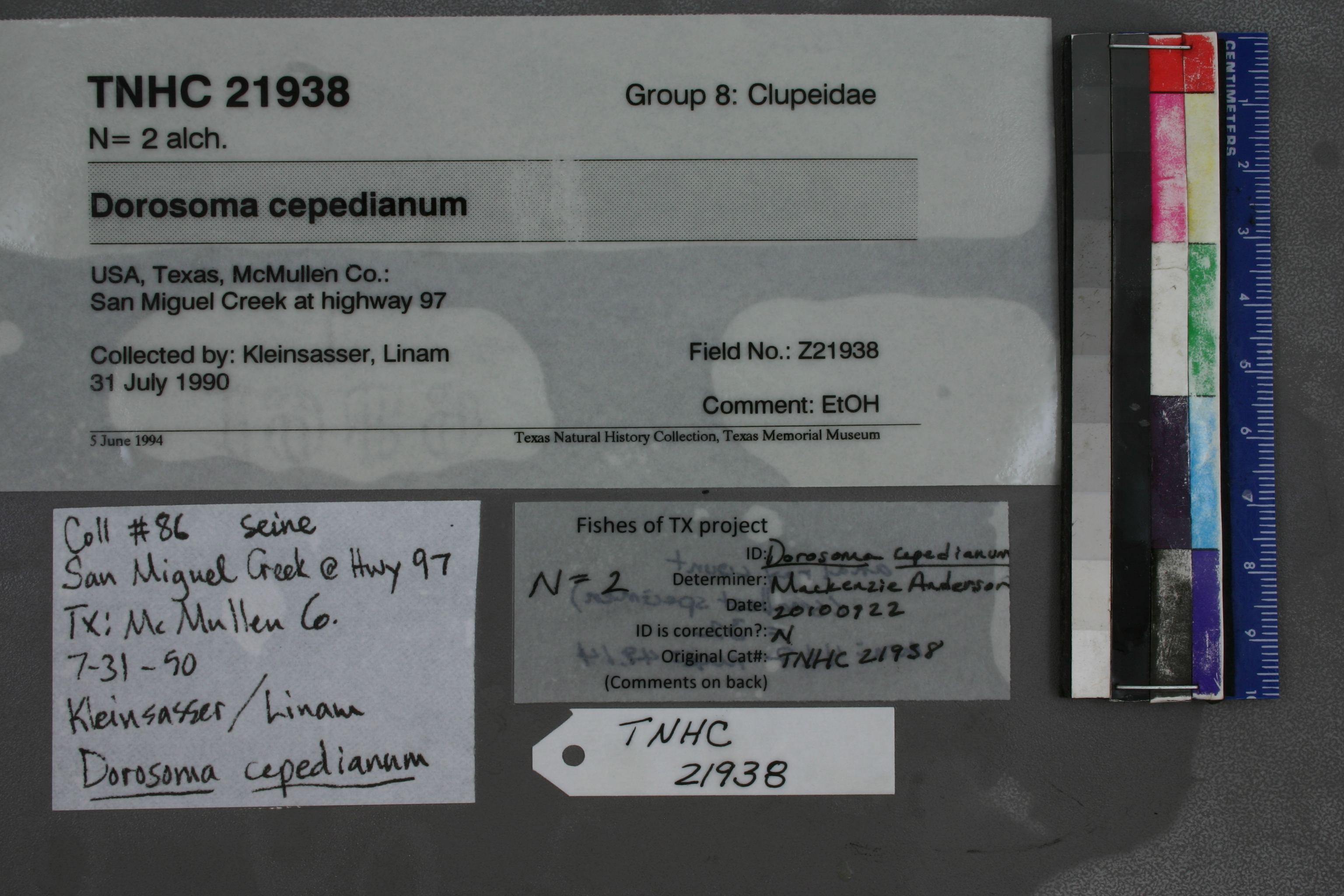 Specimen examined and Id'ed for FoTX project. | ID notes: anal rays (smallest specimen): 32; MinSL(mm): 44.7; MaxSL(mm): 49.14; Jar: 8 oz; Specimen condition: good; Mutations: none; Count Male: ; Count female: ; Extern parasites: