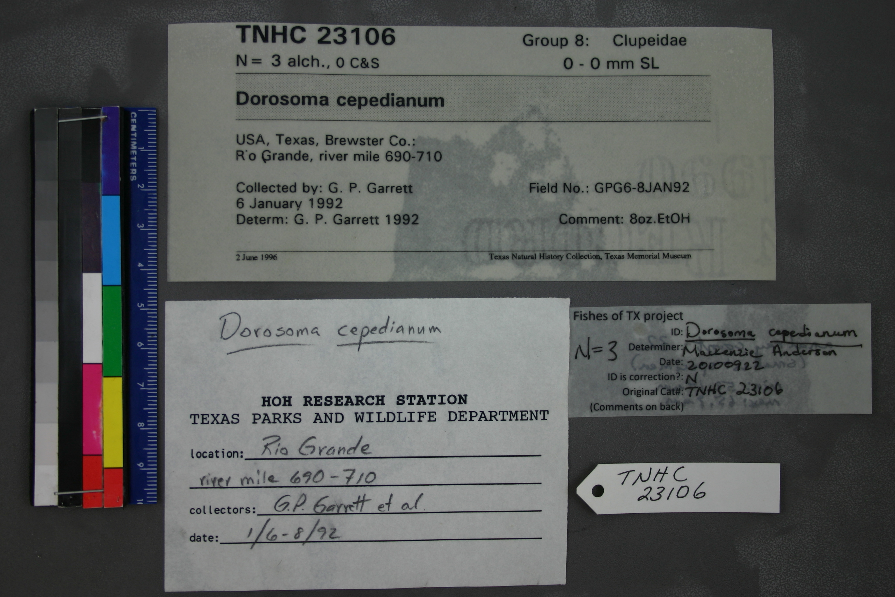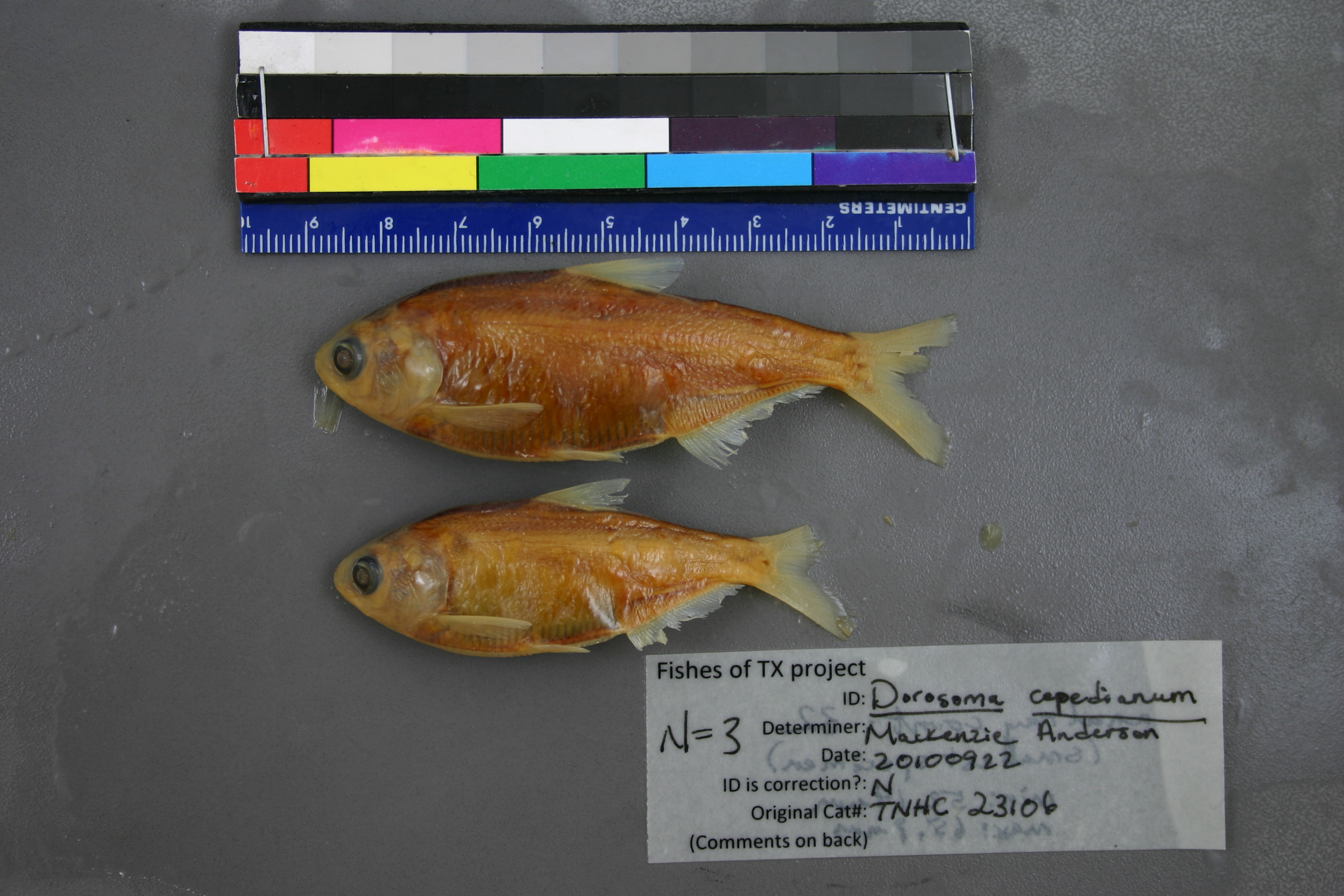 Specimen examined and Id'ed for FoTX project. | ID notes: anal rays (smallest specimen): 32; MinSL(mm): 52.14; MaxSL(mm): 65.9; Jar: quart; Specimen condition: good; Mutations: none; Count Male: ; Count female: ; Extern parasites: