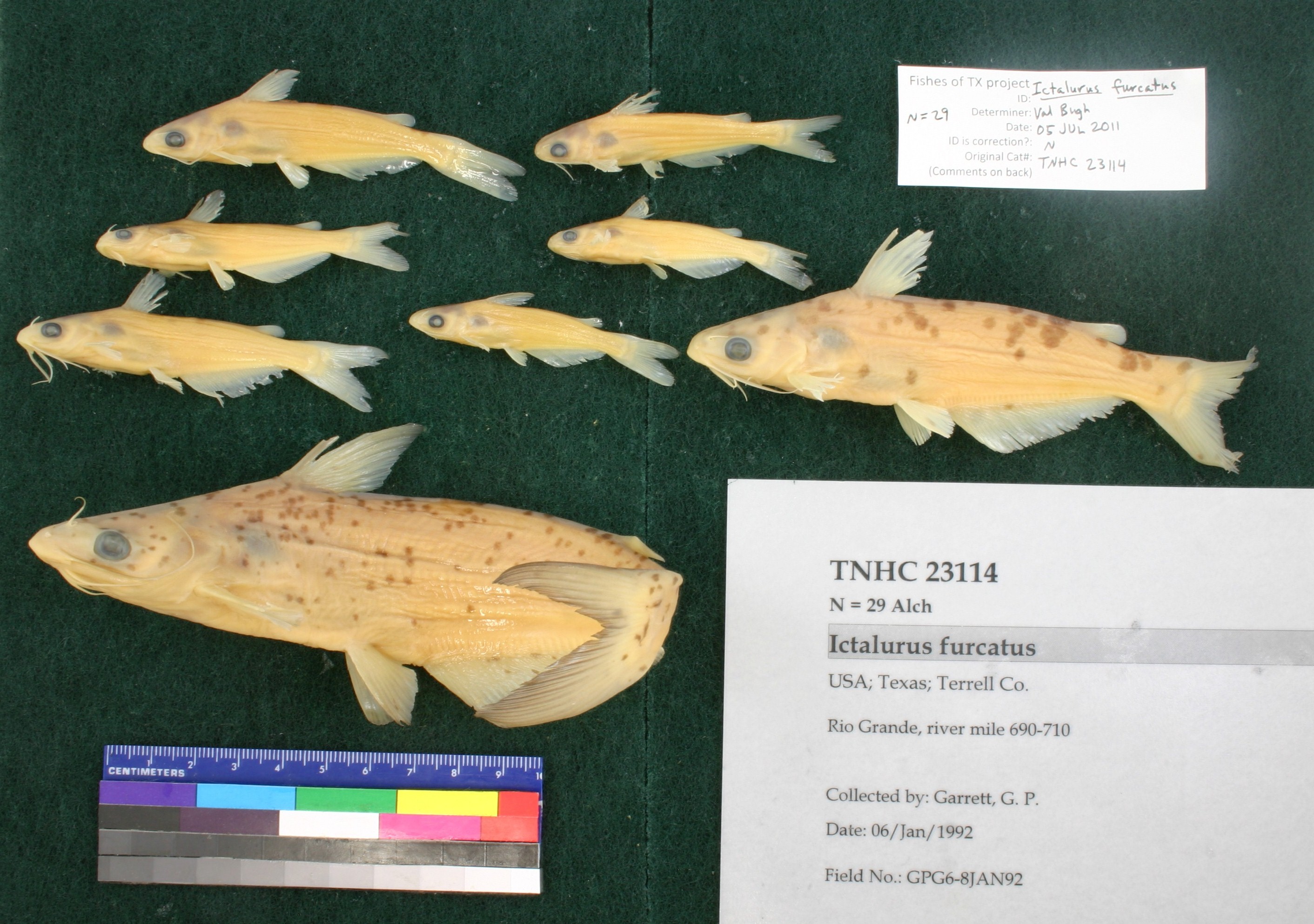 Specimen examined and Id'ed for FoTX project. | ID notes: anal rays: 32,24; MinSL(mm): 49.87; MaxSL(mm): 161; Jar: 1 gallon; Specimen condition: good; Mutations: none; Count Male: ; Count female: ; Extern parasites: n