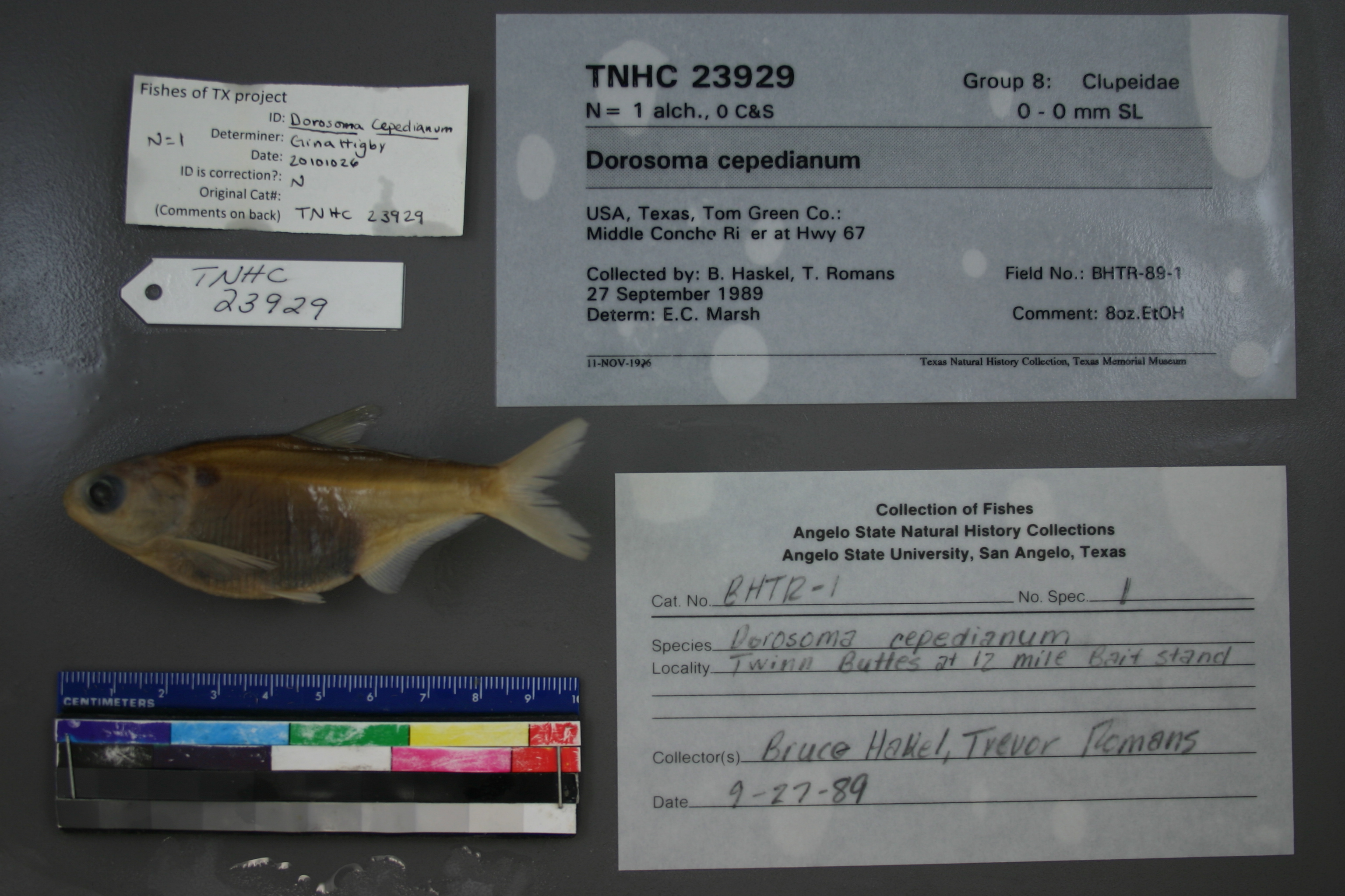 Specimen examined and Id'ed for FoTX project. | ID notes: anal rays: 30; MinSL(mm): 106.5; MaxSL(mm): ; Jar: 8 oz; Specimen condition: good; Mutations: none; Count Male: ; Count female: ; Extern parasites: