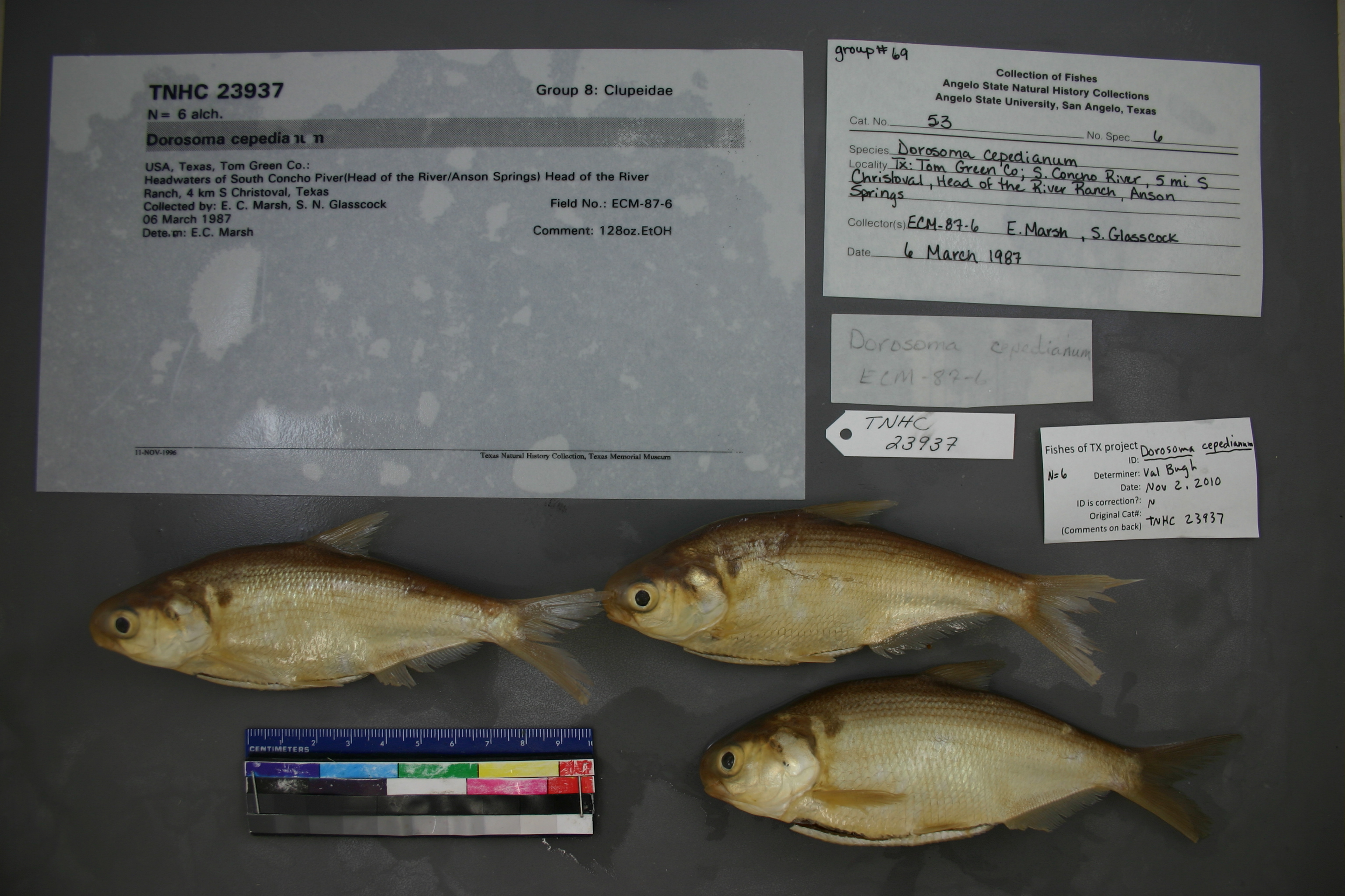 Specimen examined and Id'ed for FoTX project. | ID notes: anal rays: 31; MinSL(mm): 112; MaxSL(mm): 127; Jar: gallon; Specimen condition: good; Mutations: none; Count Male: ; Count female: ; Extern parasites: