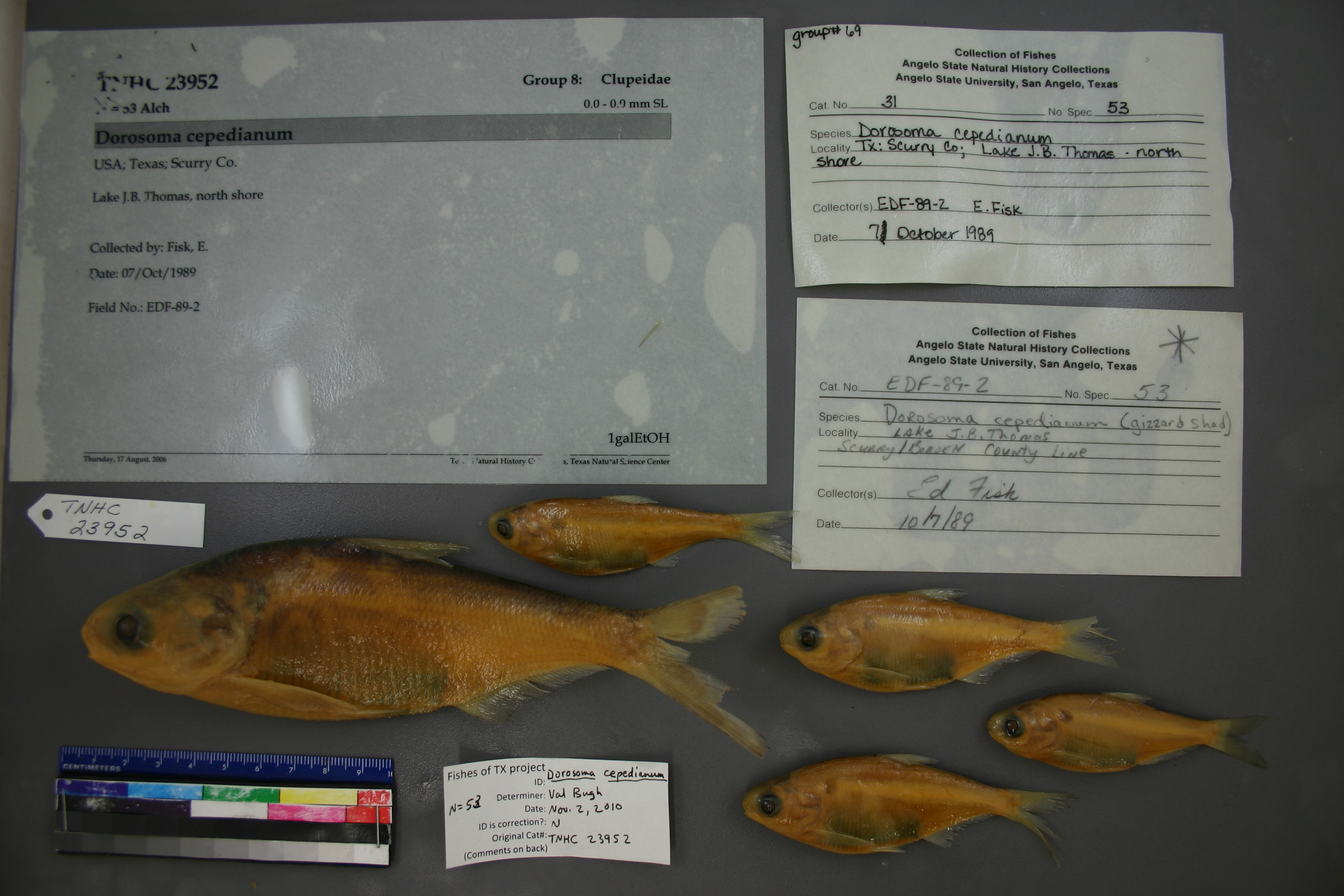 Specimen examined and Id'ed for FoTX project. | ID notes: anal rays: 32; MinSL(mm): 67; MaxSL(mm): 155; Jar: gallon; Specimen condition: good; Mutations: none; Count Male: ; Count female: ; Extern parasites: