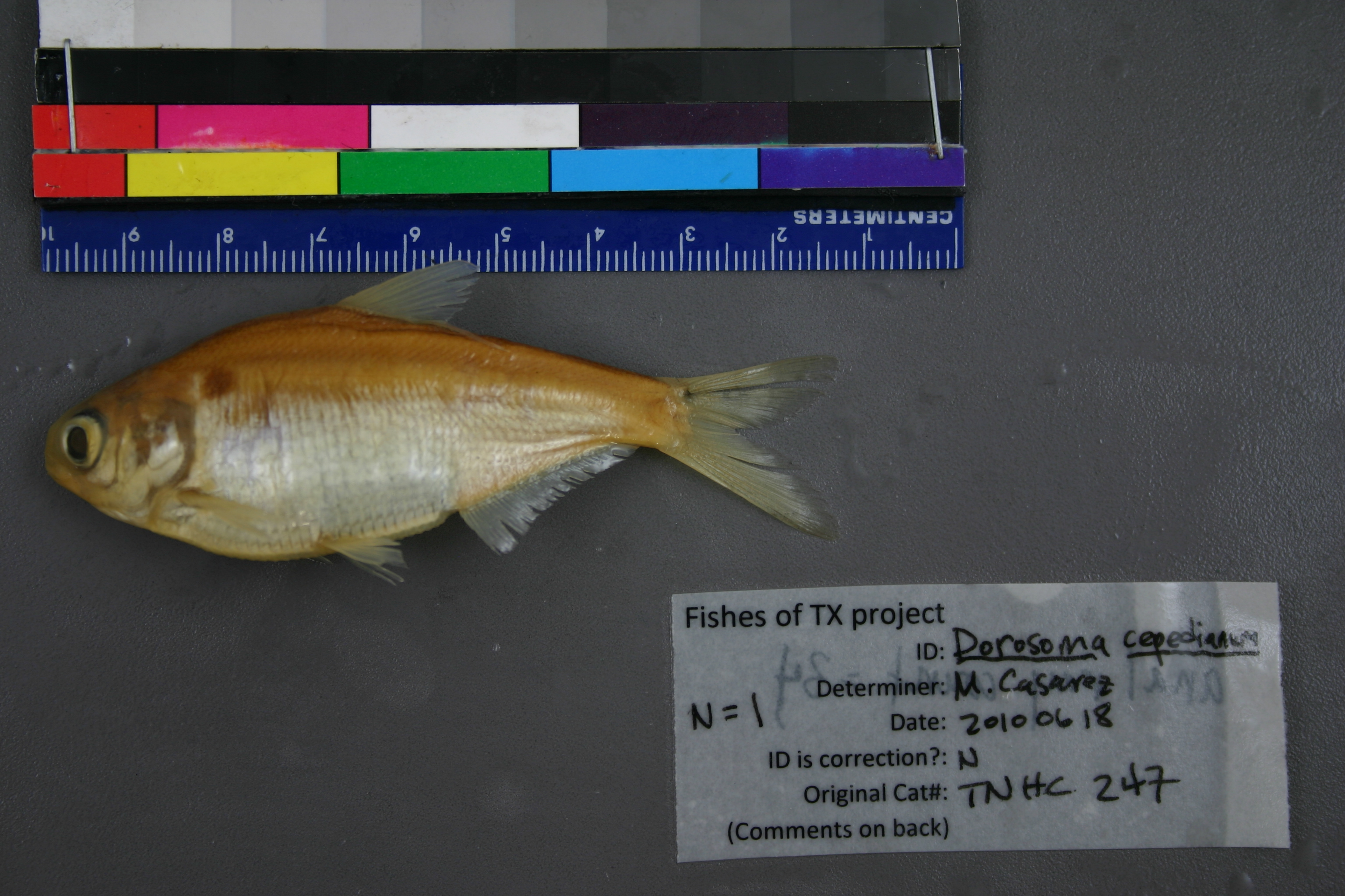 Specimen examined and Id'ed for FoTX project. | ID notes: anal ray count = 34; MinSL(mm): 69.18; MaxSL(mm): ; Jar: 8 oz; Specimen condition: good, but small opening near pelvic fins; Mutations: none; Count Male: ; Count female: ; Extern parasites: n