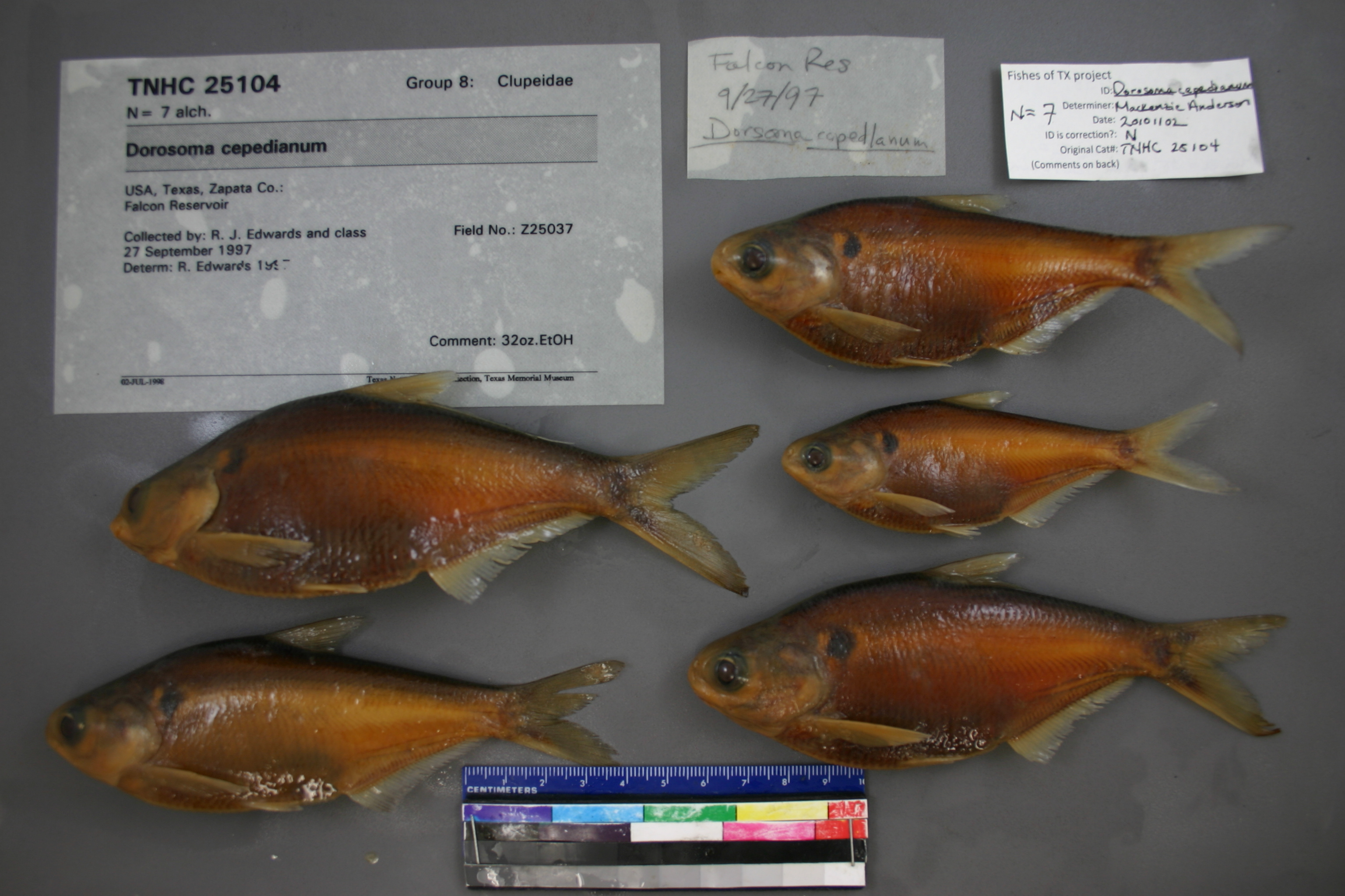 Specimen examined and Id'ed for FoTX project. | ID notes: anal rays: 32-33; MinSL(mm): 85.93; MaxSL(mm): 122.76; Jar: quart; Specimen condition: good; Mutations: none; Count Male: ; Count female: ; Extern parasites:
