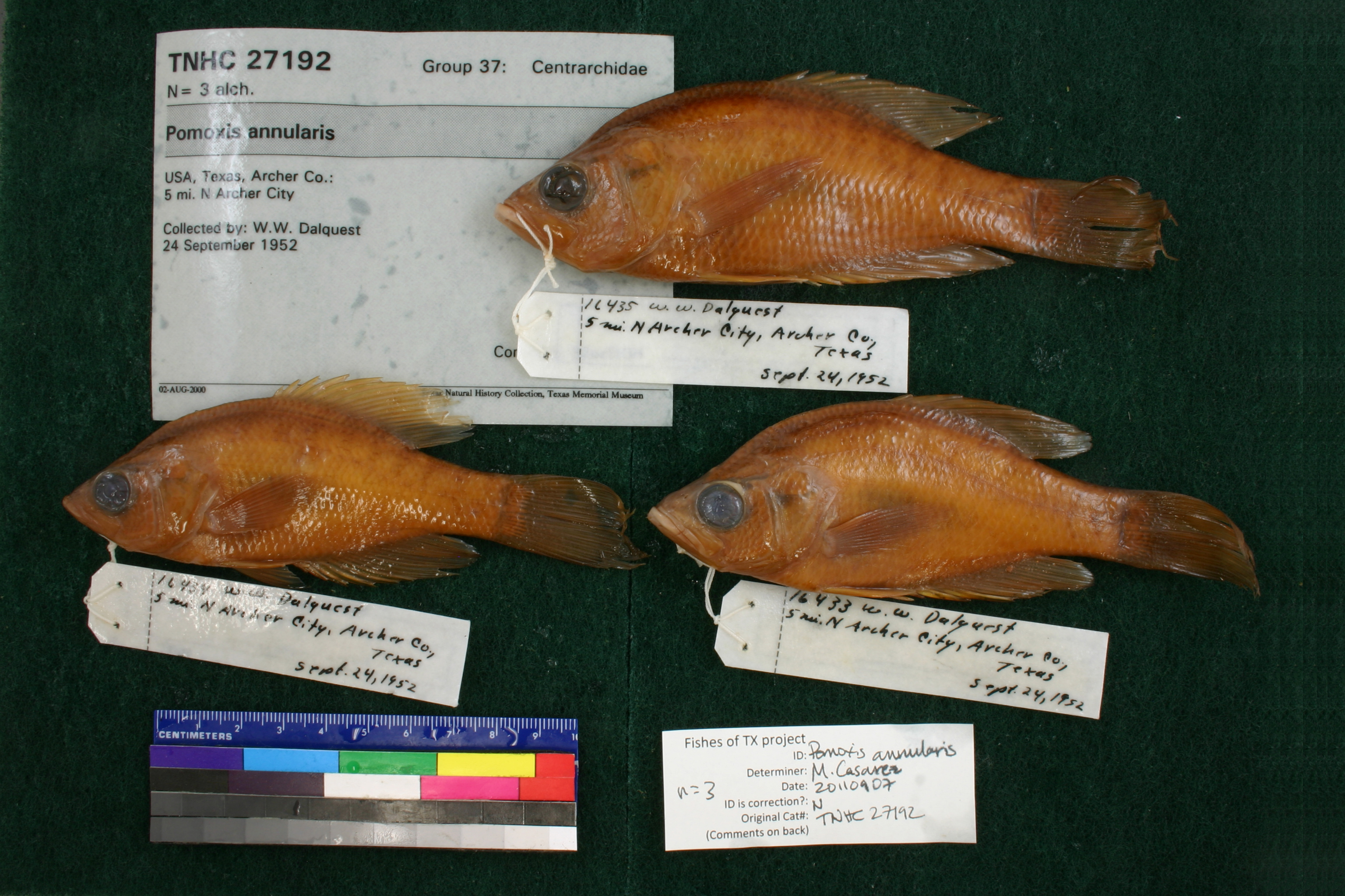 Specimen examined and Id'ed for FoTX project. | ID notes: dorsal spines: 6,7; although one specimen has 7 count, still calling annularis due to other features (ex: distance of dorsal fin base vs. posterior of eye to dorsal fin); MinSL(mm): 101.15; MaxSL(mm): 124.16; Jar: 32 oz; Specimen condition: good; Mutations: none; Count Male: ; Count female: ; Extern parasites: n