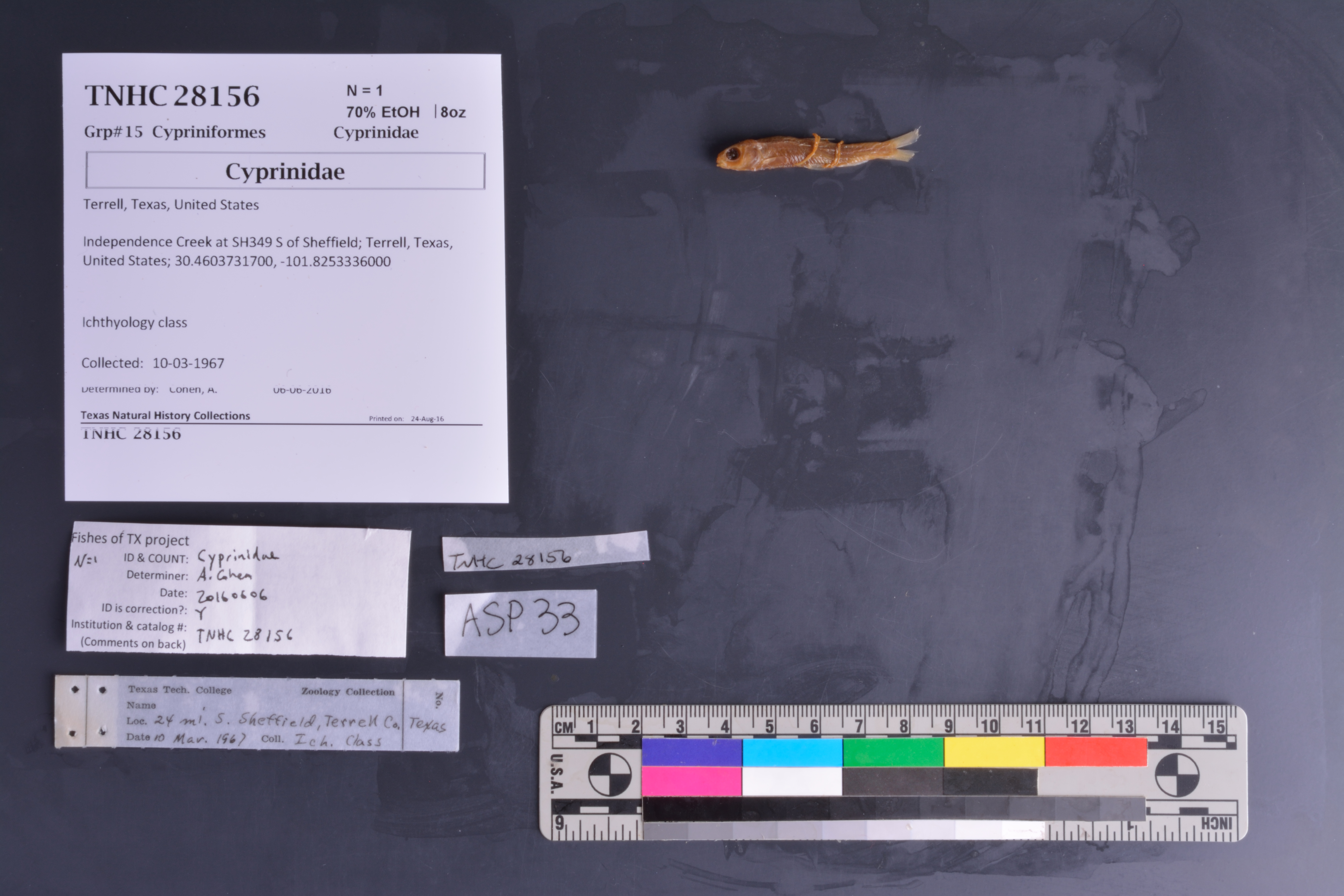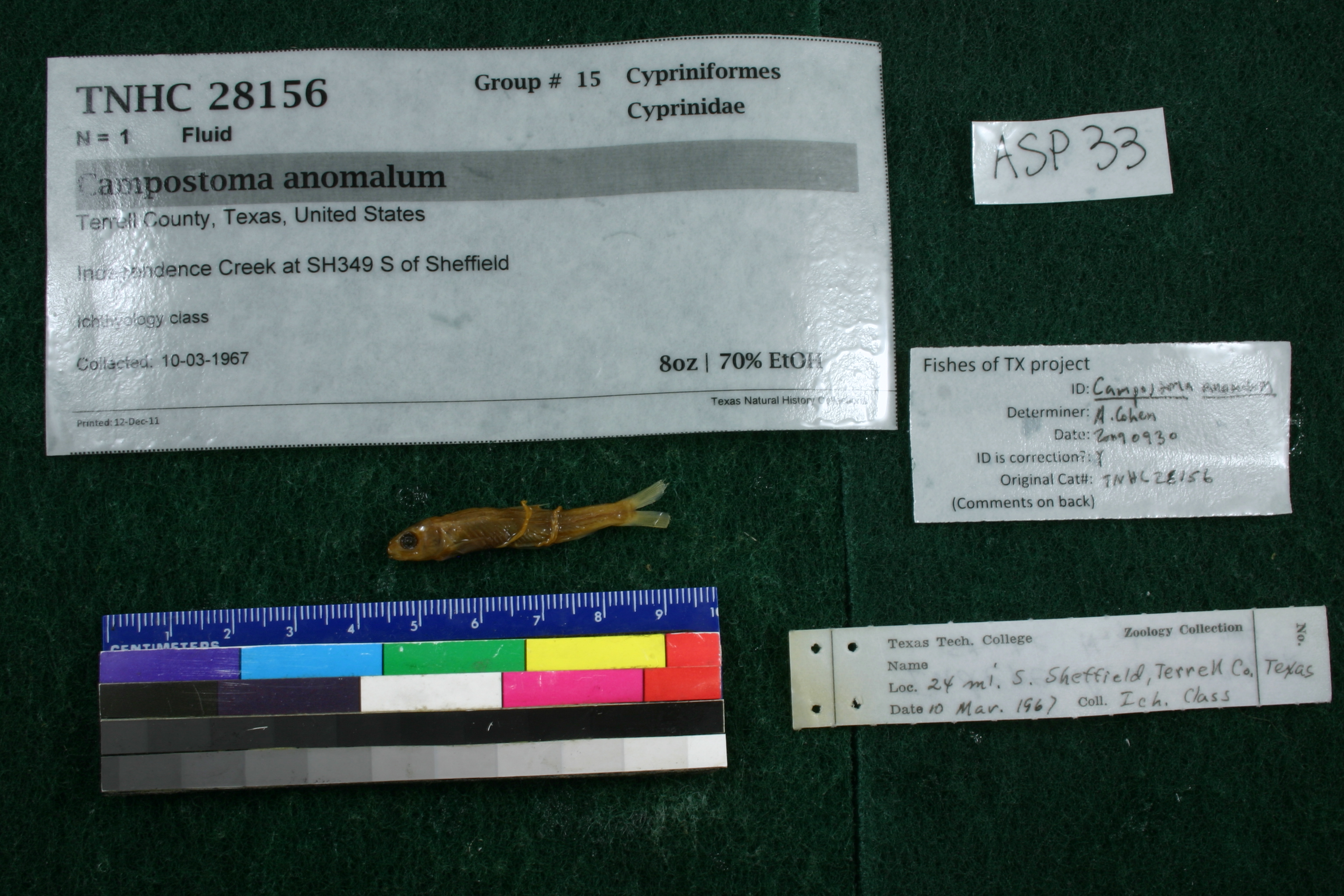 ID complete | probably Dionda argentosa or Campostoma anomalum but is dried and difficult to see needed; Roy Kleinsasser concurs with ID (Aug 30, 2016) and adds 'Poor condition. More likely Dionda argentosa than C. anomalum due to: 1) relationship of dorsal and pelvic fins, 2) lack of apparent cartilage ridge and 3) frequency of occurrence of D. argentosa'