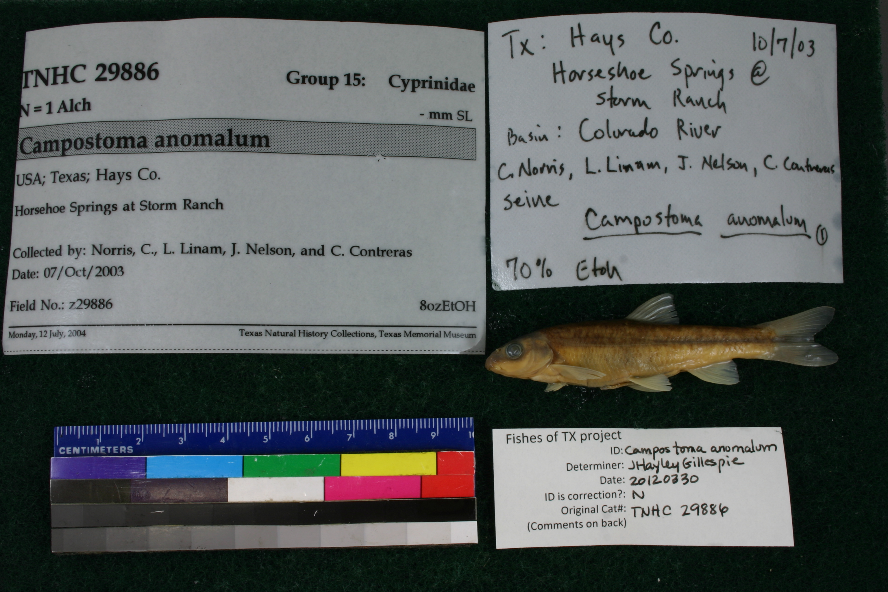 Specimen examined and Id'ed for FoTX project. | ID notes: cartilaginous ridge on lower jaw present, rounded; MinSL(mm): 68.79; MaxSL(mm): ; Jar: 8 oz; Specimen condition: good; Mutations: none; Count Male: ; Count female: ; Extern parasites: n