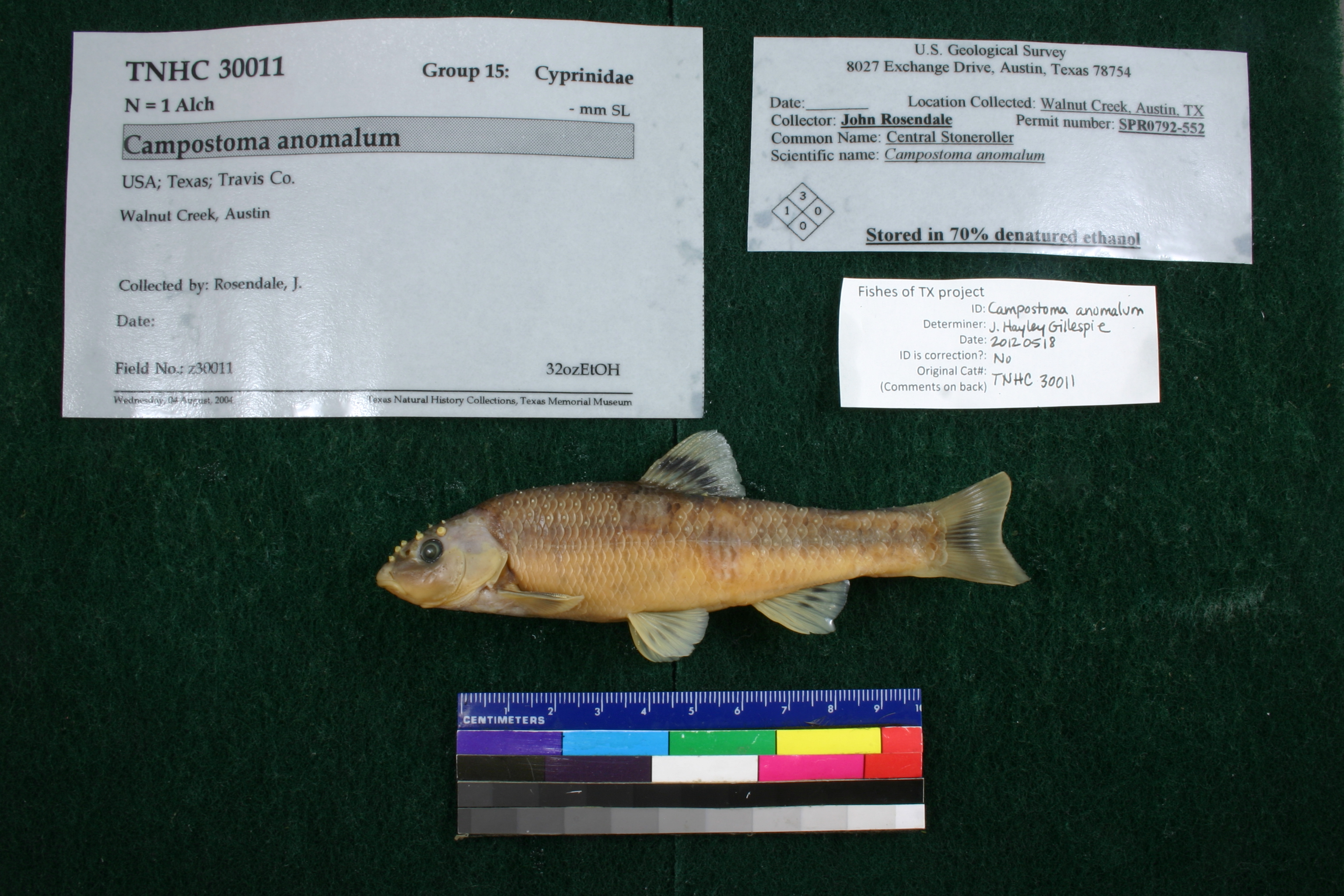 Specimen examined and Id'ed for FoTX project. | ID notes: cartilaginous ridge on lower jaw present - rounded; MinSL(mm): 116.19; MaxSL(mm): ; Jar: 32 oz; Specimen condition: good; Mutations: none; Count Male: 1; Count female: ; Extern parasites: n
