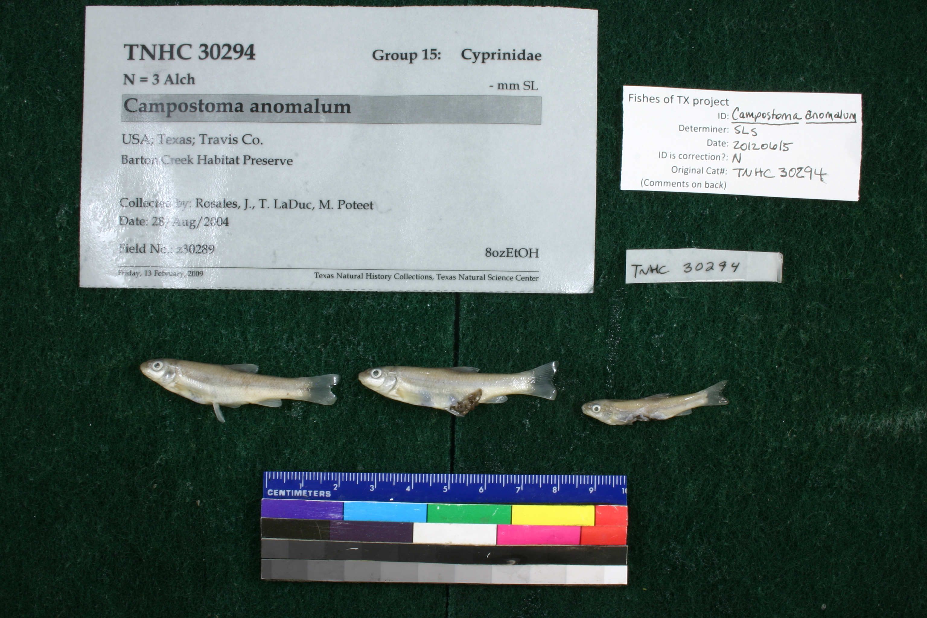 Specimen examined and Id'ed for FoTX project. | ID notes: flat, forward-projecting hard ridge on lower jaw; 2 with intestine ID; MinSL(mm): 33.47; MaxSL(mm): 45.61; Jar: 8 oz; Specimen condition: fair; Mutations: none; Count Male: ; Count female: ; Extern parasites: n