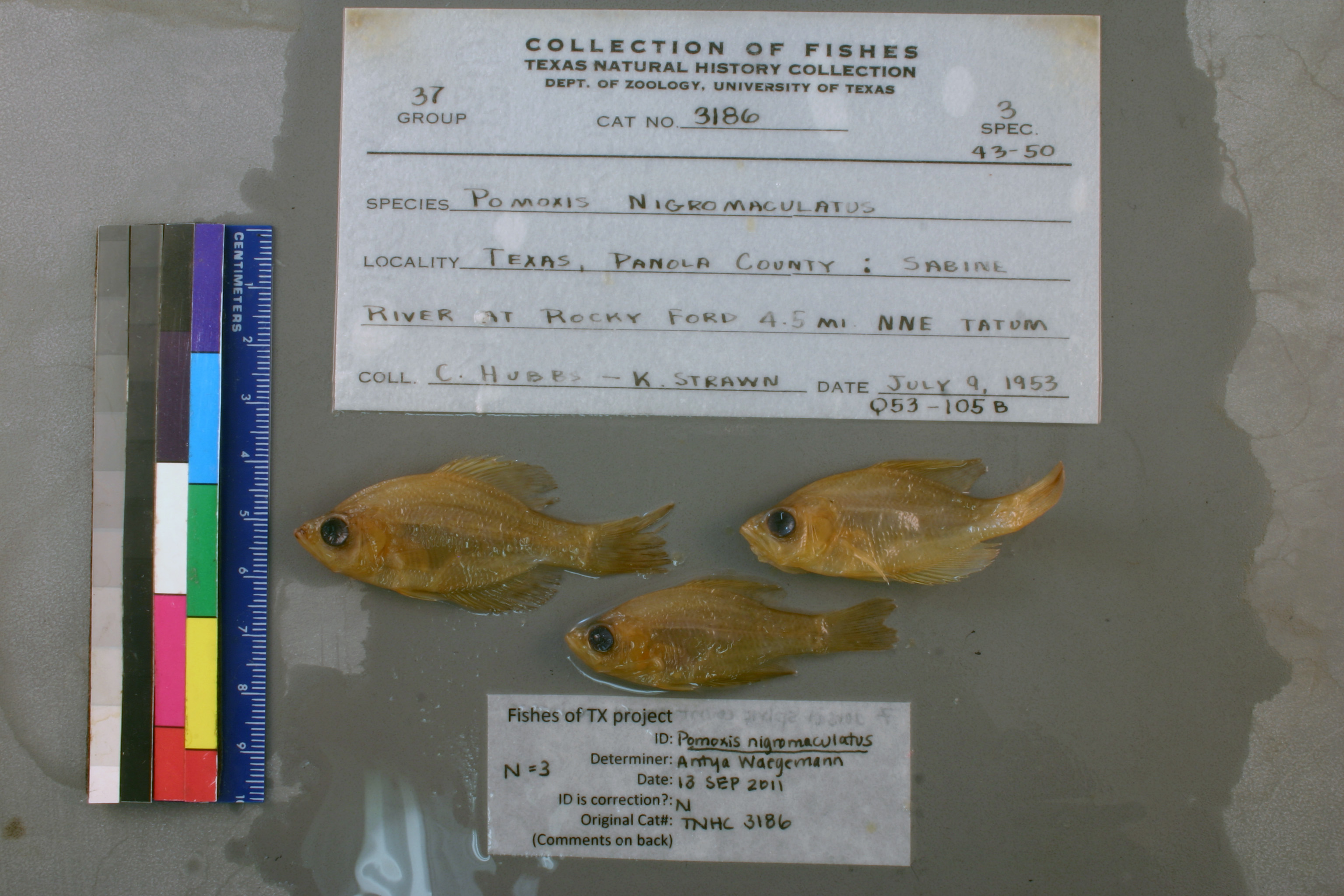 Specimen examined and Id'ed for FoTX project. | ID notes: dorsal spines: 7; MinSL(mm): 40.65; MaxSL(mm): 48.56; Jar: 8 oz; Specimen condition: good; Mutations: none; Count Male: ; Count female: ; Extern parasites: n