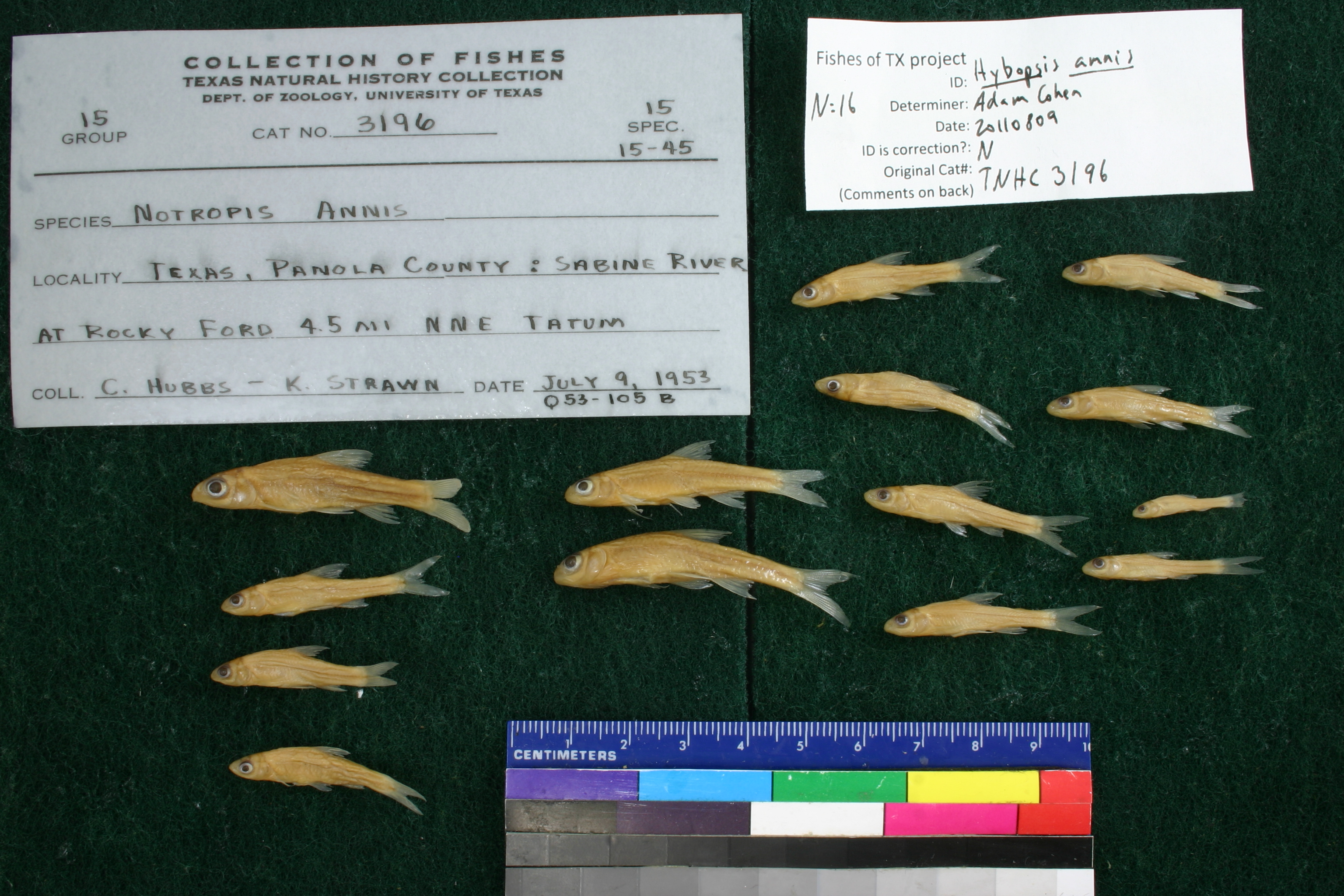 Specimen examined and Id'ed for FoTX project. | ID notes: ; MinSL(mm): 13.23; MaxSL(mm): 42.56; Jar: 8 oz; Specimen condition: good; Mutations: none; Count Male: ; Count female: ; Extern parasites: n