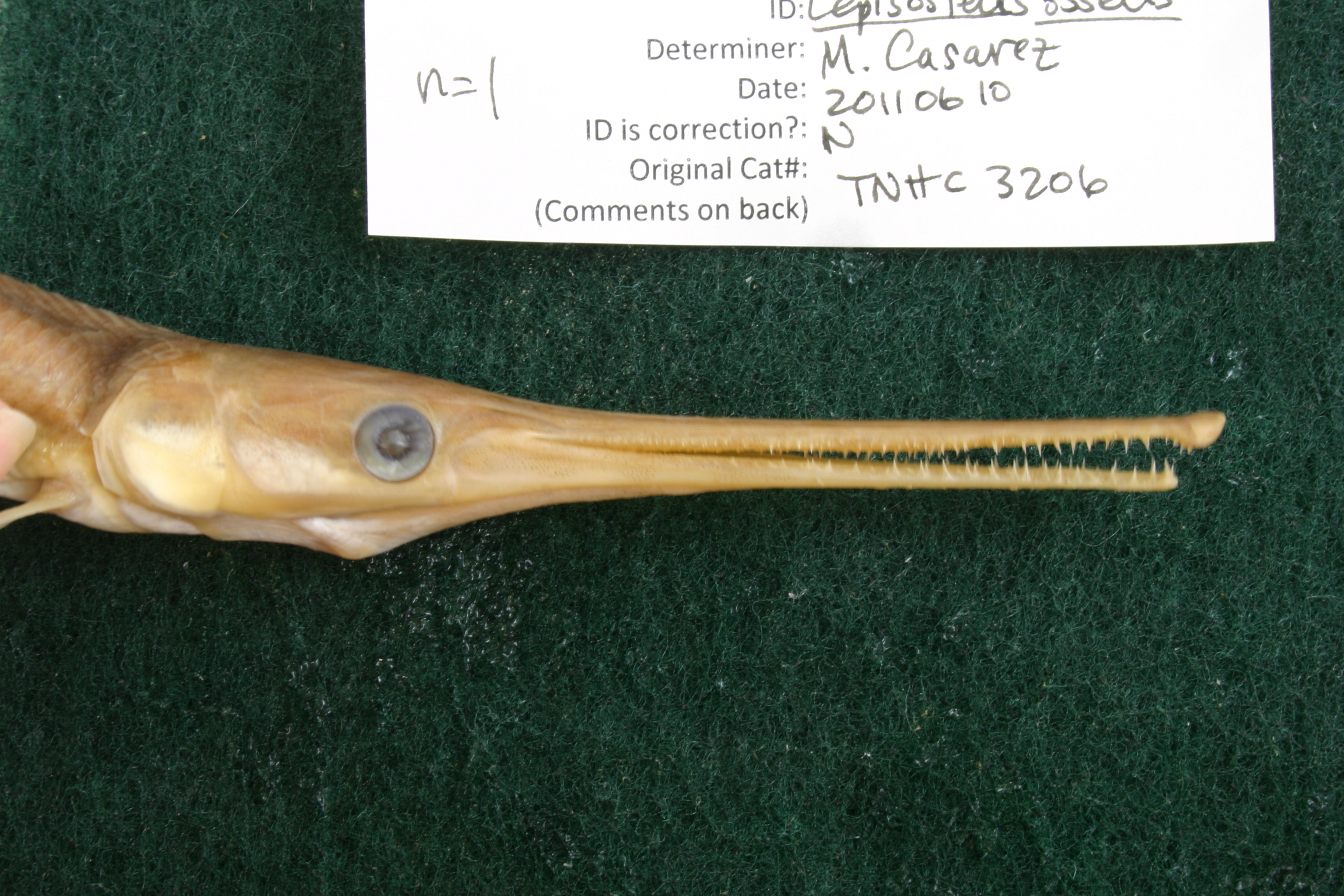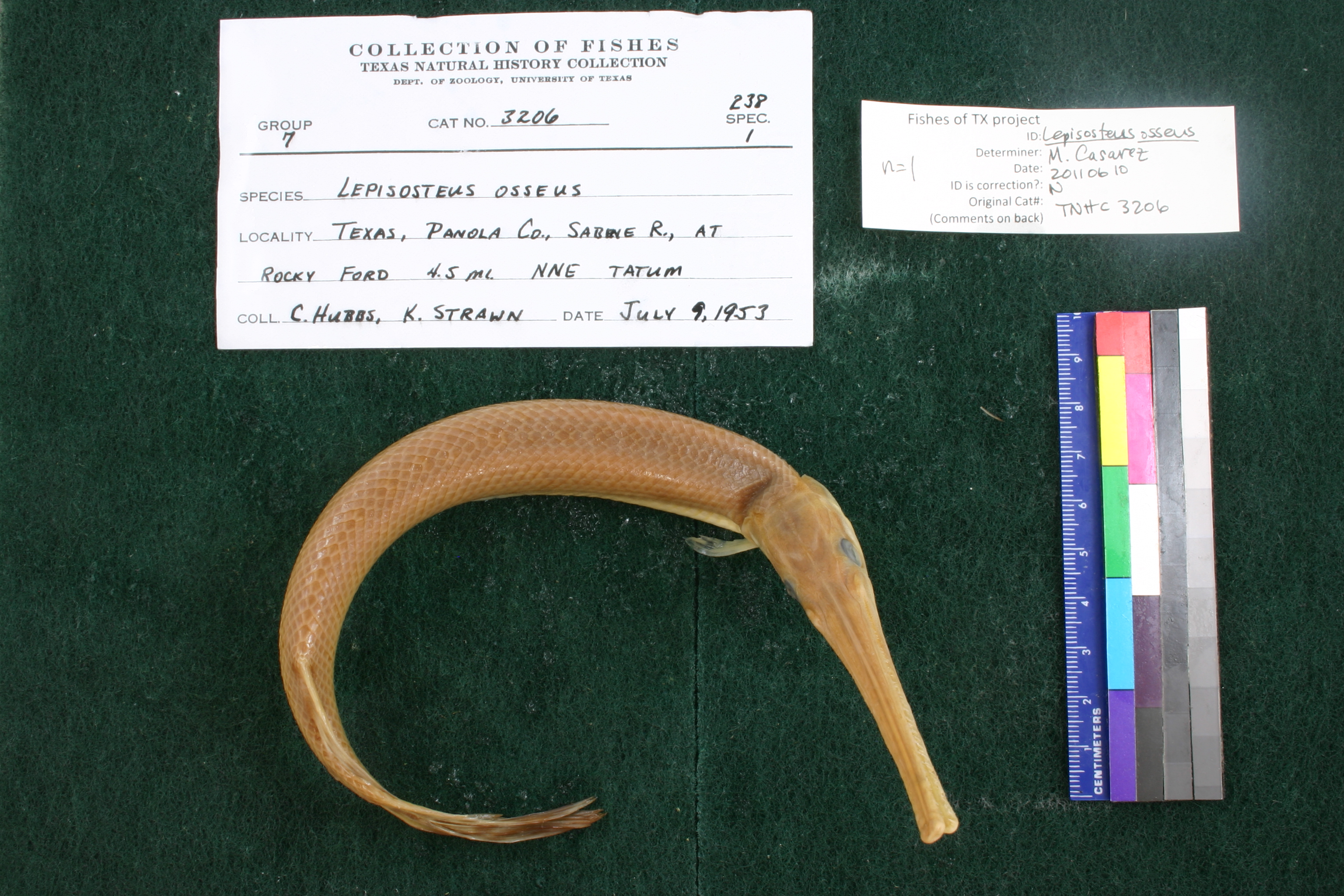 Specimen examined and Id'ed for FoTX project. | ID notes: lateral line scales: 63; *note for SL measurements that gar have heterocercal tails - all length measurements are based on SL and are approximate; MinSL(mm): 269; MaxSL(mm): ; Jar: 32 oz; Specimen condition: good; Mutations: none; Count Male: ; Count female: ; Extern parasites: n