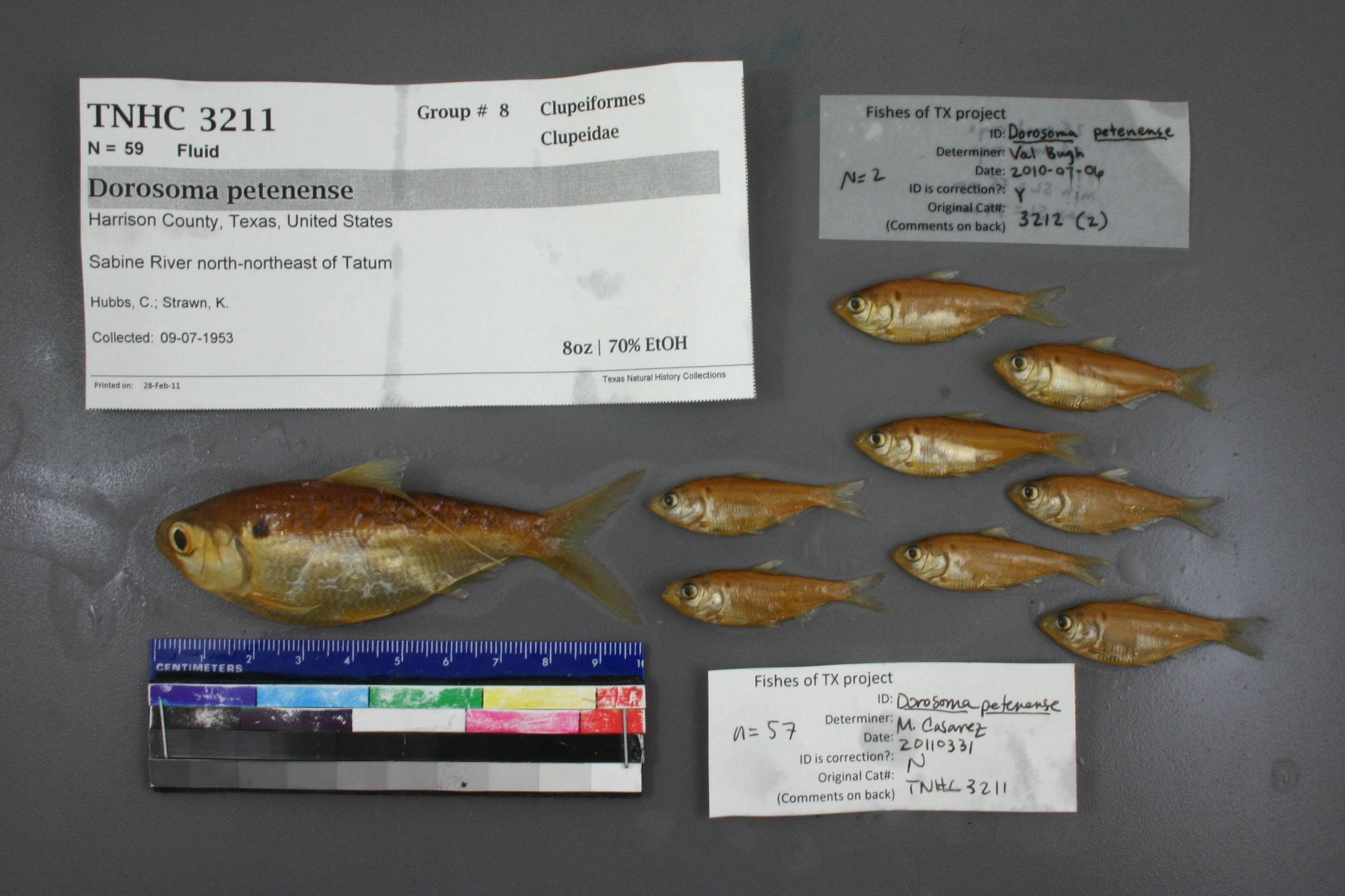 Specimen examined and Id'ed for FoTX project. | ID notes: anal rays: 22,26; MinSL(mm): 29.12; MaxSL(mm): 80; Jar: 8 oz; Specimen condition: good; Mutations: none; Count Male: ; Count female: ; Extern parasites: n