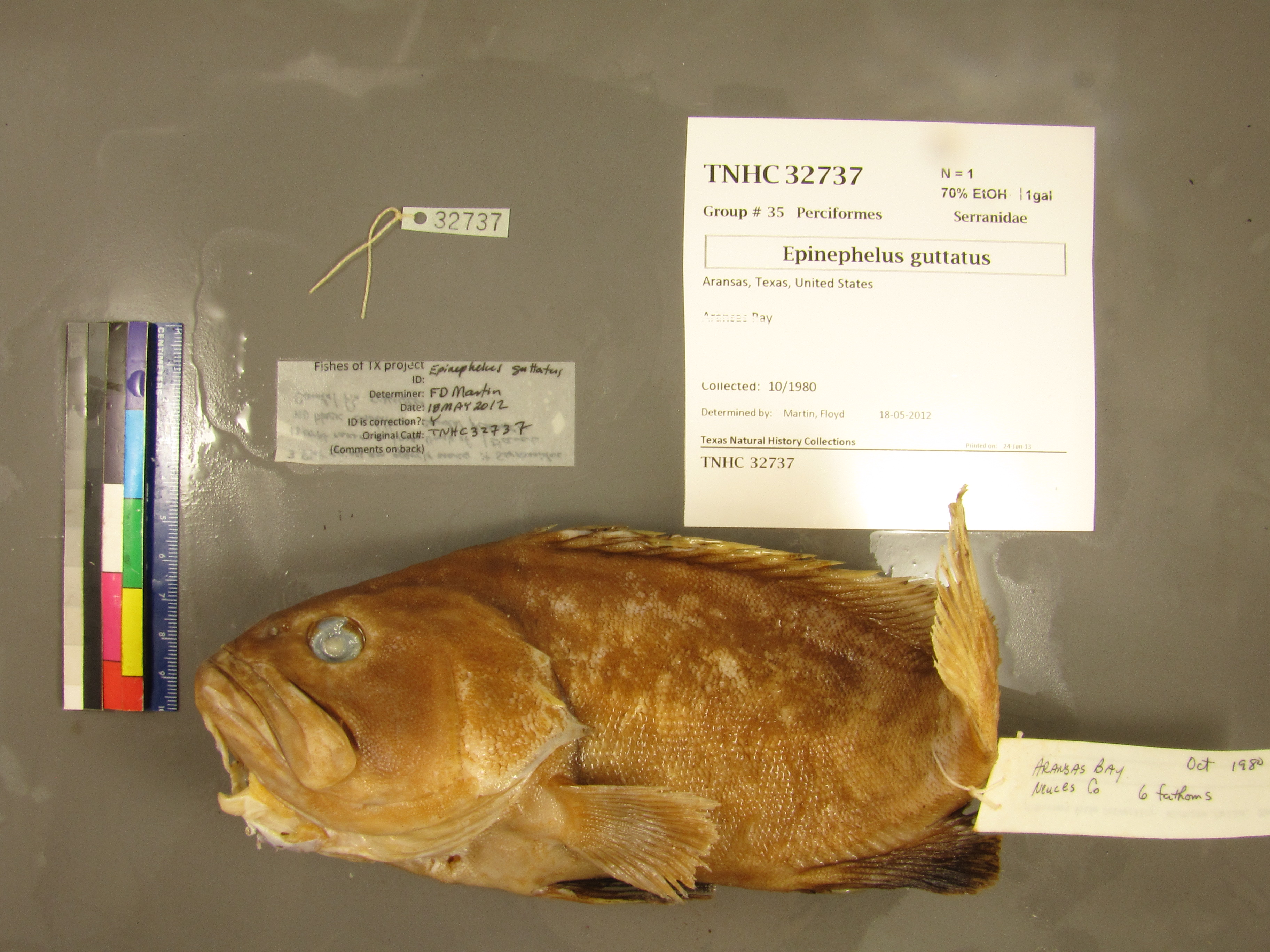 Specimen examined and Id'ed for FoTX project. | ID notes: 3 flat spines on opercle; no black saddle on peduncle; 13 or 14 gill rakers on lower limb of 1st arch; MinSL(mm): curved and hard to measure; MaxSL(mm): ; Jar: gallon; Specimen condition: good; Mutations: none; Count Male: ; Count female: ; Extern parasites: n