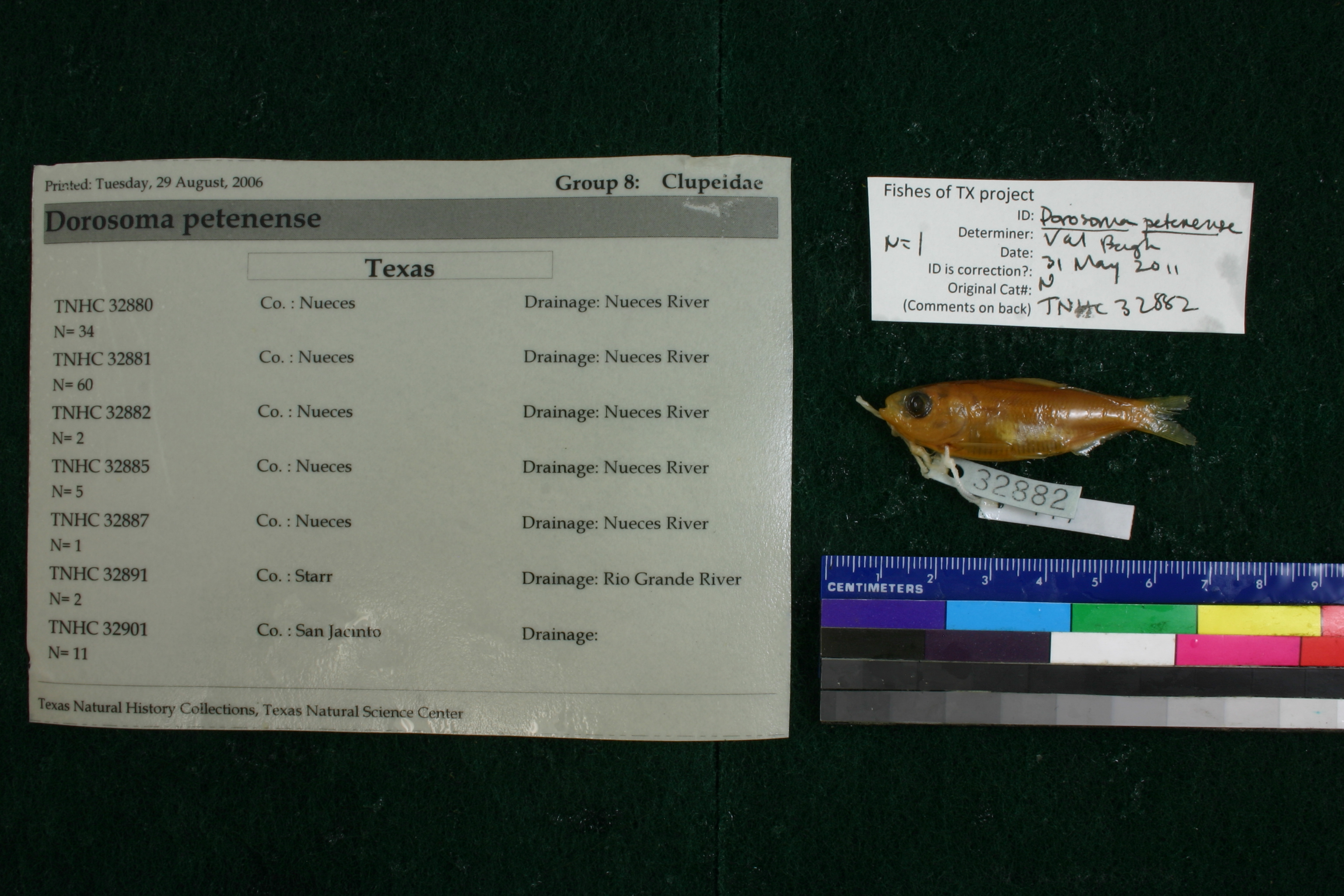 Specimen examined and Id'ed for FoTX project. | ID notes: anal rays: 21; MinSL(mm): 47.66; MaxSL(mm): ; Jar: 32 oz; Specimen condition: good; Mutations: none; Count Male: ; Count female: ; Extern parasites: n