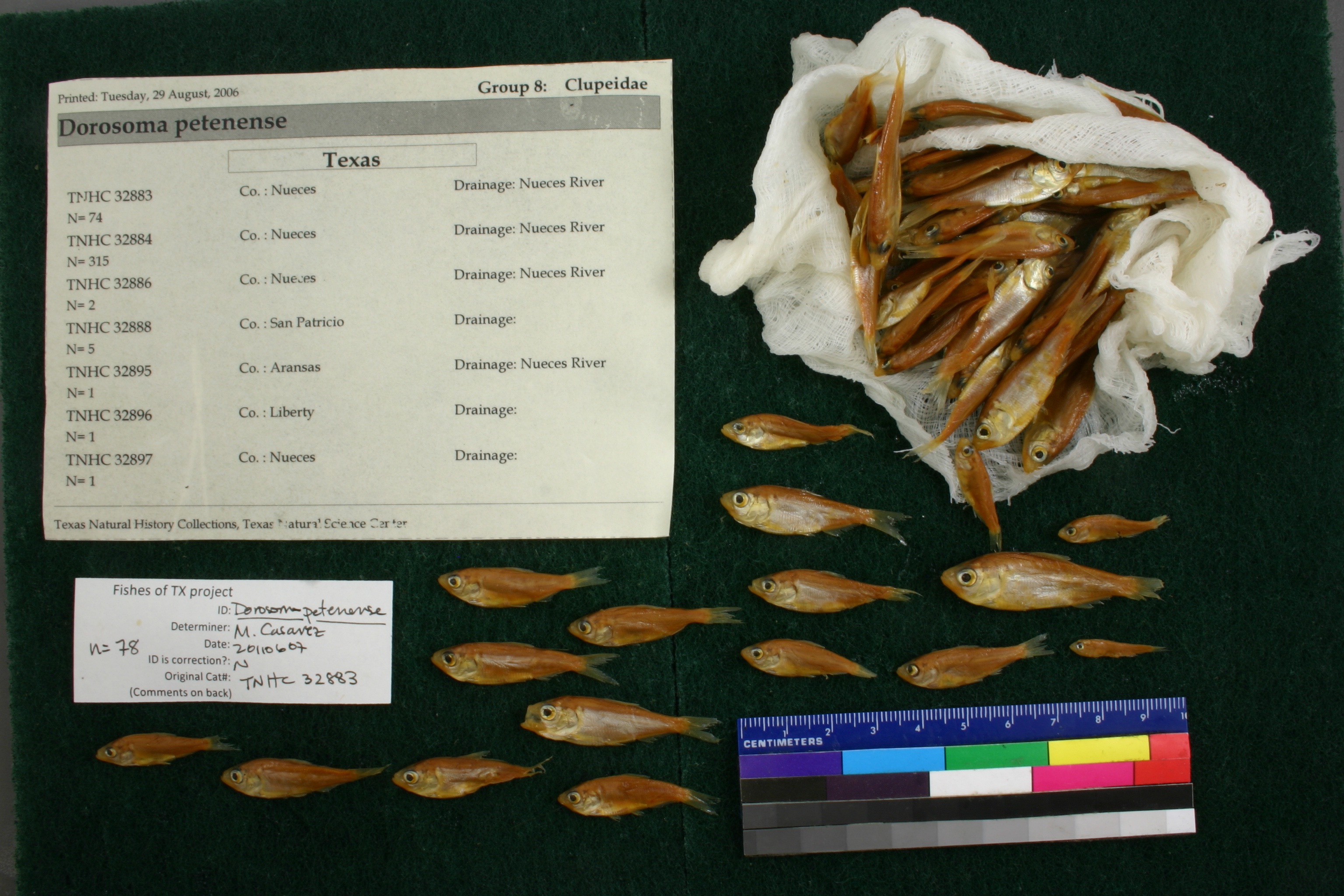 Specimen examined and Id'ed for FoTX project. | ID notes: anal rays: 21,23; jar label reads n=74, but count is n=78; MinSL(mm): 17.69; MaxSL(mm): 41.17; Jar: 32 oz; Specimen condition: good; Mutations: none; Count Male: ; Count female: ; Extern parasites: n