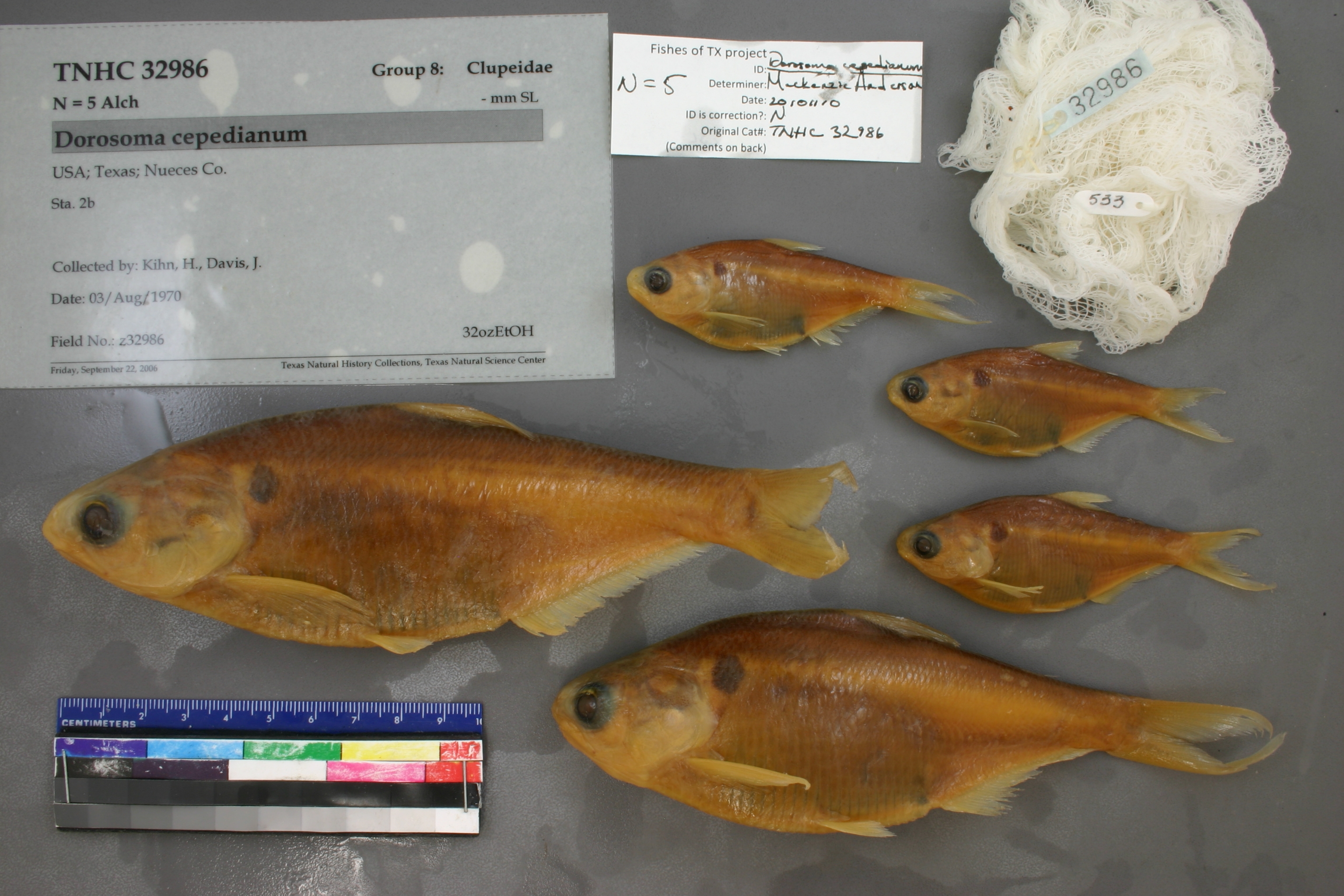 Specimen examined and Id'ed for FoTX project. | ID notes: anal rays: 31, 32; MinSL(mm): 66.12; MaxSL(mm): 158.5; Jar: quart; Specimen condition: good; Mutations: none; Count Male: ; Count female: ; Extern parasites: