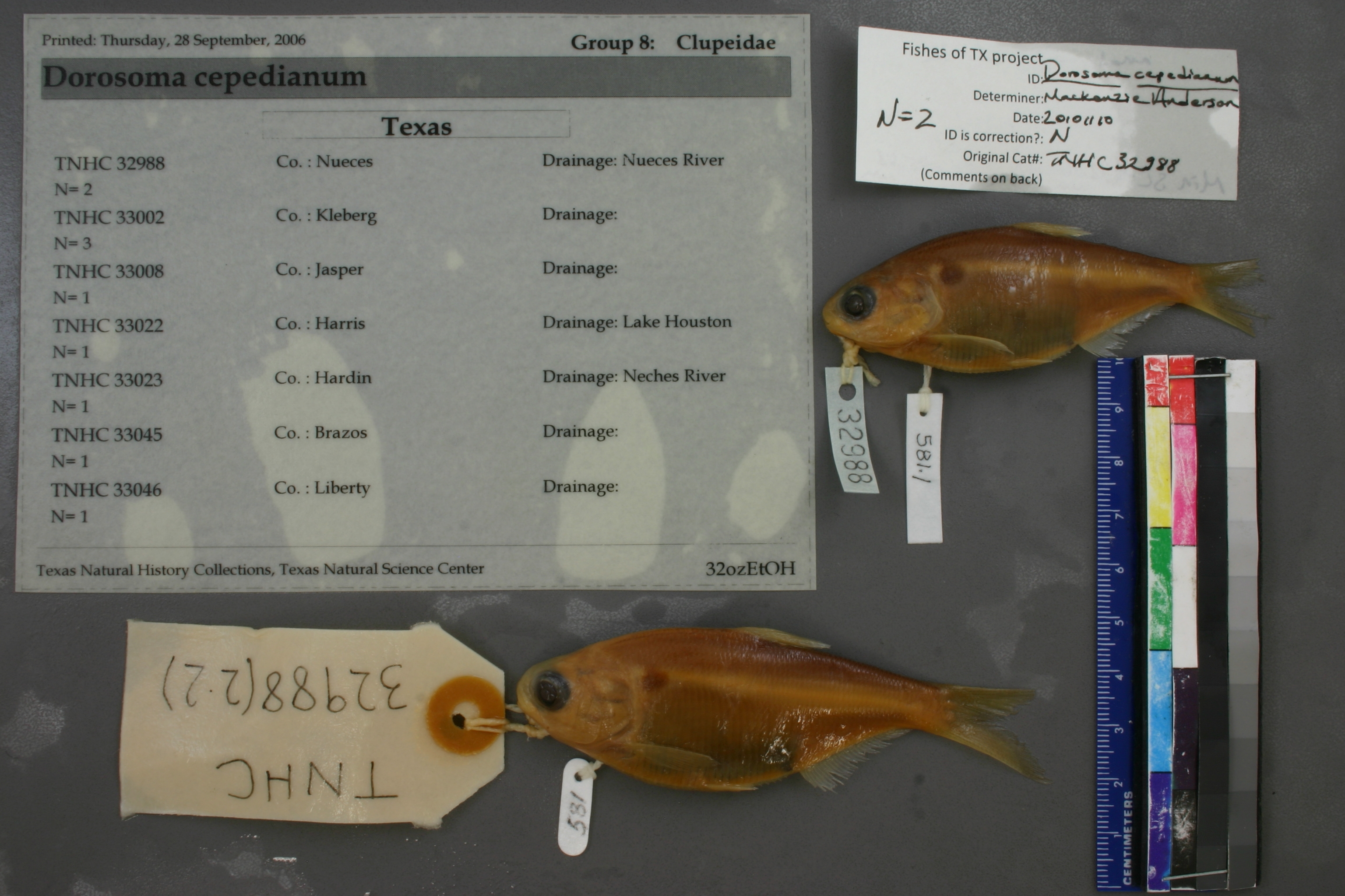 Specimen examined and Id'ed for FoTX project. | ID notes: anal rays: 31-32; MinSL(mm): 72.06; MaxSL(mm): 75.68; Jar: quart; Specimen condition: good; Mutations: none; Count Male: ; Count female: ; Extern parasites: