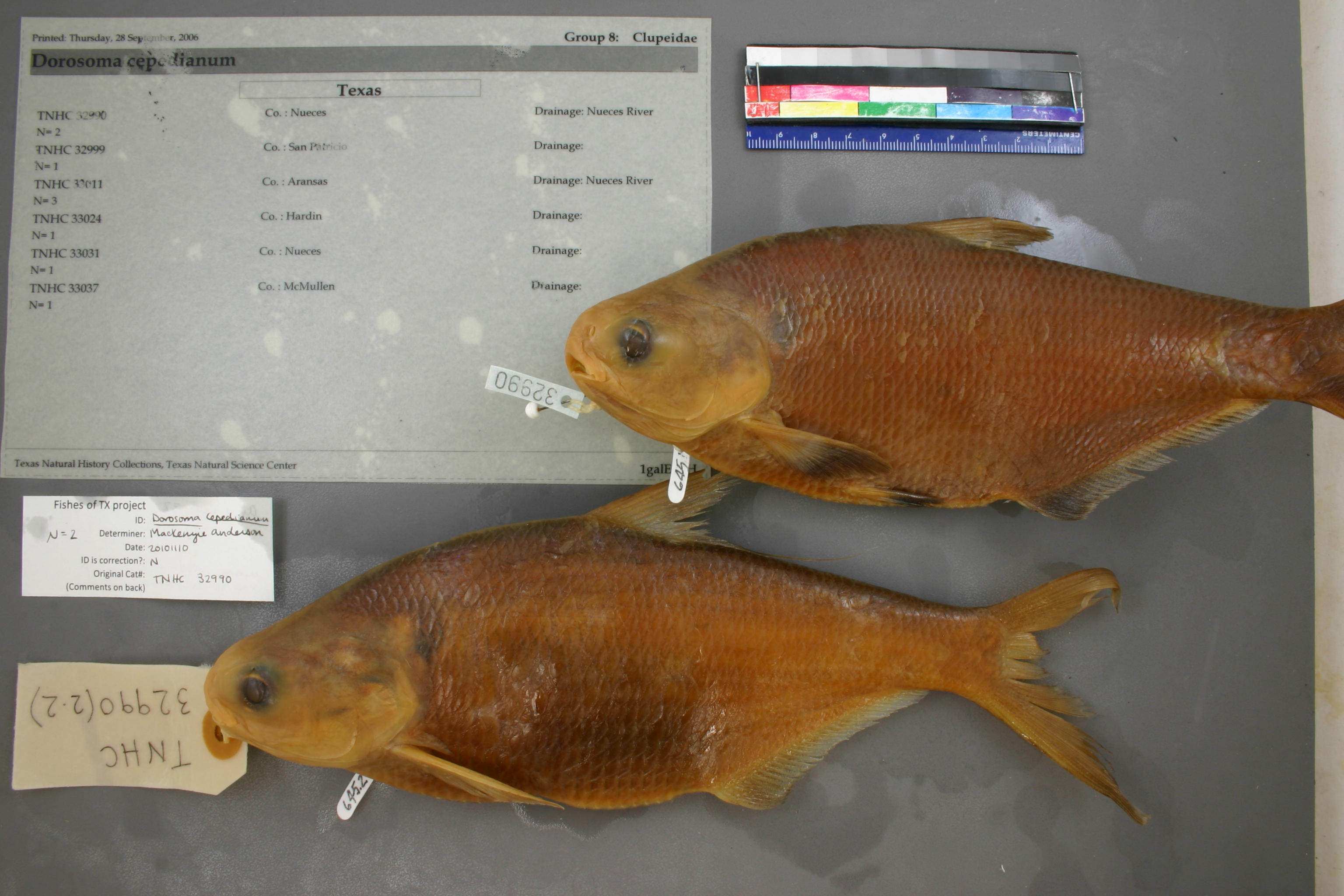 Specimen examined and Id'ed for FoTX project. | ID notes: anal rays: 32; MinSL(mm): 91.2; MaxSL(mm): 206.5; Jar: gallon; Specimen condition: good; Mutations: none; Count Male: ; Count female: ; Extern parasites: