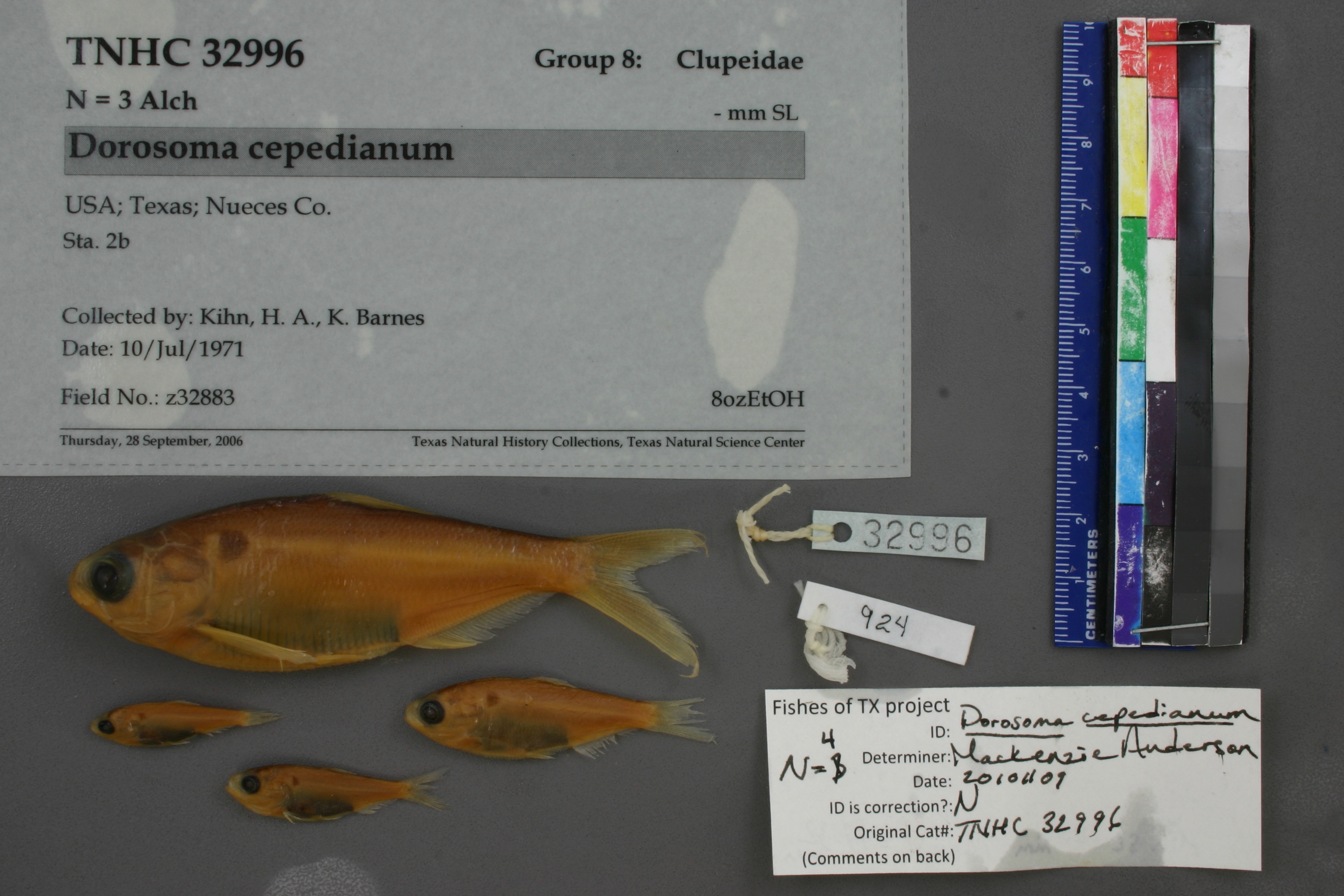 Specimen examined and Id'ed for FoTX project. | ID notes: anal rays: 31, 32; MinSL(mm): 25.31; MaxSL(mm): 79.32; Jar: 8 oz; Specimen condition: good; Mutations: none; Count Male: ; Count female: ; Extern parasites: